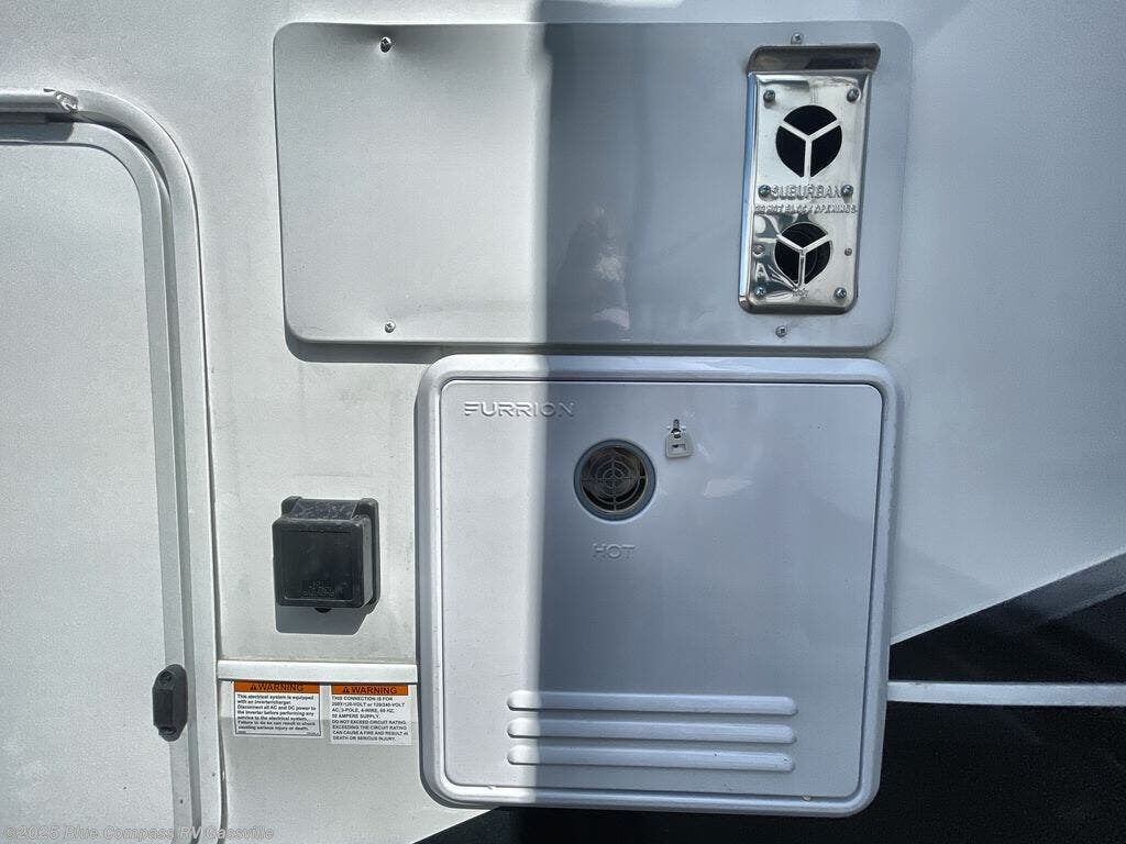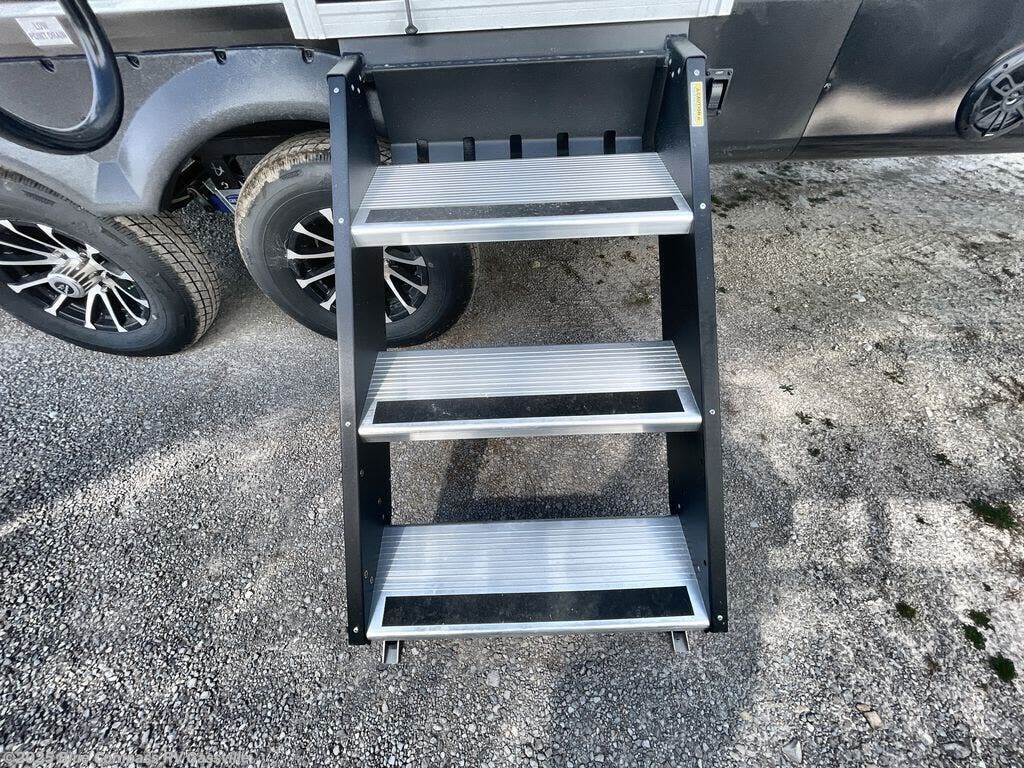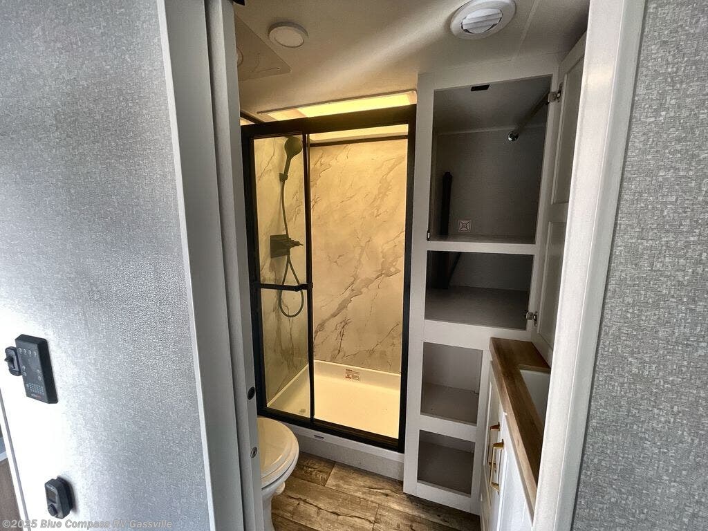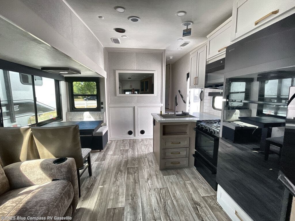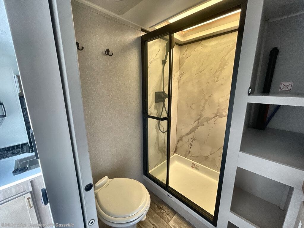 This is the perfect couple's fifth wheel since it features sleeping space for two up front! You can use the dual bedroom wardrobes to store your clothes in, and the full bath is close by so you can get ready each morning. After you've whipped up breakfast in the kitchen, you can dine at the table and chairs with bench seating, then relax with your coffee on the theater seat. There is an entertainment center across from the sofa for convenience, plus a hidden walk-in pantry behind the TV. You might even like to add the fireplace option to make it feel more like home!