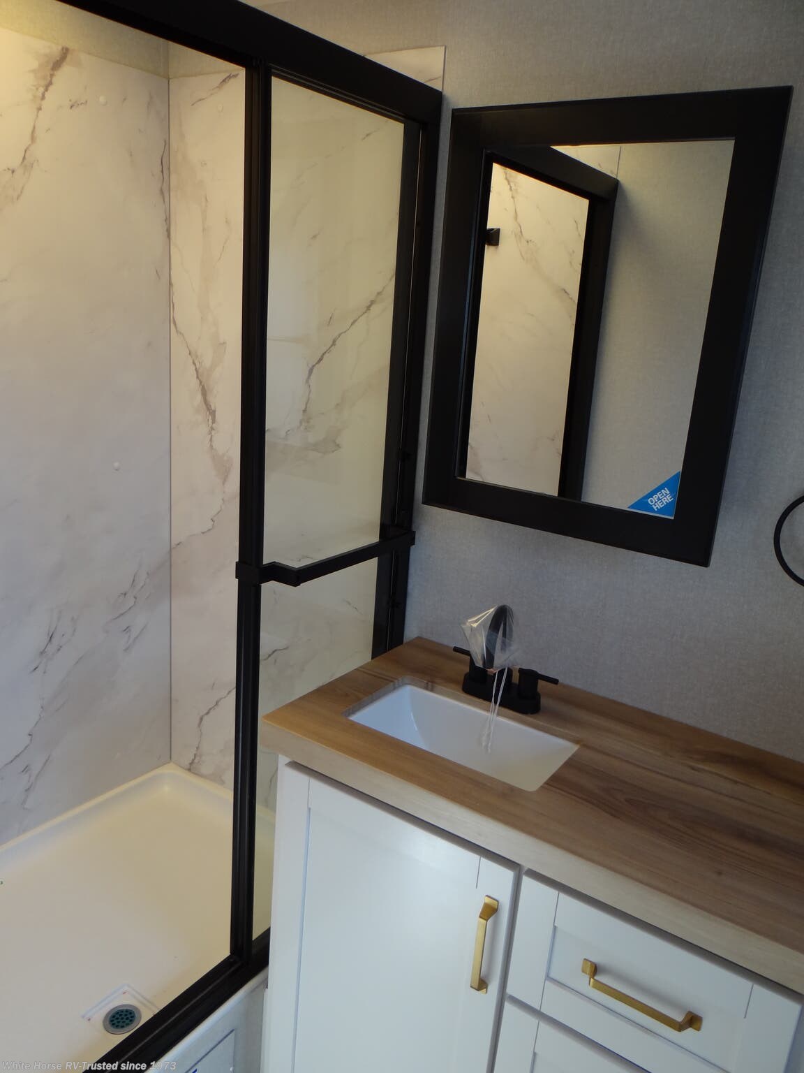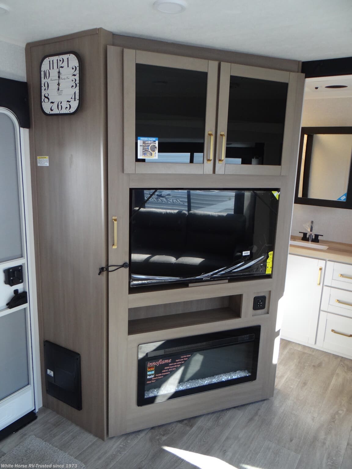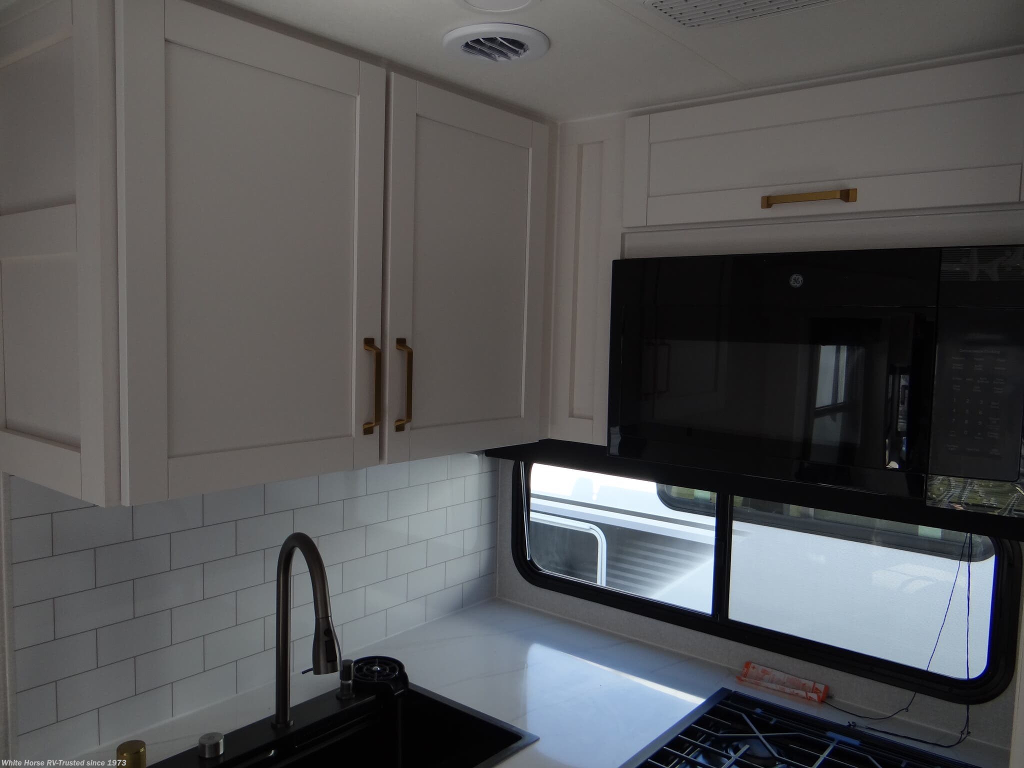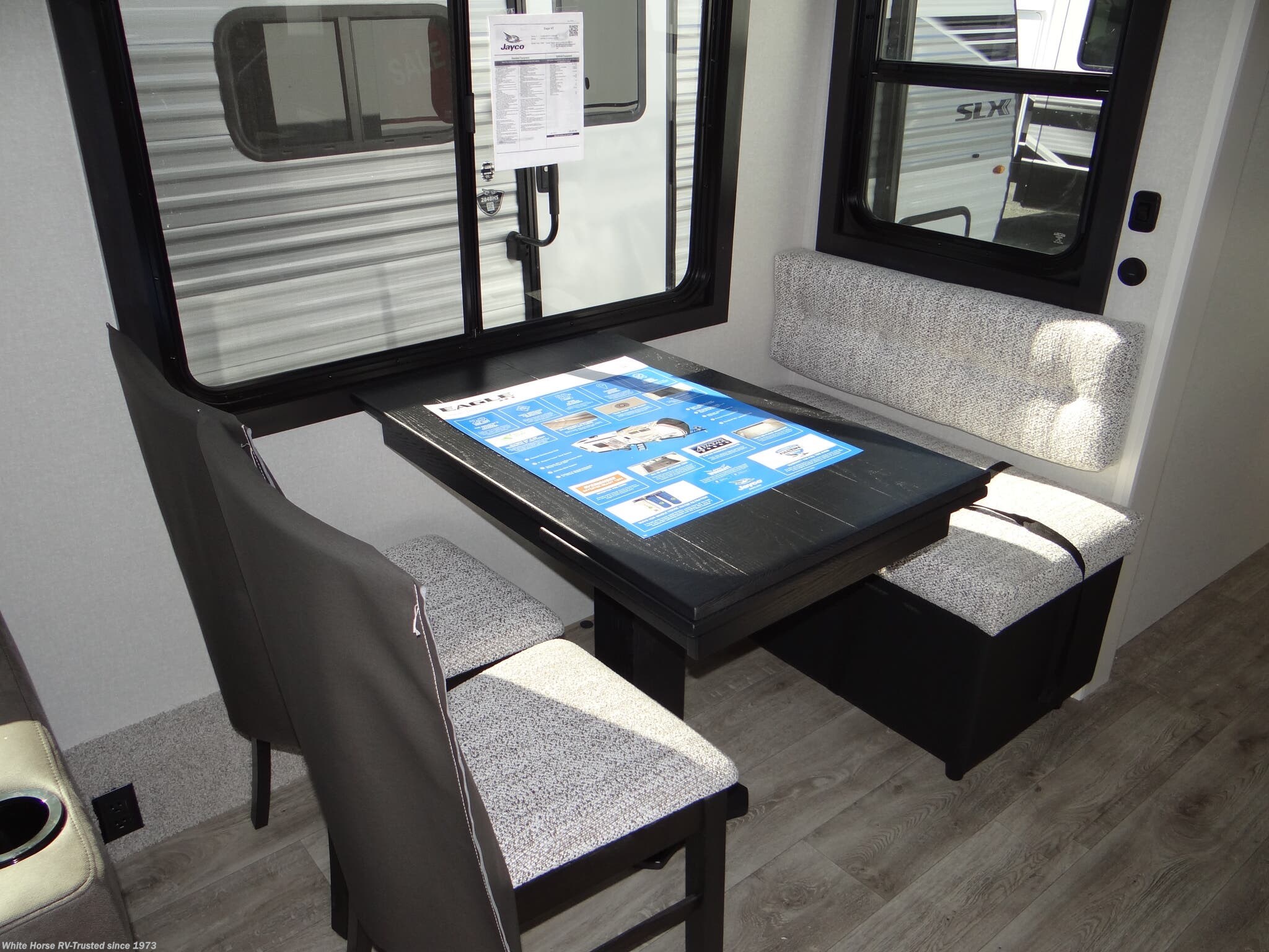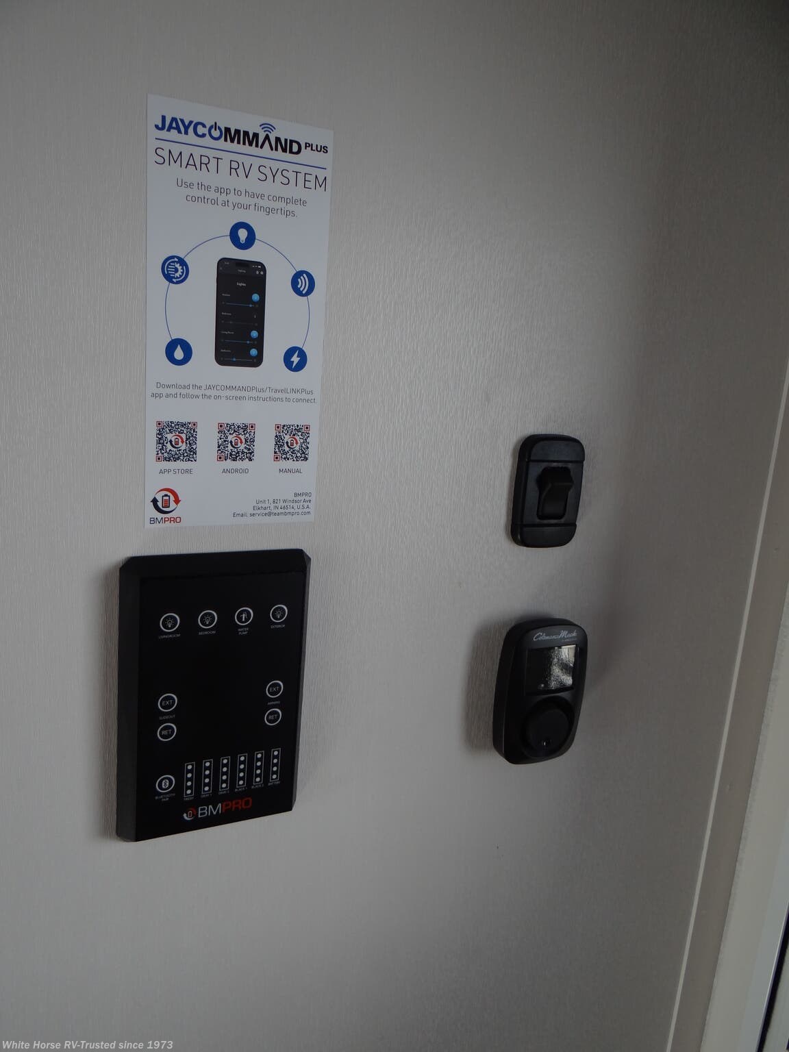 Luxury Package: : Blackout Roller Shades with Reflective Side Throughout, GE Black Glass 10 Cu.Ft. 12V Refrigerator , Jayport 2" Mount for Outside Accessories, Residential Style Glass Shower Door, Washer/Dryer Prep (Select Models), GE 30" OTR Black and Stainless Microwave with Exhaust Fan, GE Black and Stainless 21" Range with Edge to Edge Grates, Inverter Prewire (Multiple Locations), Multi-Function "All In One" Black Stainless Steel Kitchen Sink, Olympic 66"x80" Residential Mattress, Magnetic Catches For All Doors & Drawers, Solid Surface Kitchen Countertop(s), LED Fireplace with 5K BTU Elect Space Heater (Select Models), Jay Command with Monitor Switch Panel, Exterior Light & Outlet at Jayport Location.