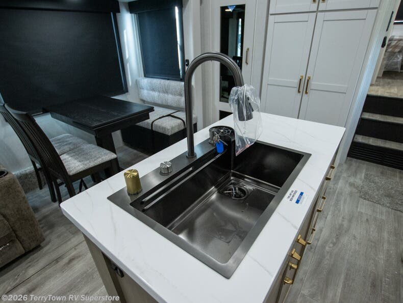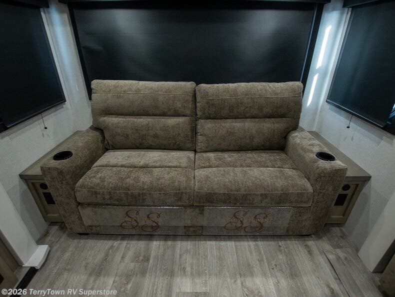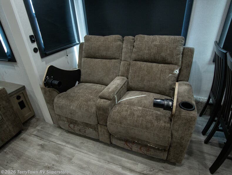 Pack your bags and head off on adventure in this spacious fifth wheel for four! The dual opposing slides in the kitchen and main living area will give your crew more space to relax. Speaking of relaxing, there is a theater seat across from the fireplace and TV plus a tri-fold sofa to make it a movie night. The free-standing table includes two chairs on one side and a bench on the other, and the kitchen island is sure to be appreciated by the chef of your group. There is also a spacious kitchen pantry and an outside kitchen if they'd rather cook outdoors. The front master bedroom includes an Olympic queen bed, dual wardrobes plus a third wardrobe within the bedroom slide out, and TV prep if you want the option to watch a show in bed!