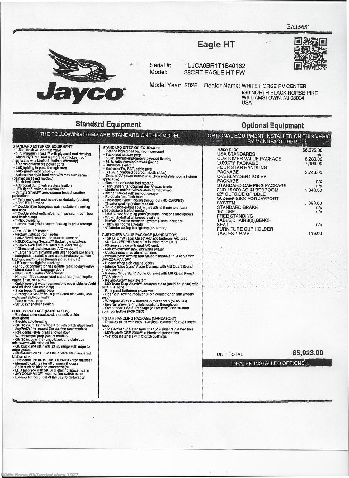 This Stock# EA15651 also has the following factory options included: ... 2nd 15,000 A/C in Bedroom, Furniture Cup Holder Tables-1 pair, 22’ Outside Griddle w/ Deep Sink for Jayport System, & Calli Linen Interior Décor, all backed by Jayco's exclusive 2 + 3-year warranty!! MSRP $85,923.00.