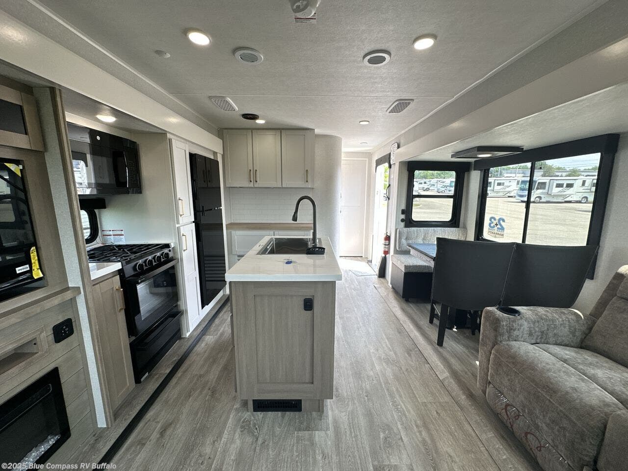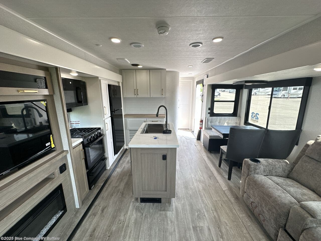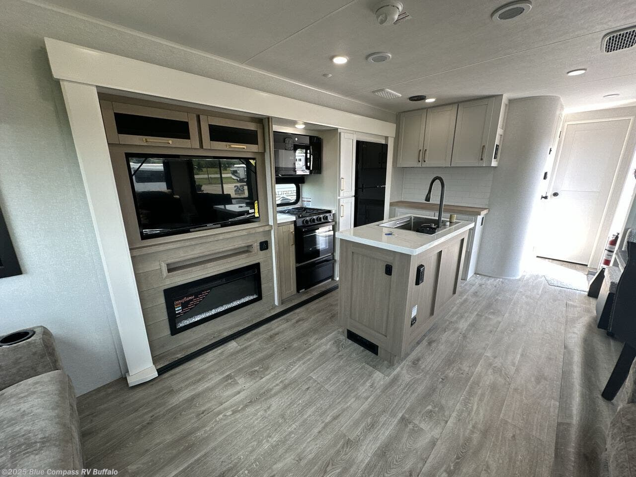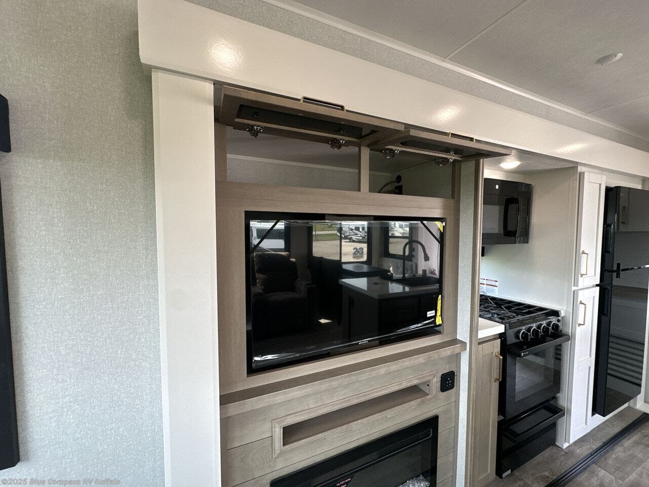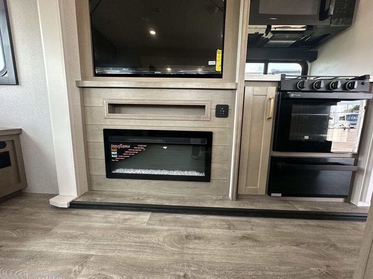 You will feel right at home camping in this travel trailer! It features a front private bedroom with an Olympic queen bed slide for more interior space, a dresser, a front wardrobe to hang your clothes, and a wardrobe that is prepped to add an optional washer and dryer. Start each morning getting squeaky clean in the full bathroom with the shower and then head to the kitchen to fry up some eggs on the stainless steel range. The kitchen island with a multi-functional sink will help make meal prepping easier too, plus there is a hutch to store your dishes. Enjoy a relaxing evening by the fireplace and watch your favorite movie with the entertainment center while sitting on either the rear tri-fold sofa or the theater seating!