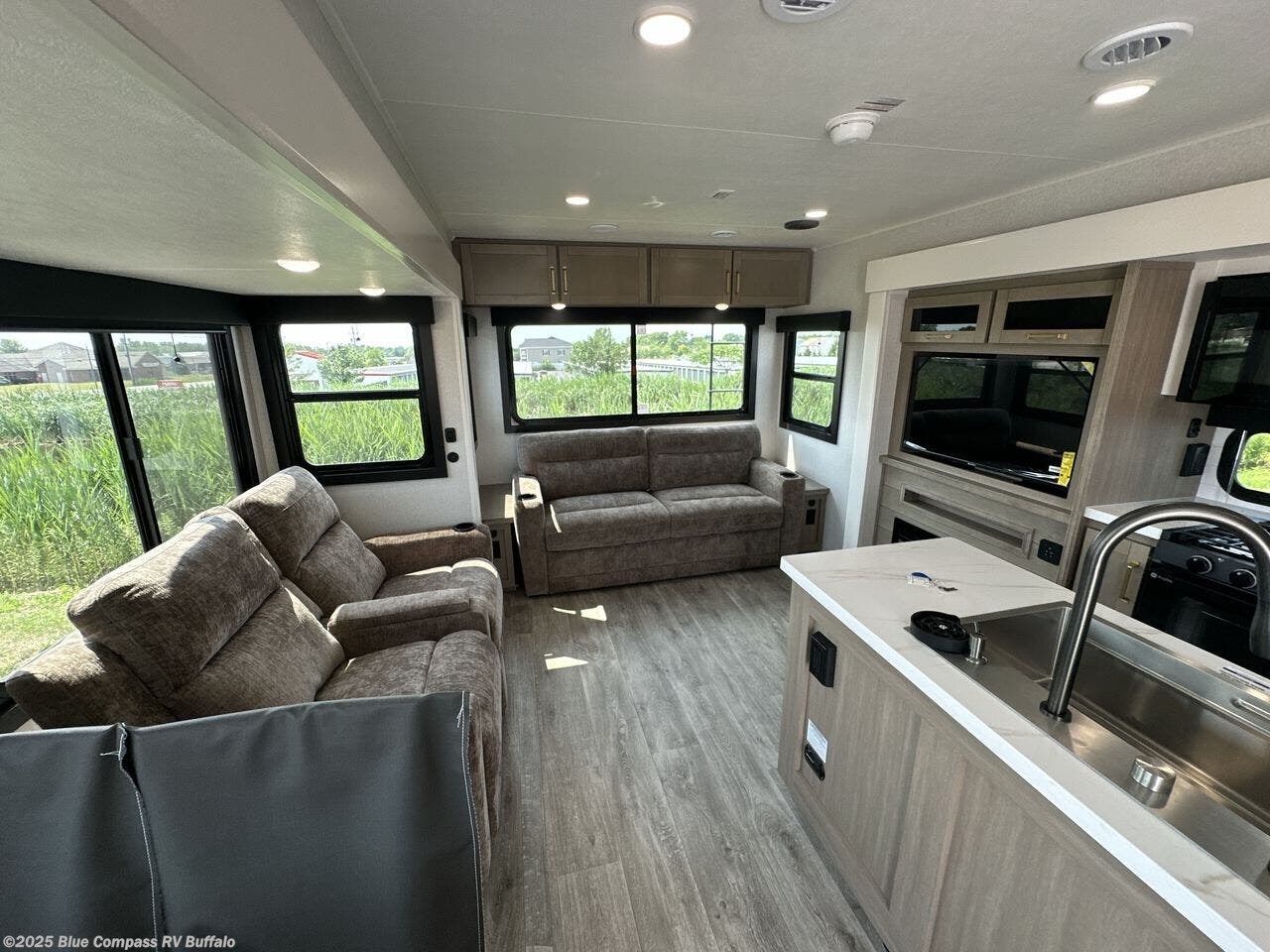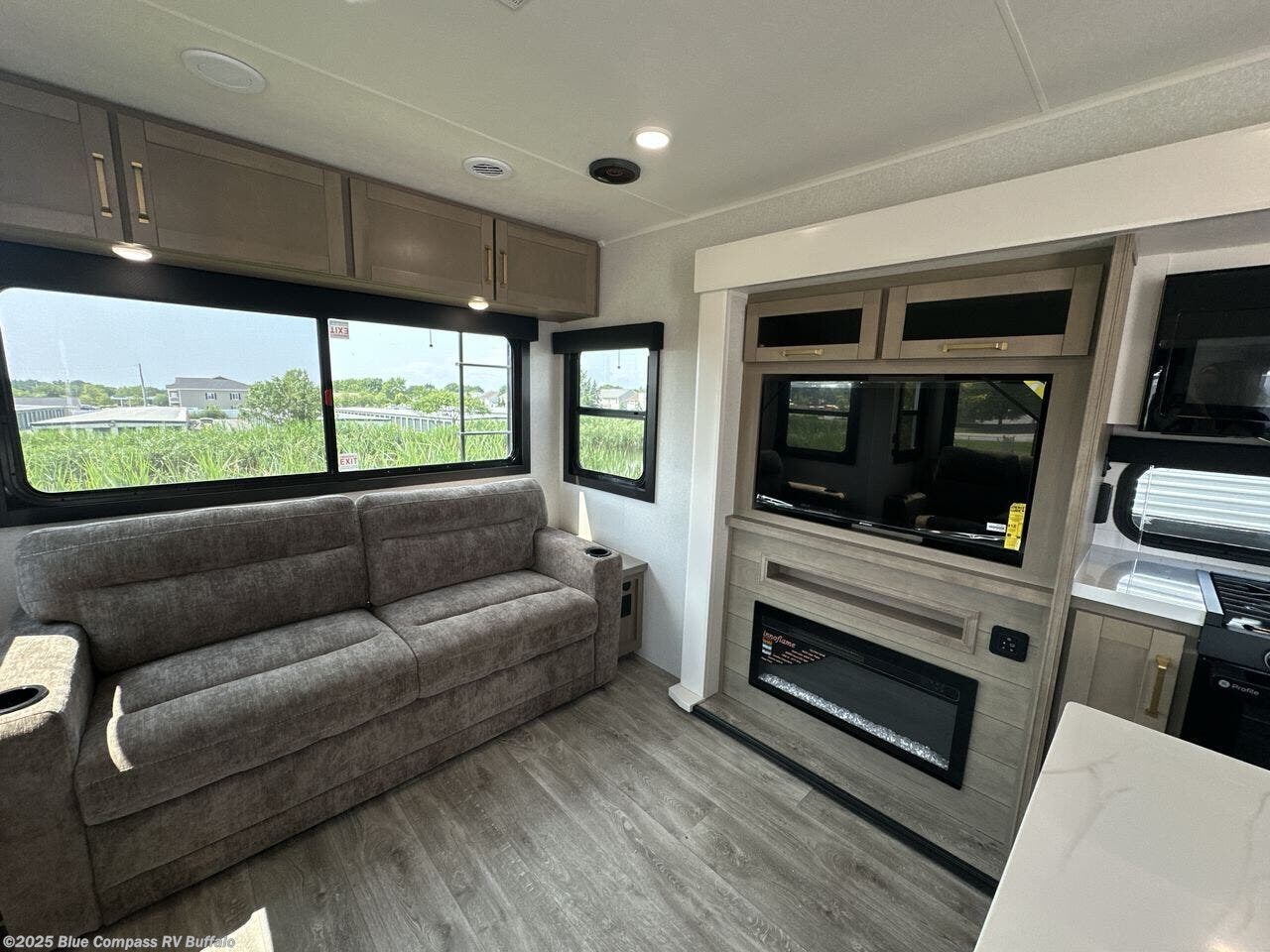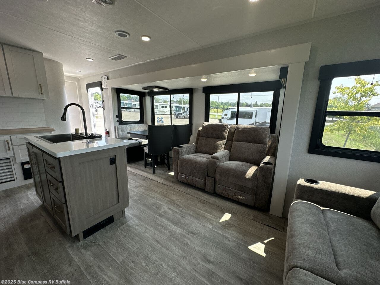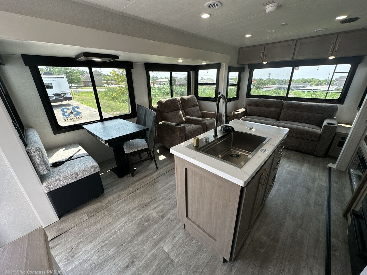 You will feel right at home camping in this travel trailer! It features a front private bedroom with an Olympic queen bed slide for more interior space, a dresser, a front wardrobe to hang your clothes, and a wardrobe that is prepped to add an optional washer and dryer. Start each morning getting squeaky clean in the full bathroom with the shower and then head to the kitchen to fry up some eggs on the stainless steel range. The kitchen island with a multi-functional sink will help make meal prepping easier too, plus there is a hutch to store your dishes. Enjoy a relaxing evening by the fireplace and watch your favorite movie with the entertainment center while sitting on either the rear tri-fold sofa or the theater seating!