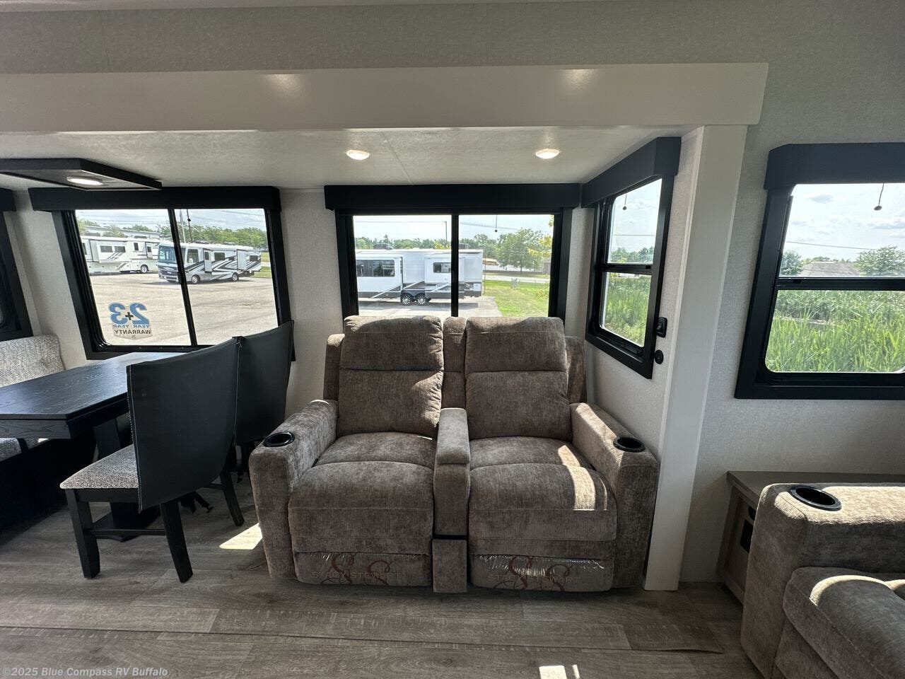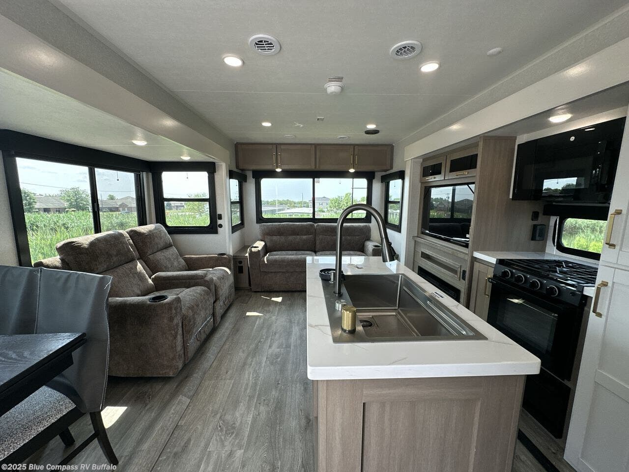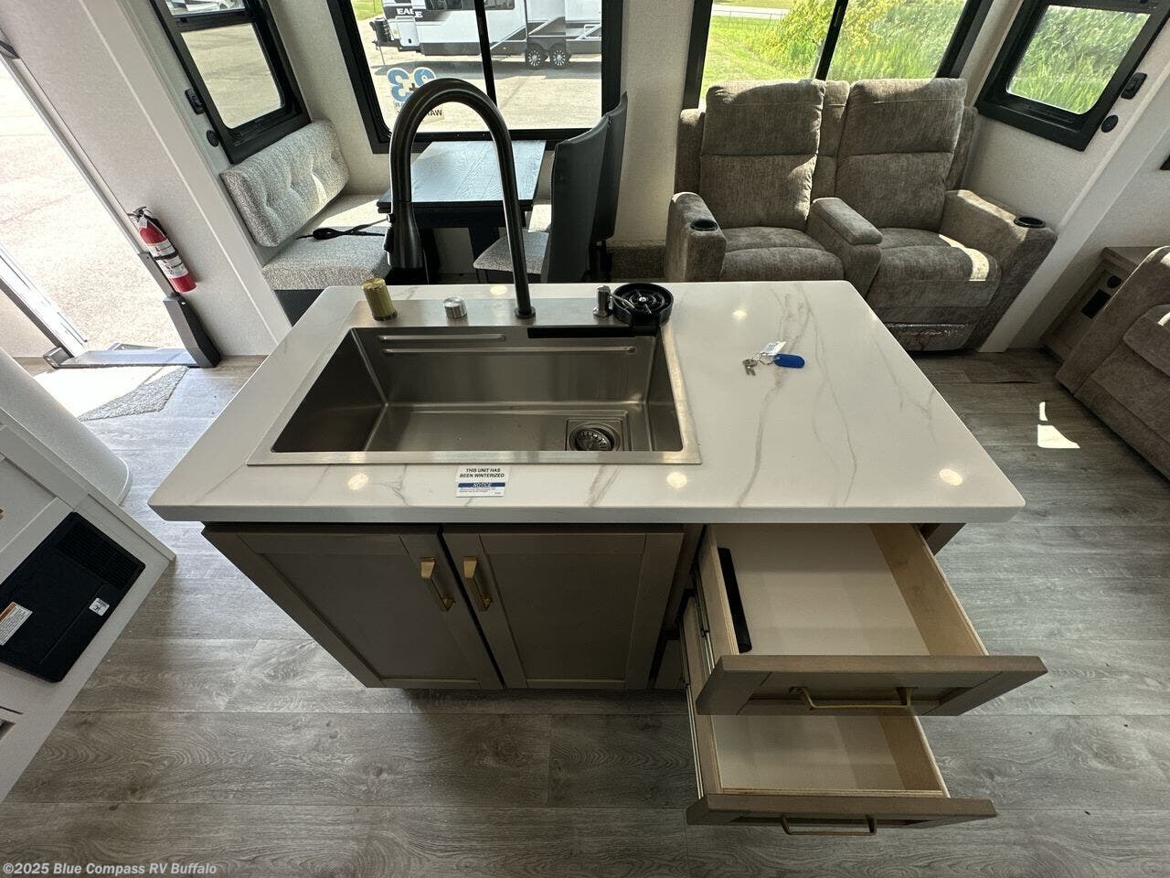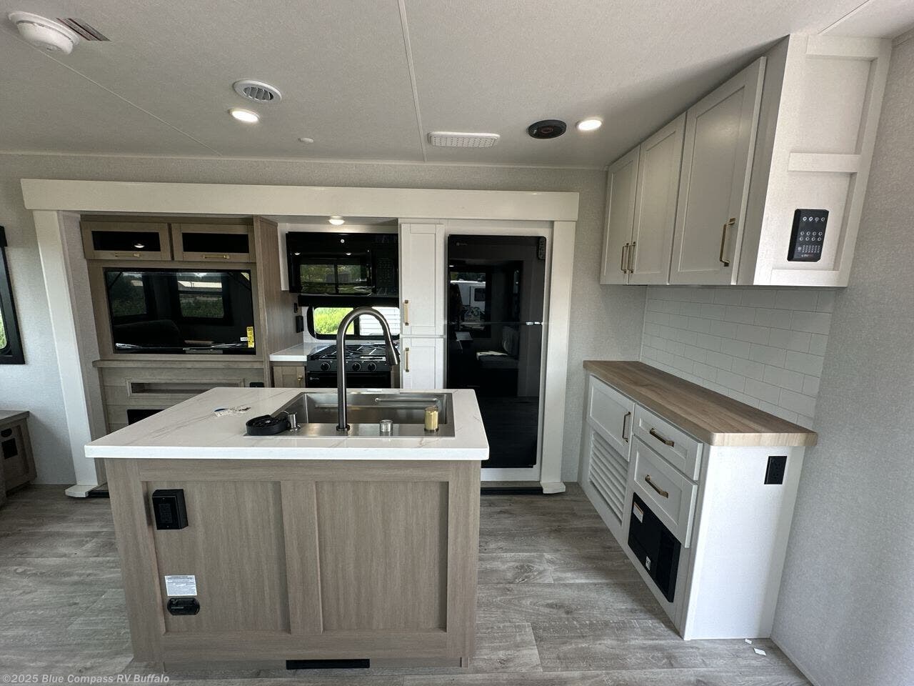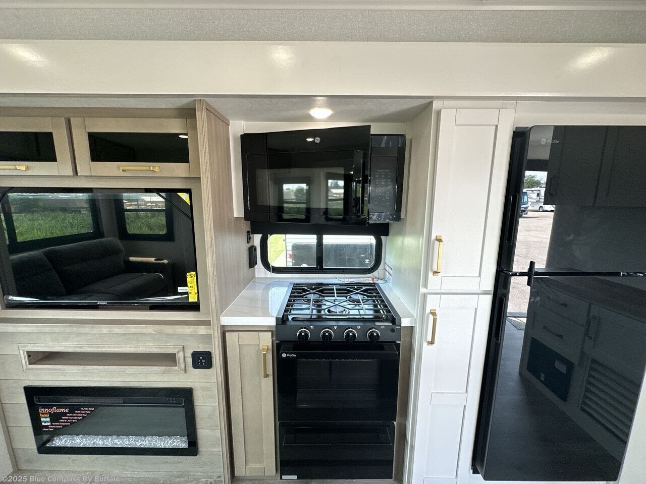 You will feel right at home camping in this travel trailer! It features a front private bedroom with an Olympic queen bed slide for more interior space, a dresser, a front wardrobe to hang your clothes, and a wardrobe that is prepped to add an optional washer and dryer. Start each morning getting squeaky clean in the full bathroom with the shower and then head to the kitchen to fry up some eggs on the stainless steel range. The kitchen island with a multi-functional sink will help make meal prepping easier too, plus there is a hutch to store your dishes. Enjoy a relaxing evening by the fireplace and watch your favorite movie with the entertainment center while sitting on either the rear tri-fold sofa or the theater seating!