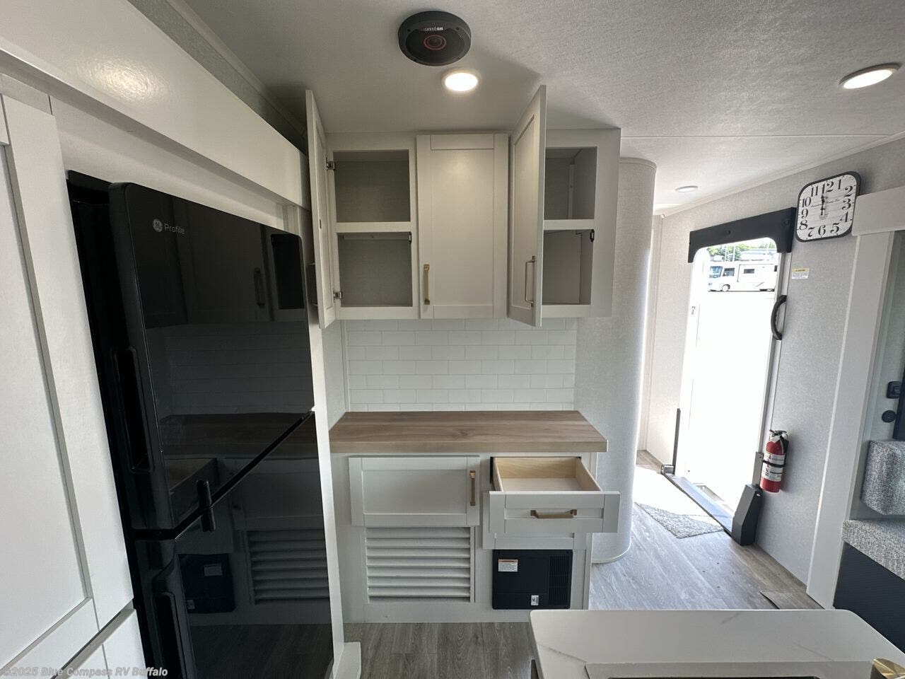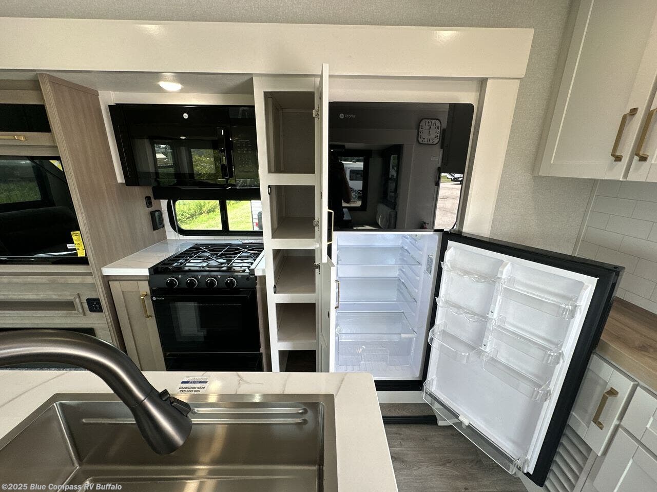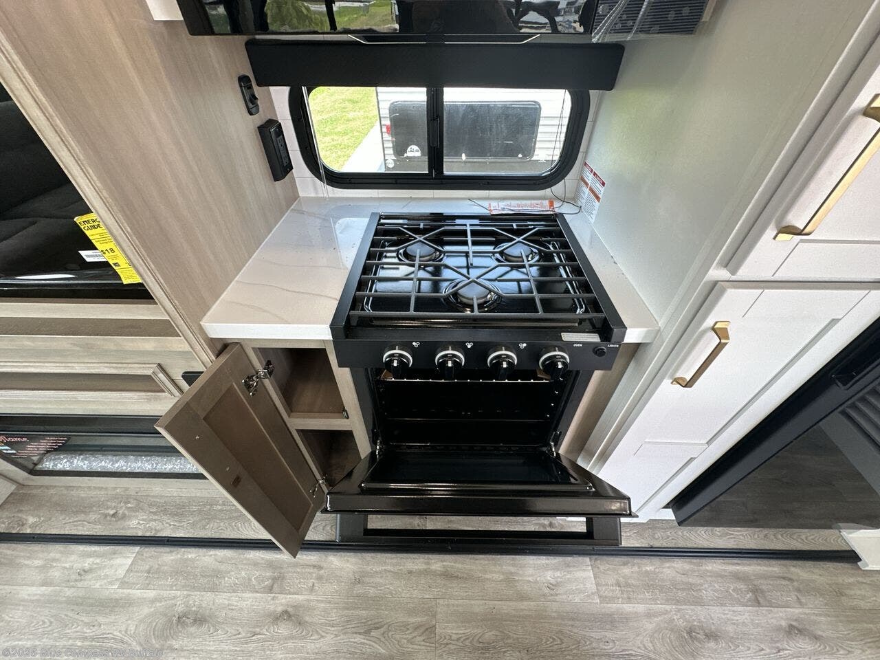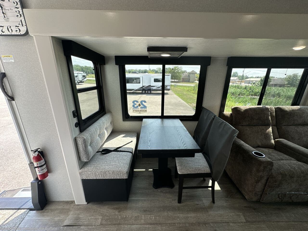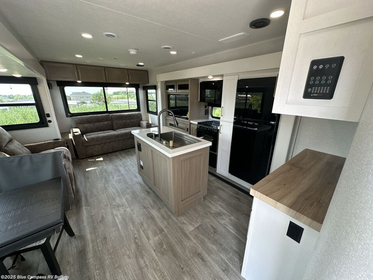 You will feel right at home camping in this travel trailer! It features a front private bedroom with an Olympic queen bed slide for more interior space, a dresser, a front wardrobe to hang your clothes, and a wardrobe that is prepped to add an optional washer and dryer. Start each morning getting squeaky clean in the full bathroom with the shower and then head to the kitchen to fry up some eggs on the stainless steel range. The kitchen island with a multi-functional sink will help make meal prepping easier too, plus there is a hutch to store your dishes. Enjoy a relaxing evening by the fireplace and watch your favorite movie with the entertainment center while sitting on either the rear tri-fold sofa or the theater seating!