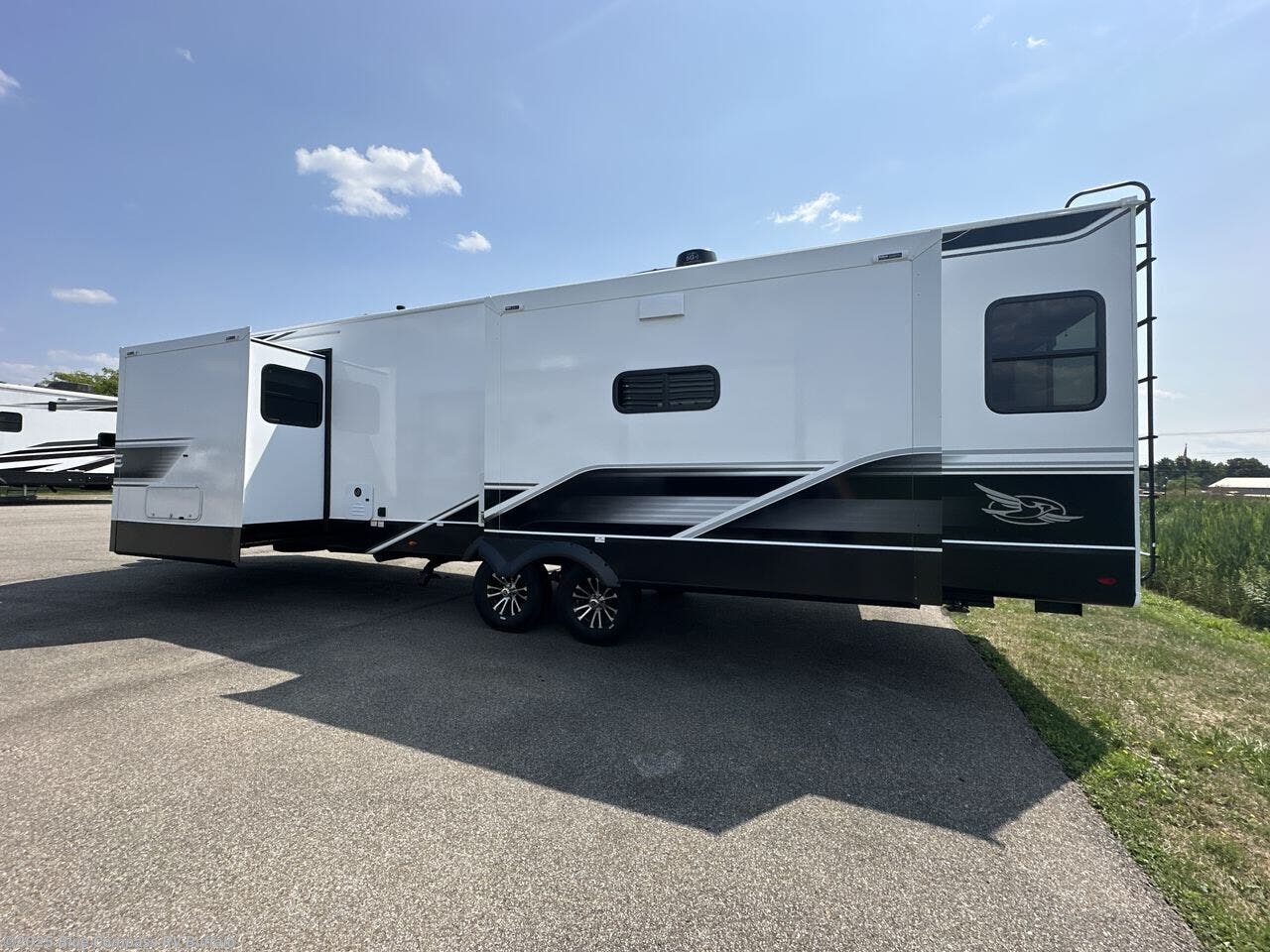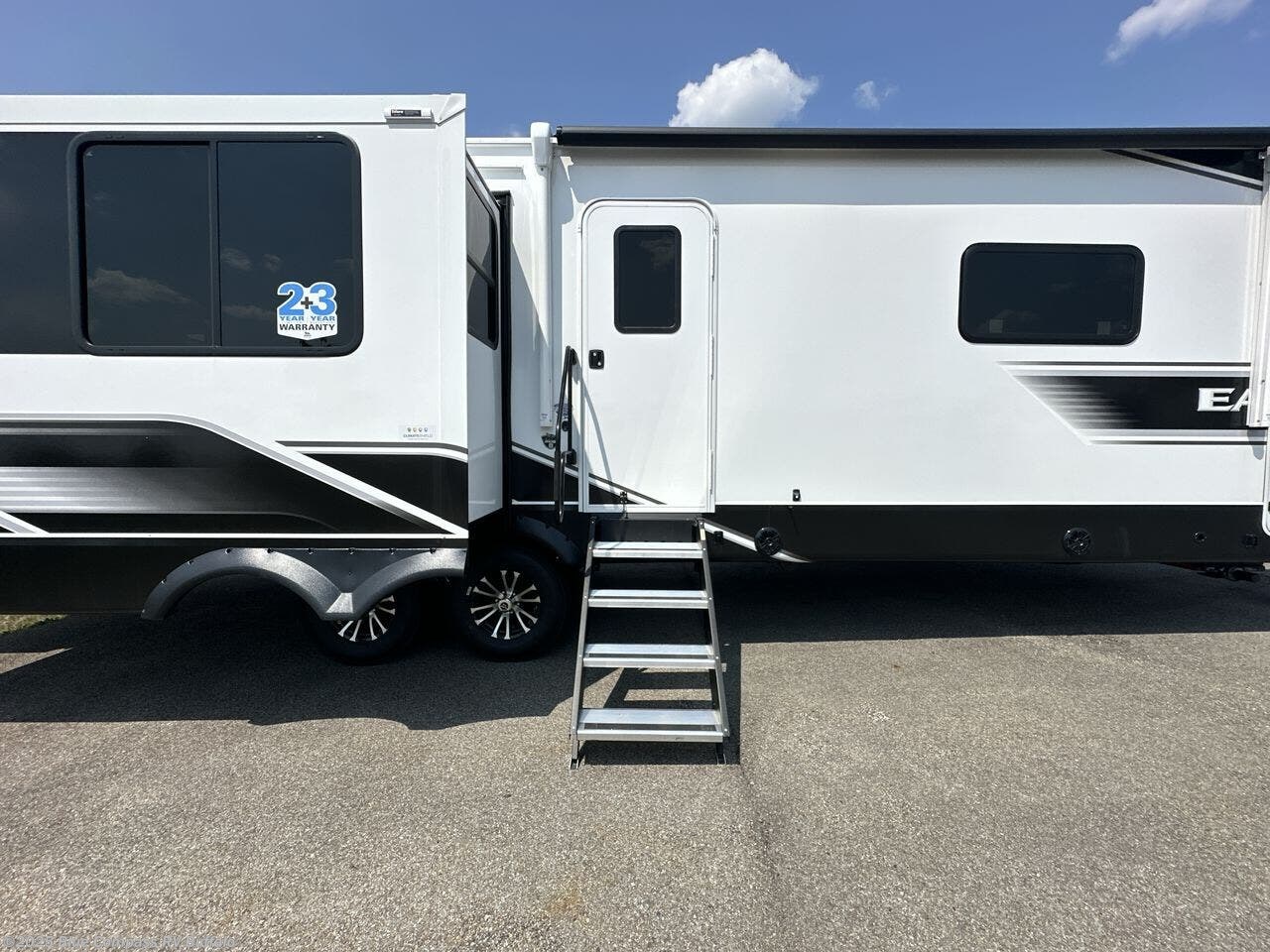 With any Eagle HT fifth wheel or travel trailer by Jayco you will enjoy a smooth drive thanks to the 4 Star Handling Package, Goodyear Endurance tires, and MORryde CRE-3000 rubberized suspension. The Customer Value Package includes amenities that are sure to make camping easier than ever, like the 60K on-demand water heater, Keyed-Alike lock system, 15,000 BTU "Whisper Quiet" A/C, and more. Handcrafted and glazed door/drawer fronts will make your space feel more like home, along with residential vinyl flooring throughout, GE appliances, and blackout roller shades with reflective side throughout to keep the sun out when you want to sleep in. Each model also includes a NuVo H2O water treatment system with filters included, interior and exterior "Blue Sync" audio connect with MB Quart Sound for your TV and phone, and 100% no floor vents for added comfort and convenience!