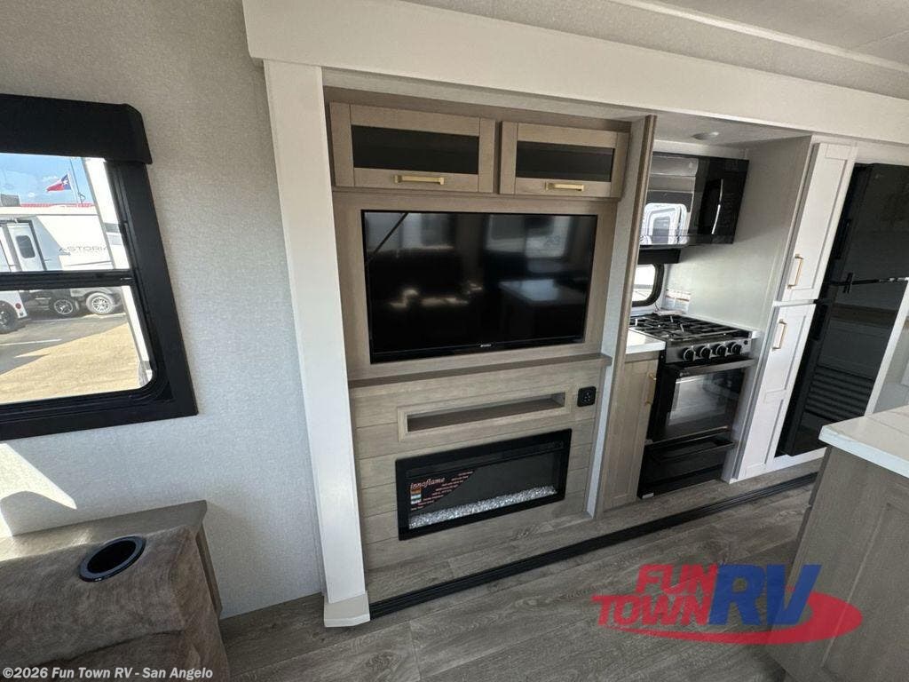 You will feel right at home camping in this travel trailer! It features a front private bedroom with an Olympic queen bed slide for more interior space, a dresser, a front wardrobe to hang your clothes, and a wardrobe that is prepped to add an optional washer and dryer. Start each morning getting squeaky clean in the full bathroom with the shower and then head to the kitchen to fry up some eggs on the stainless steel range. The kitchen island with a multi-functional sink will help make meal prepping easier too, plus there is a hutch to store your dishes. Enjoy a relaxing evening by the fireplace and watch your favorite movie with the entertainment center while sitting on either the rear tri-fold sofa or the theater seating!