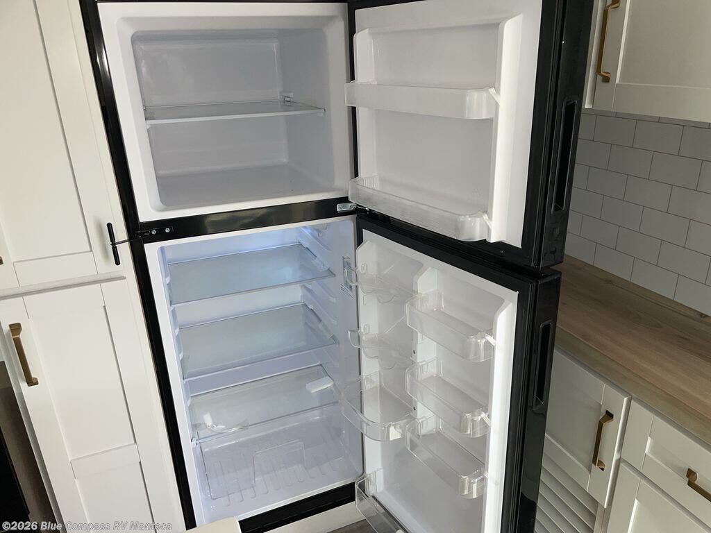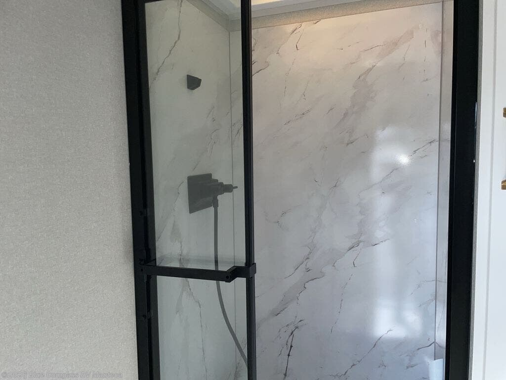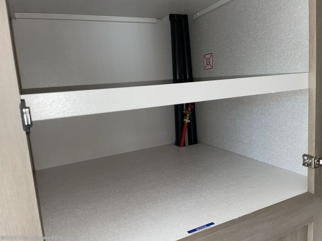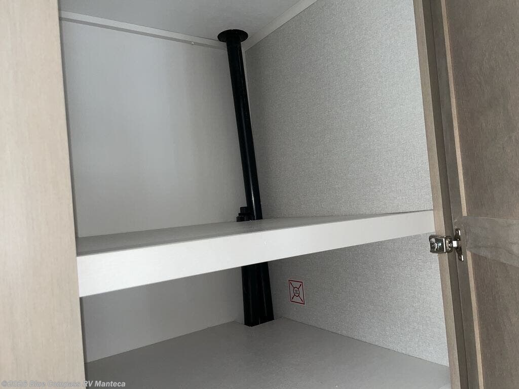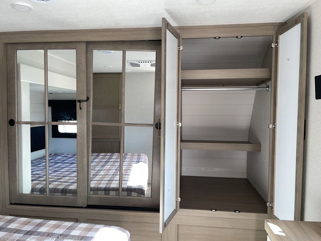 You will feel right at home camping in this travel trailer! It features a front private bedroom with an Olympic queen bed slide for more interior space, a dresser, a front wardrobe to hang your clothes, and a wardrobe that is prepped to add an optional washer and dryer. Start each morning getting squeaky clean in the full bathroom with the shower and then head to the kitchen to fry up some eggs on the stainless steel range. The kitchen island with a multi-functional sink will help make meal prepping easier too, plus there is a hutch to store your dishes. Enjoy a relaxing evening by the fireplace and watch your favorite movie with the entertainment center while sitting on either the rear tri-fold sofa or the theater seating!
