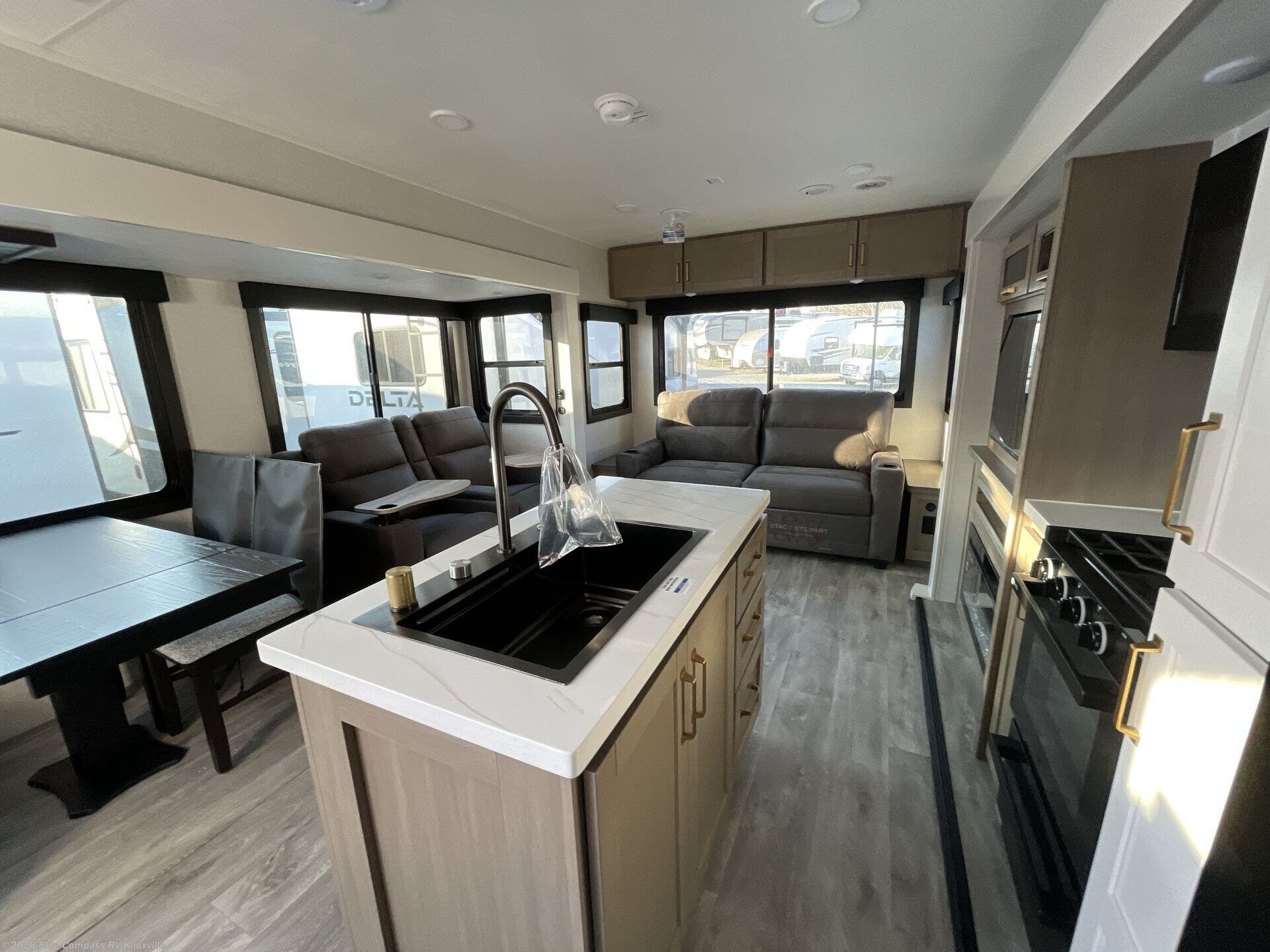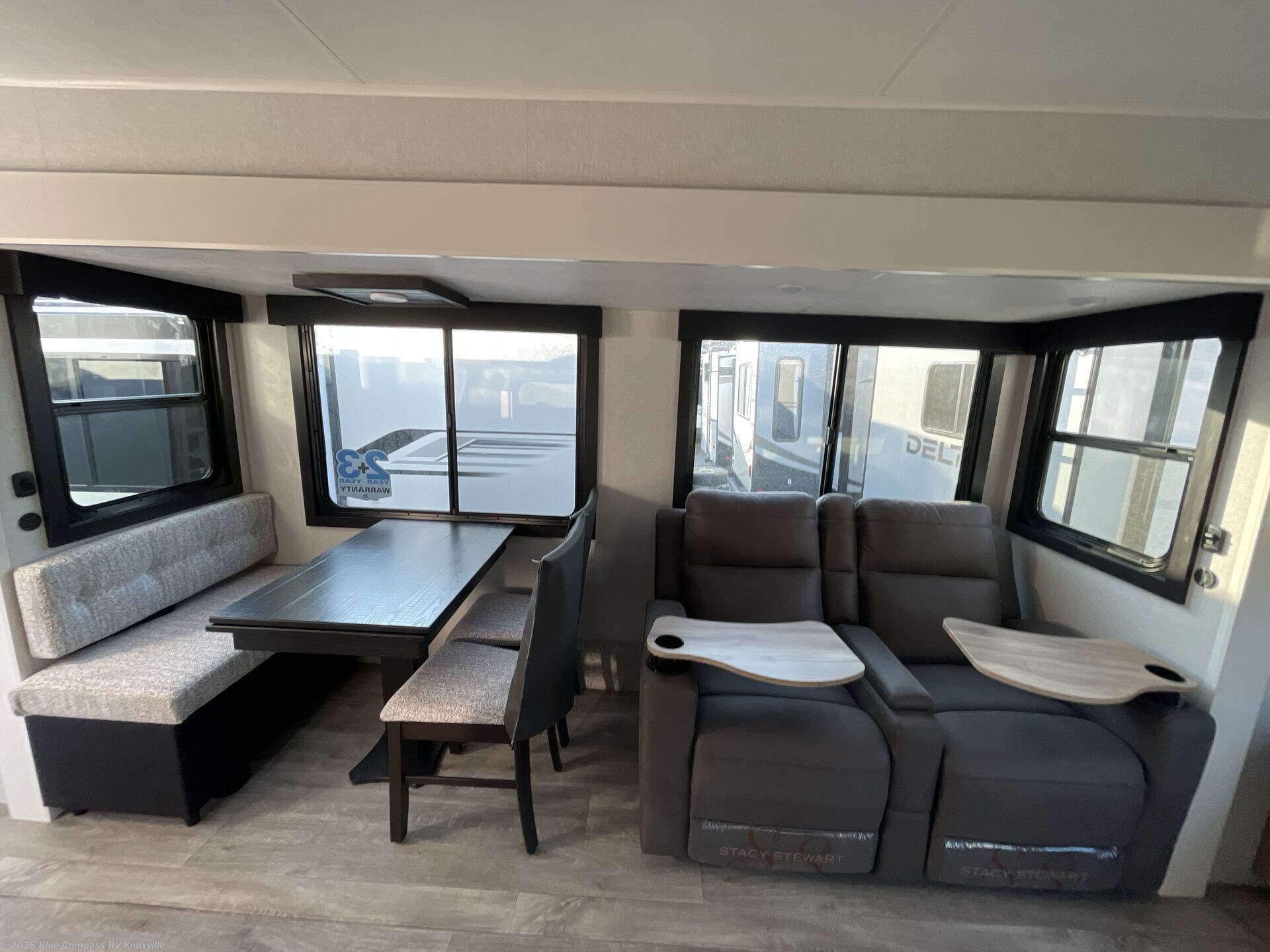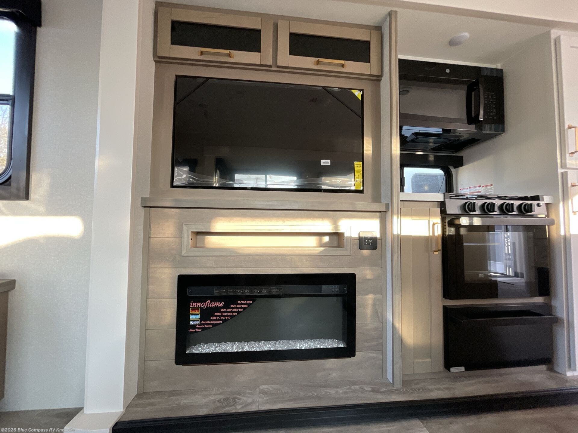You will feel right at home camping in this travel trailer! It features a front private bedroom with an Olympic queen bed slide for more interior space, a dresser, a front wardrobe to hang your clothes, and a wardrobe that is prepped to add an optional washer and dryer. Start each morning getting squeaky clean in the full bathroom with the shower and then head to the kitchen to fry up some eggs on the stainless steel range. The kitchen island with a multi-functional sink will help make meal prepping easier too, plus there is a hutch to store your dishes. Enjoy a relaxing evening by the fireplace and watch your favorite movie with the entertainment center while sitting on either the rear tri-fold sofa or the theater seating!