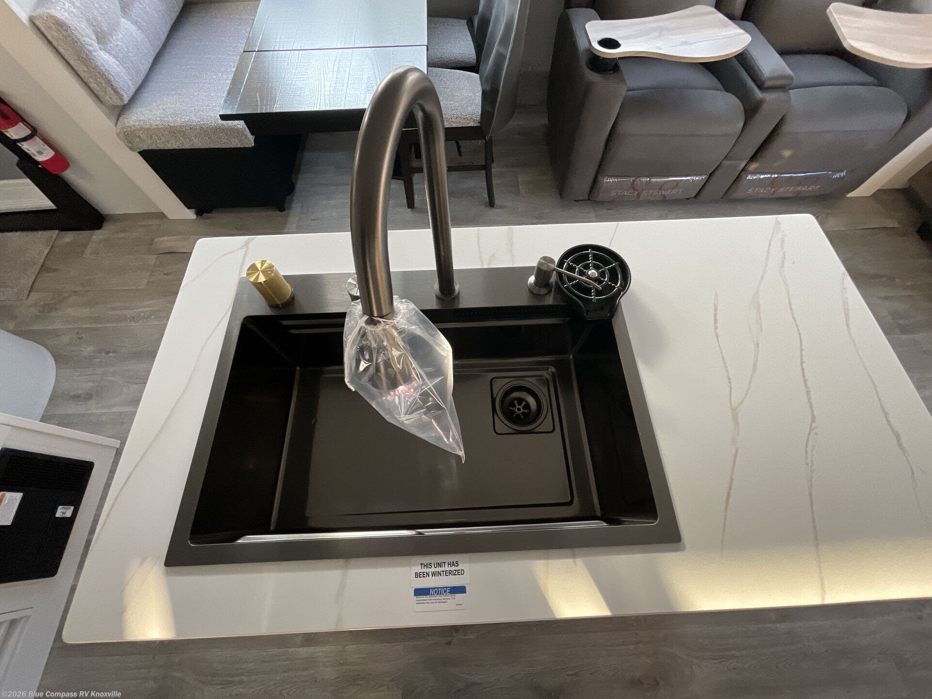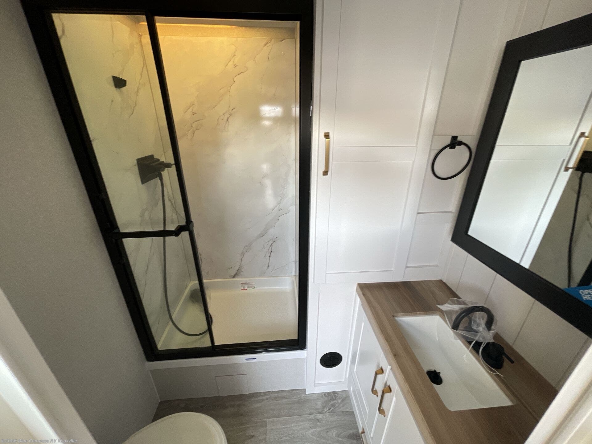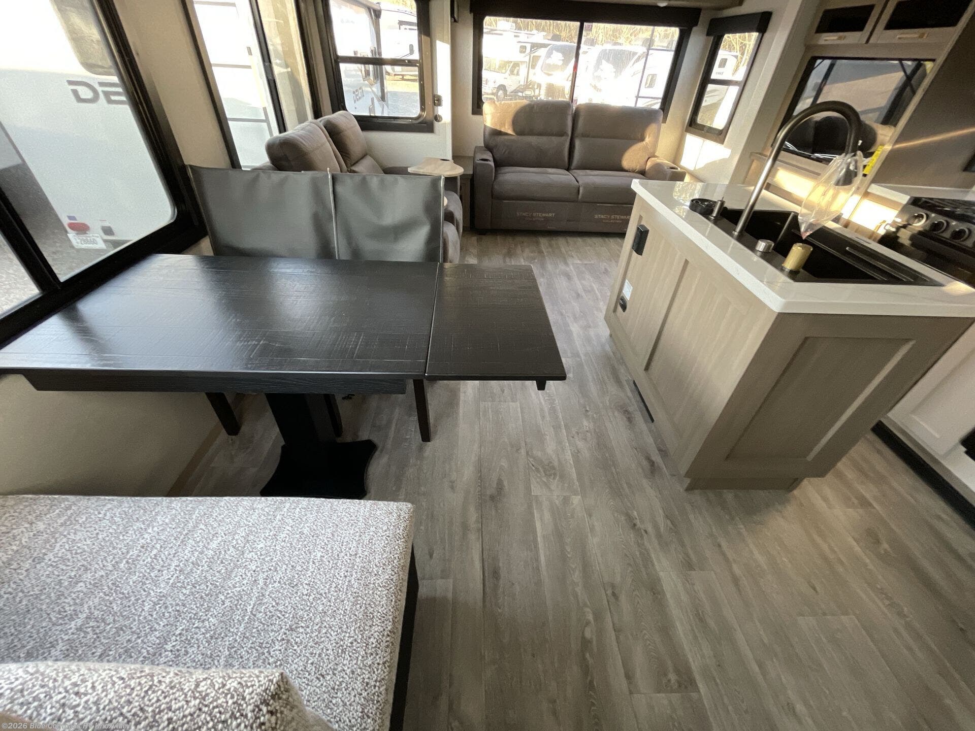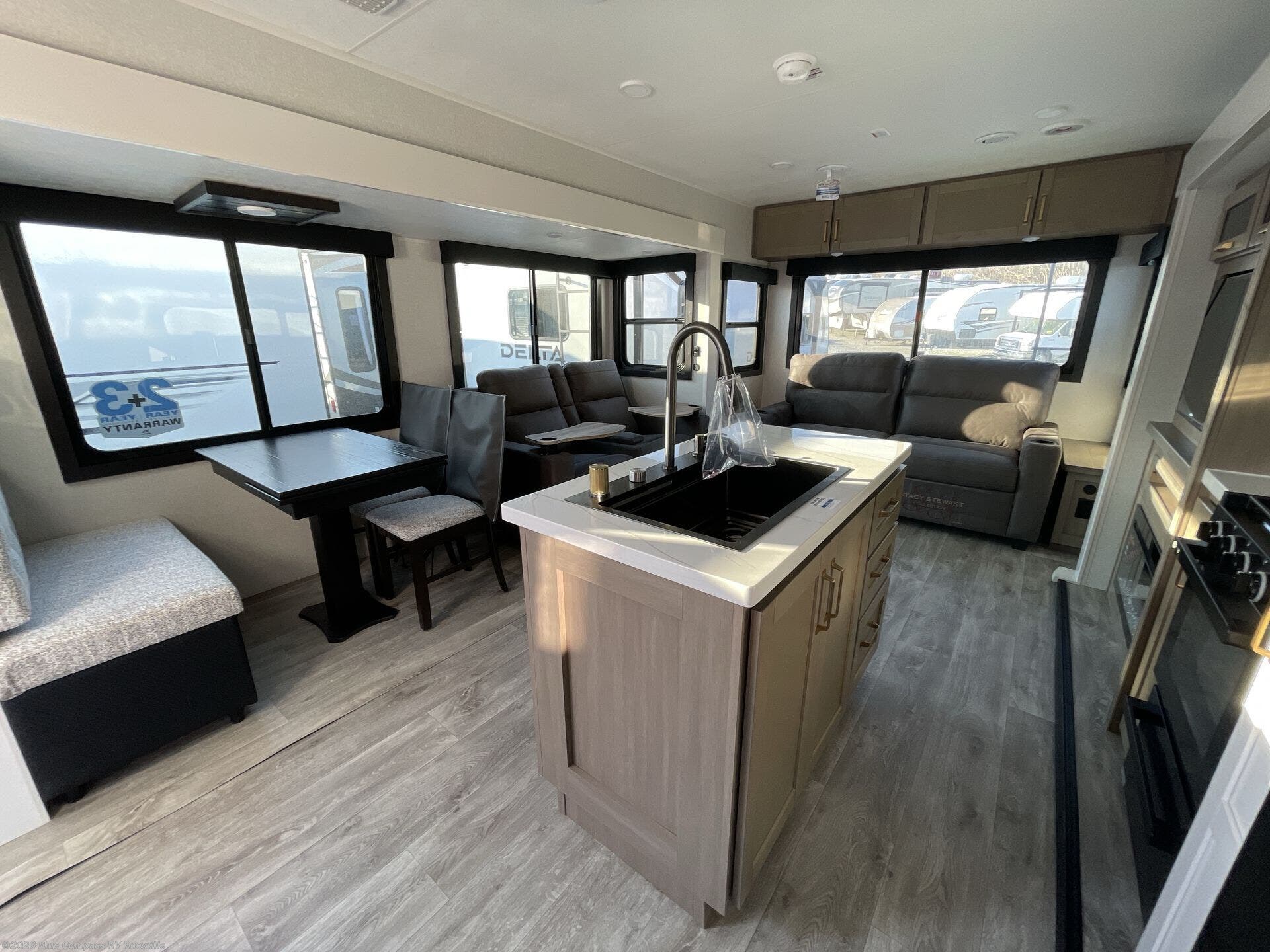 You will feel right at home camping in this travel trailer! It features a front private bedroom with an Olympic queen bed slide for more interior space, a dresser, a front wardrobe to hang your clothes, and a wardrobe that is prepped to add an optional washer and dryer. Start each morning getting squeaky clean in the full bathroom with the shower and then head to the kitchen to fry up some eggs on the stainless steel range. The kitchen island with a multi-functional sink will help make meal prepping easier too, plus there is a hutch to store your dishes. Enjoy a relaxing evening by the fireplace and watch your favorite movie with the entertainment center while sitting on either the rear tri-fold sofa or the theater seating!