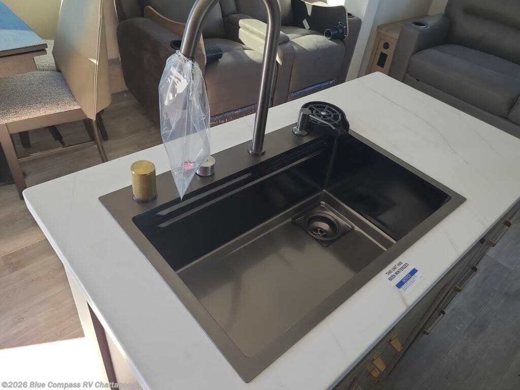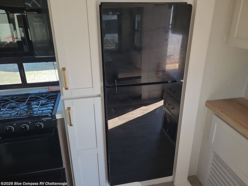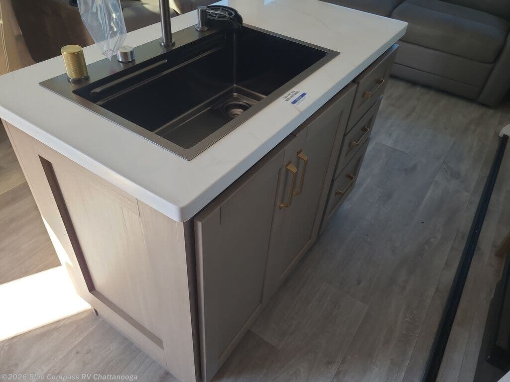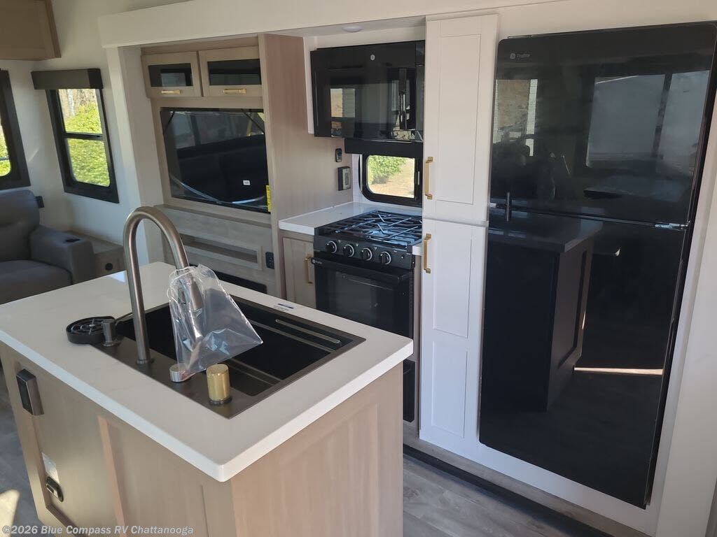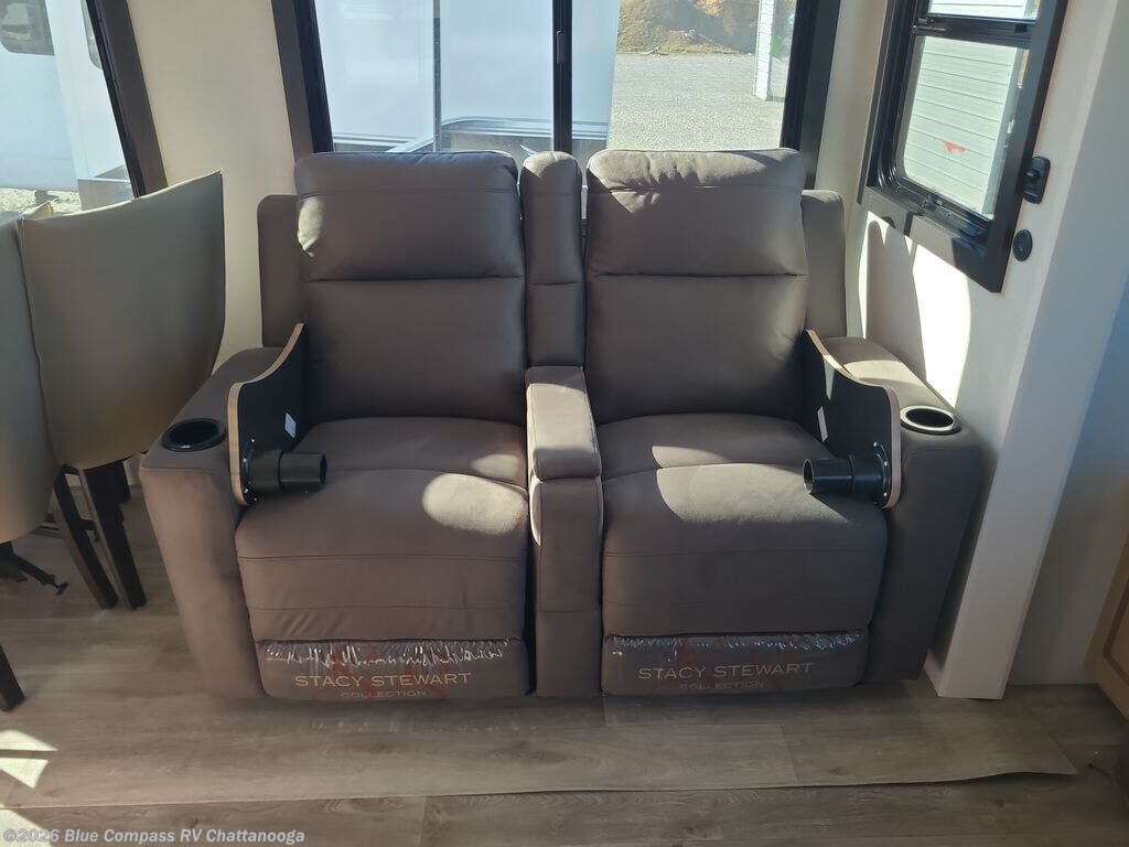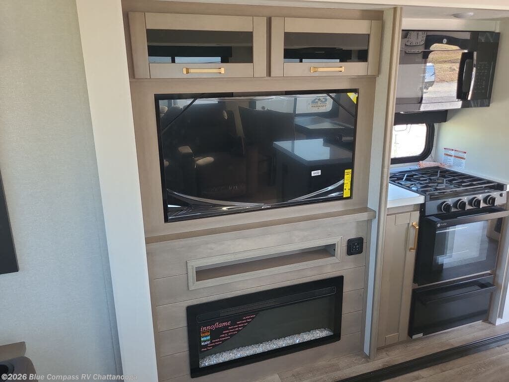 You will feel right at home camping in this travel trailer! It features a front private bedroom with an Olympic queen bed slide for more interior space, a dresser, a front wardrobe to hang your clothes, and a wardrobe that is prepped to add an optional washer and dryer. Start each morning getting squeaky clean in the full bathroom with the shower and then head to the kitchen to fry up some eggs on the stainless steel range. The kitchen island with a multi-functional sink will help make meal prepping easier too, plus there is a hutch to store your dishes. Enjoy a relaxing evening by the fireplace and watch your favorite movie with the entertainment center while sitting on either the rear tri-fold sofa or the theater seating!