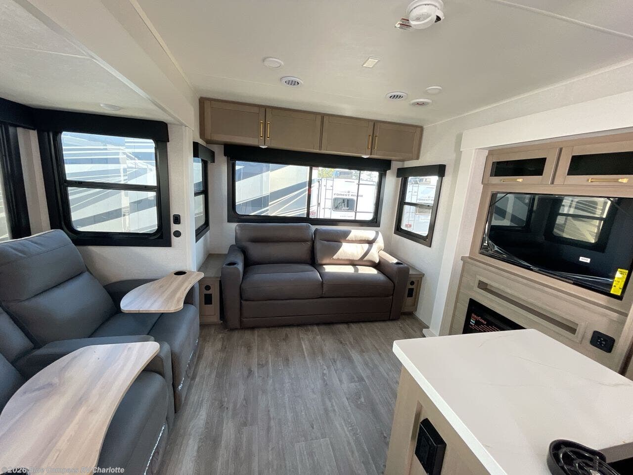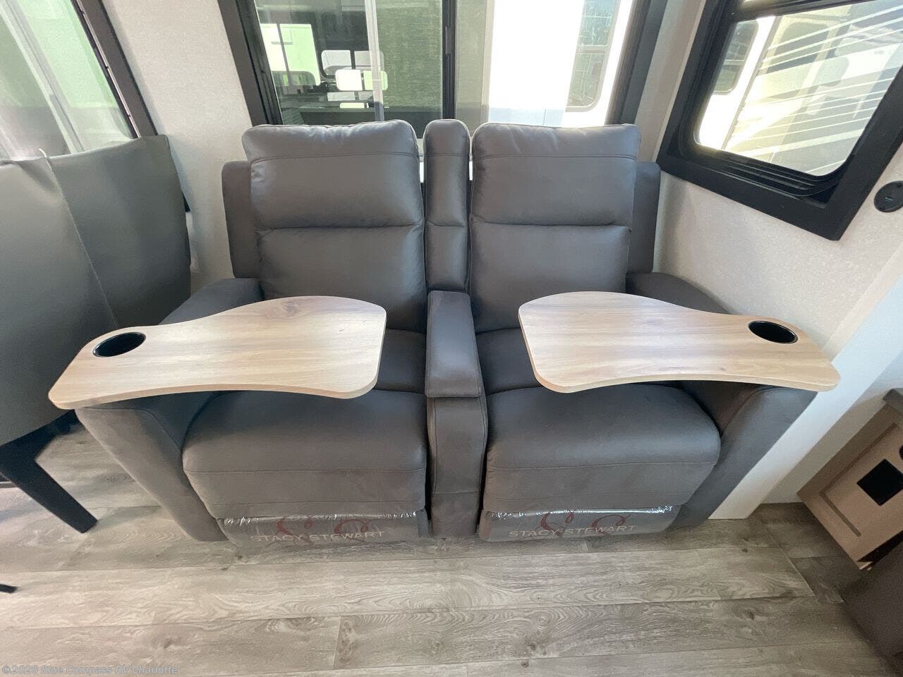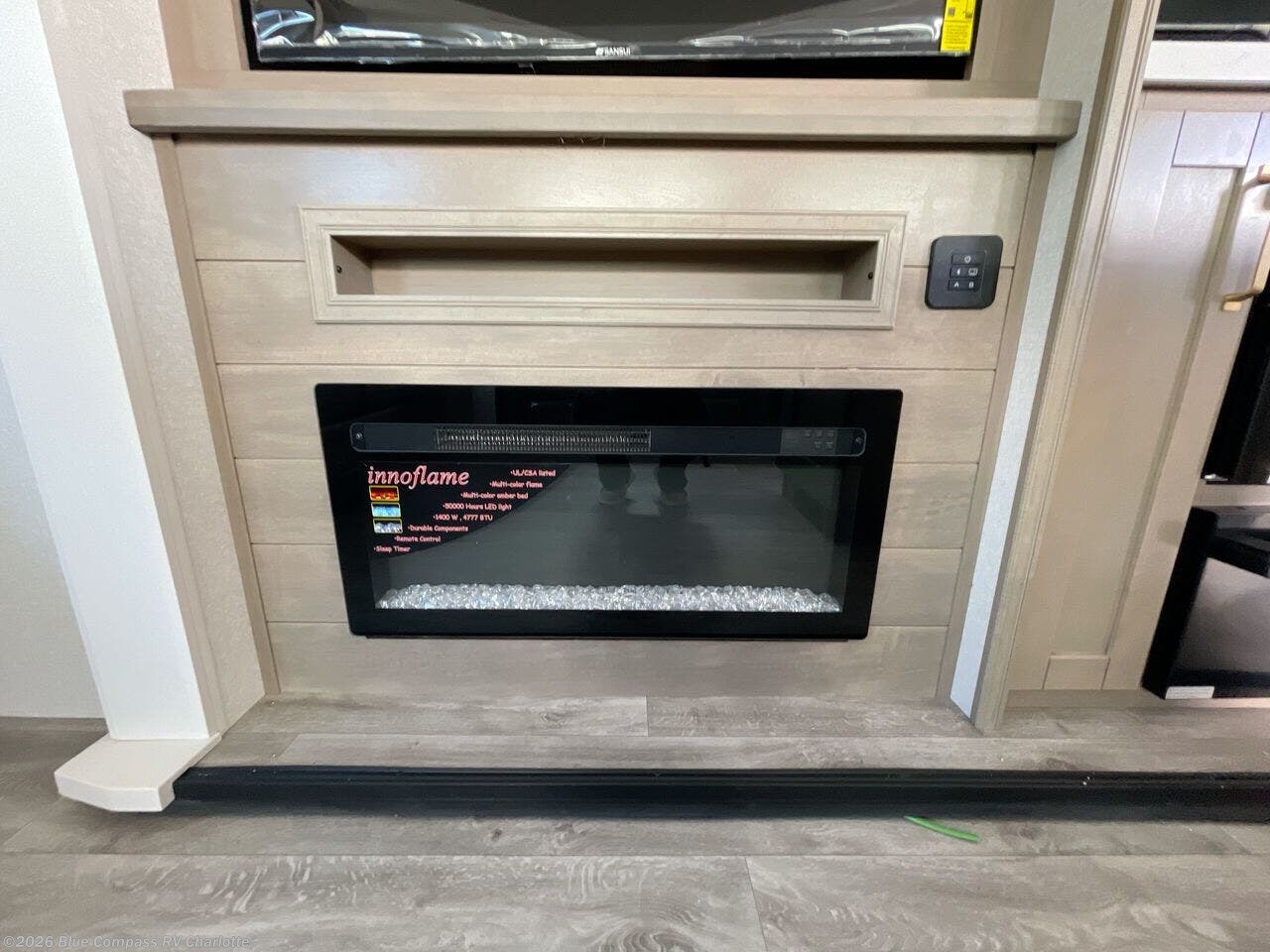 You will feel right at home camping in this travel trailer! It features a front private bedroom with an Olympic queen bed slide for more interior space, a dresser, a front wardrobe to hang your clothes, and a wardrobe that is prepped to add an optional washer and dryer. Start each morning getting squeaky clean in the full bathroom with the shower and then head to the kitchen to fry up some eggs on the stainless steel range. The kitchen island with a multi-functional sink will help make meal prepping easier too, plus there is a hutch to store your dishes. Enjoy a relaxing evening by the fireplace and watch your favorite movie with the entertainment center while sitting on either the rear tri-fold sofa or the theater seating!
