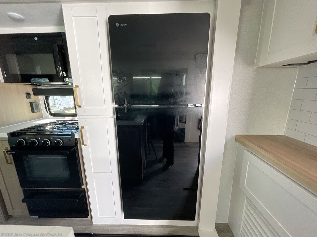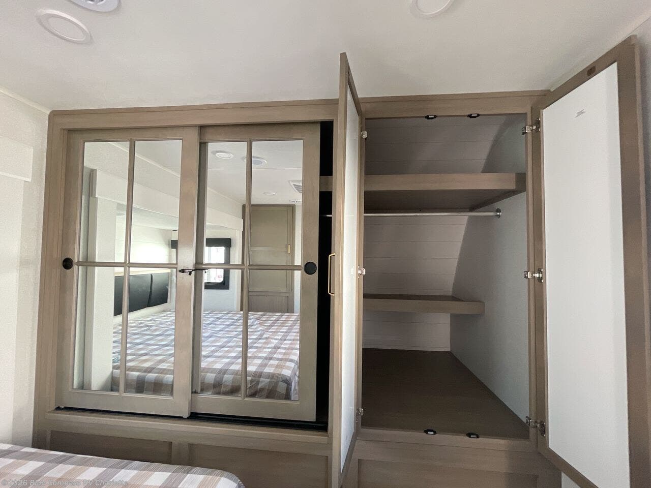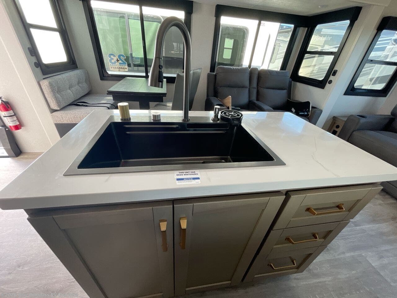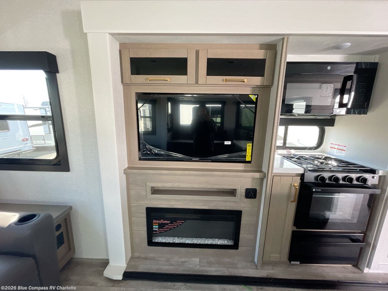 You will feel right at home camping in this travel trailer! It features a front private bedroom with an Olympic queen bed slide for more interior space, a dresser, a front wardrobe to hang your clothes, and a wardrobe that is prepped to add an optional washer and dryer. Start each morning getting squeaky clean in the full bathroom with the shower and then head to the kitchen to fry up some eggs on the stainless steel range. The kitchen island with a multi-functional sink will help make meal prepping easier too, plus there is a hutch to store your dishes. Enjoy a relaxing evening by the fireplace and watch your favorite movie with the entertainment center while sitting on either the rear tri-fold sofa or the theater seating!