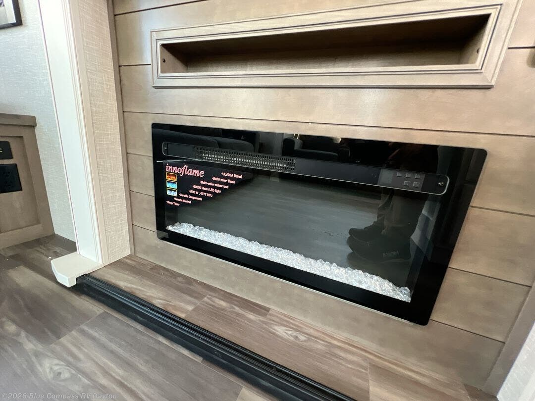 You will feel right at home camping in this travel trailer! It features a front private bedroom with an Olympic queen bed slide for more interior space, a dresser, a front wardrobe to hang your clothes, and a wardrobe that is prepped to add an optional washer and dryer. Start each morning getting squeaky clean in the full bathroom with the shower and then head to the kitchen to fry up some eggs on the stainless steel range. The kitchen island with a multi-functional sink will help make meal prepping easier too, plus there is a hutch to store your dishes. Enjoy a relaxing evening by the fireplace and watch your favorite movie with the entertainment center while sitting on either the rear tri-fold sofa or the theater seating!