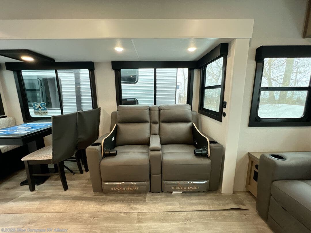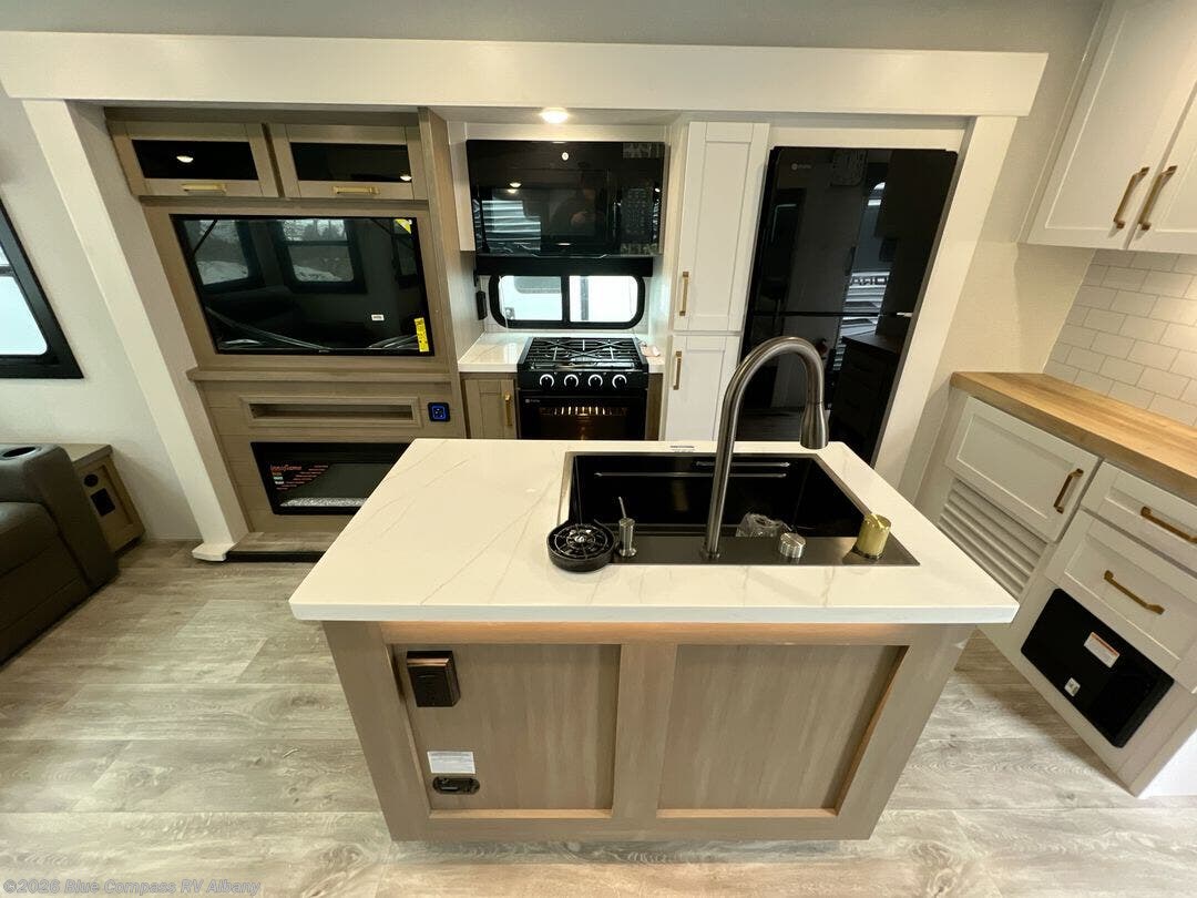 You will feel right at home camping in this travel trailer! It features a front private bedroom with an Olympic queen bed slide for more interior space, a dresser, a front wardrobe to hang your clothes, and a wardrobe that is prepped to add an optional washer and dryer. Start each morning getting squeaky clean in the full bathroom with the shower and then head to the kitchen to fry up some eggs on the stainless steel range. The kitchen island with a multi-functional sink will help make meal prepping easier too, plus there is a hutch to store your dishes. Enjoy a relaxing evening by the fireplace and watch your favorite movie with the entertainment center while sitting on either the rear tri-fold sofa or the theater seating!