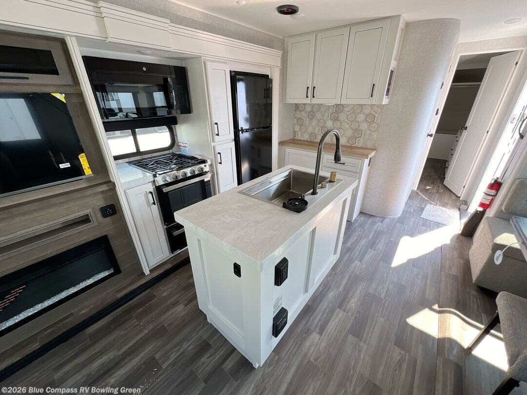 You will feel right at home camping in this travel trailer! It features a front private bedroom with an Olympic queen bed slide for more interior space, a dresser, a front wardrobe to hang your clothes, and a wardrobe that is prepped to add an optional washer and dryer. Start each morning getting squeaky clean in the full bathroom with the shower and then head to the kitchen to fry up some eggs on the stainless steel range. The kitchen island with a multi-functional sink will help make meal prepping easier too, plus there is a hutch to store your dishes. Enjoy a relaxing evening by the fireplace and watch your favorite movie with the entertainment center while sitting on either the rear tri-fold sofa or the theater seating!