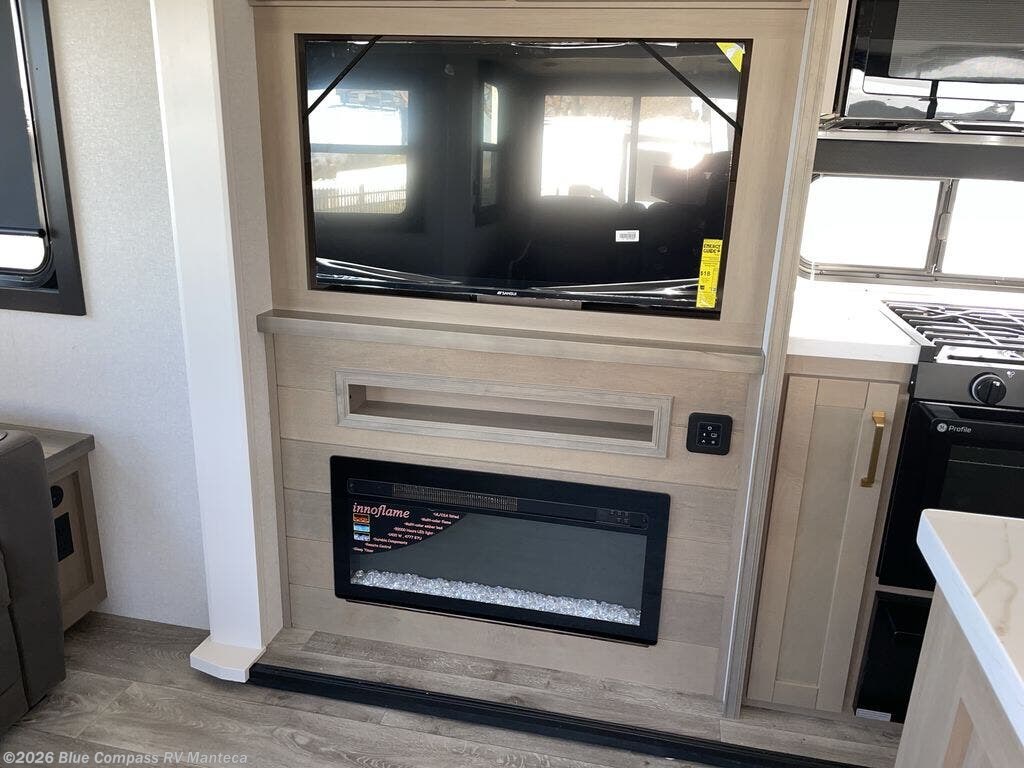 You will feel right at home camping in this travel trailer! It features a front private bedroom with an Olympic queen bed slide for more interior space, a dresser, a front wardrobe to hang your clothes, and a wardrobe that is prepped to add an optional washer and dryer. Start each morning getting squeaky clean in the full bathroom with the shower and then head to the kitchen to fry up some eggs on the stainless steel range. The kitchen island with a multi-functional sink will help make meal prepping easier too, plus there is a hutch to store your dishes. Enjoy a relaxing evening by the fireplace and watch your favorite movie with the entertainment center while sitting on either the rear tri-fold sofa or the theater seating!