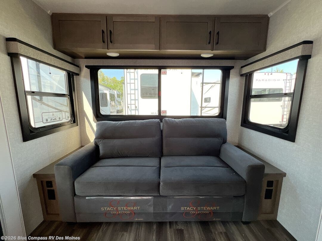 You will feel right at home camping in this travel trailer! It features a front private bedroom with an Olympic queen bed slide for more interior space, a dresser, a front wardrobe to hang your clothes, and a wardrobe that is prepped to add an optional washer and dryer. Start each morning getting squeaky clean in the full bathroom with the shower and then head to the kitchen to fry up some eggs on the stainless steel range. The kitchen island with a multi-functional sink will help make meal prepping easier too, plus there is a hutch to store your dishes. Enjoy a relaxing evening by the fireplace and watch your favorite movie with the entertainment center while sitting on either the rear tri-fold sofa or the theater seating!