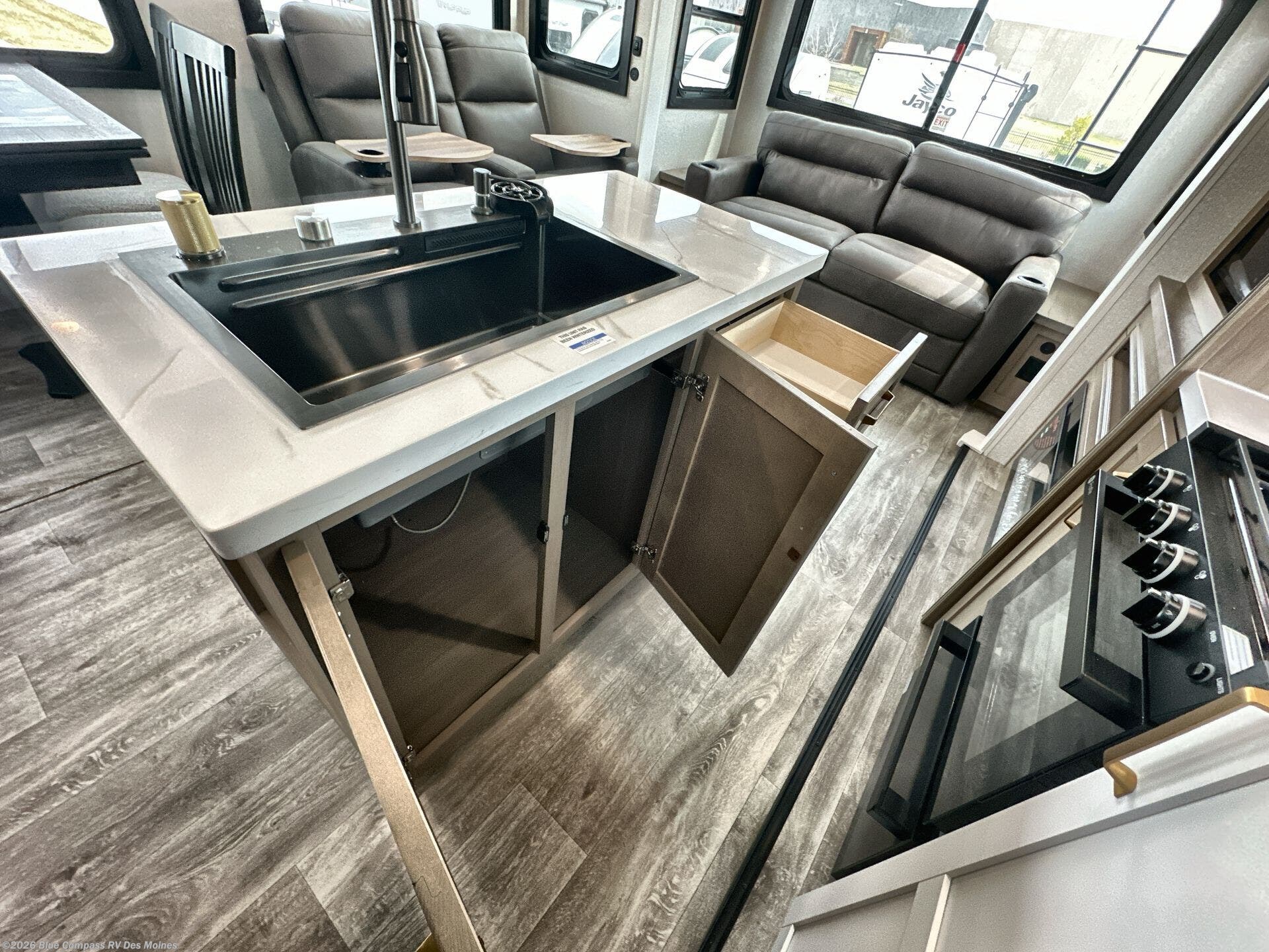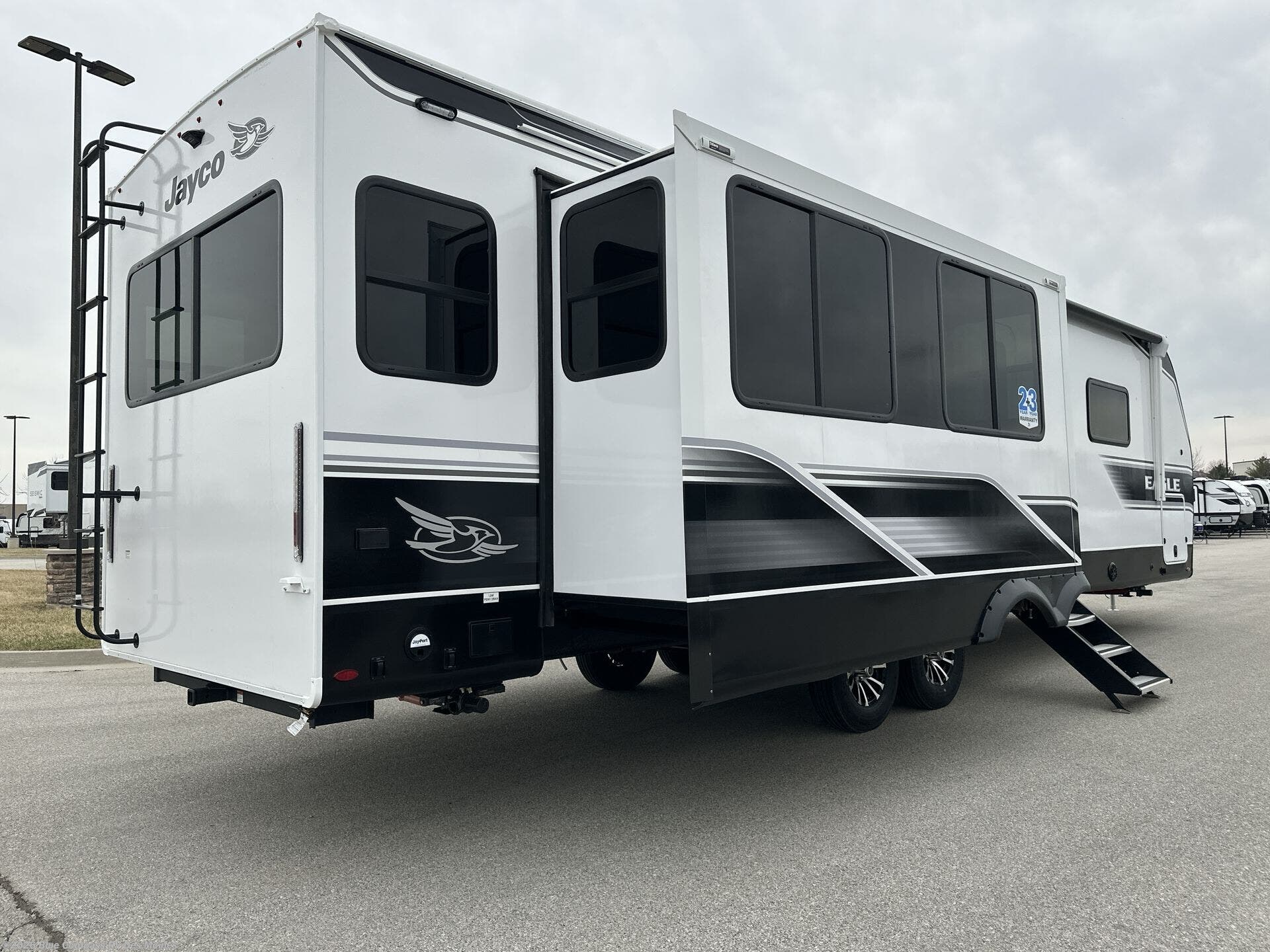 With any Eagle HT fifth wheel or travel trailer by Jayco you will enjoy a smooth drive thanks to the 4 Star Handling Package and MORryde CRE-3000 rubberized suspension. The Customer Value Package includes amenities that are sure to make camping easier than ever, like the 60K on-demand water heater, Keyed-Alike lock system, 15,000 BTU "Whisper Quiet" A/C, and more. Handcrafted door/drawer fronts will make your space feel more like home, along with residential vinyl flooring throughout, GE appliances, and blackout roller shades with reflective side throughout to keep the sun out when you want to sleep in. Each model also includes a NuVo H2O water treatment system with filters included, interior and exterior "Blue Sync" audio connect with MB Quart Sound for your TV and phone, and 100% no floor vents for added comfort and convenience!