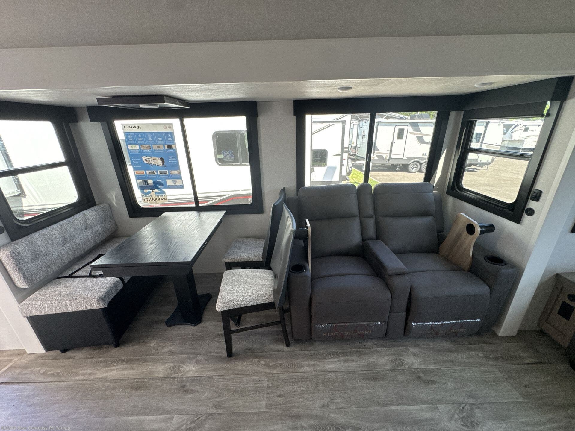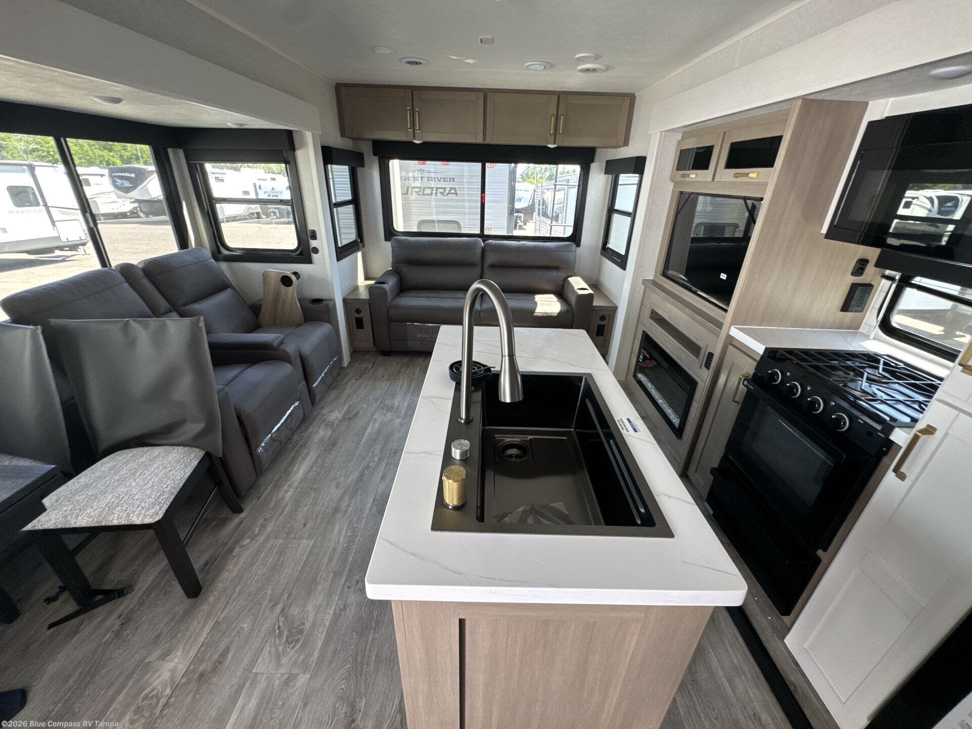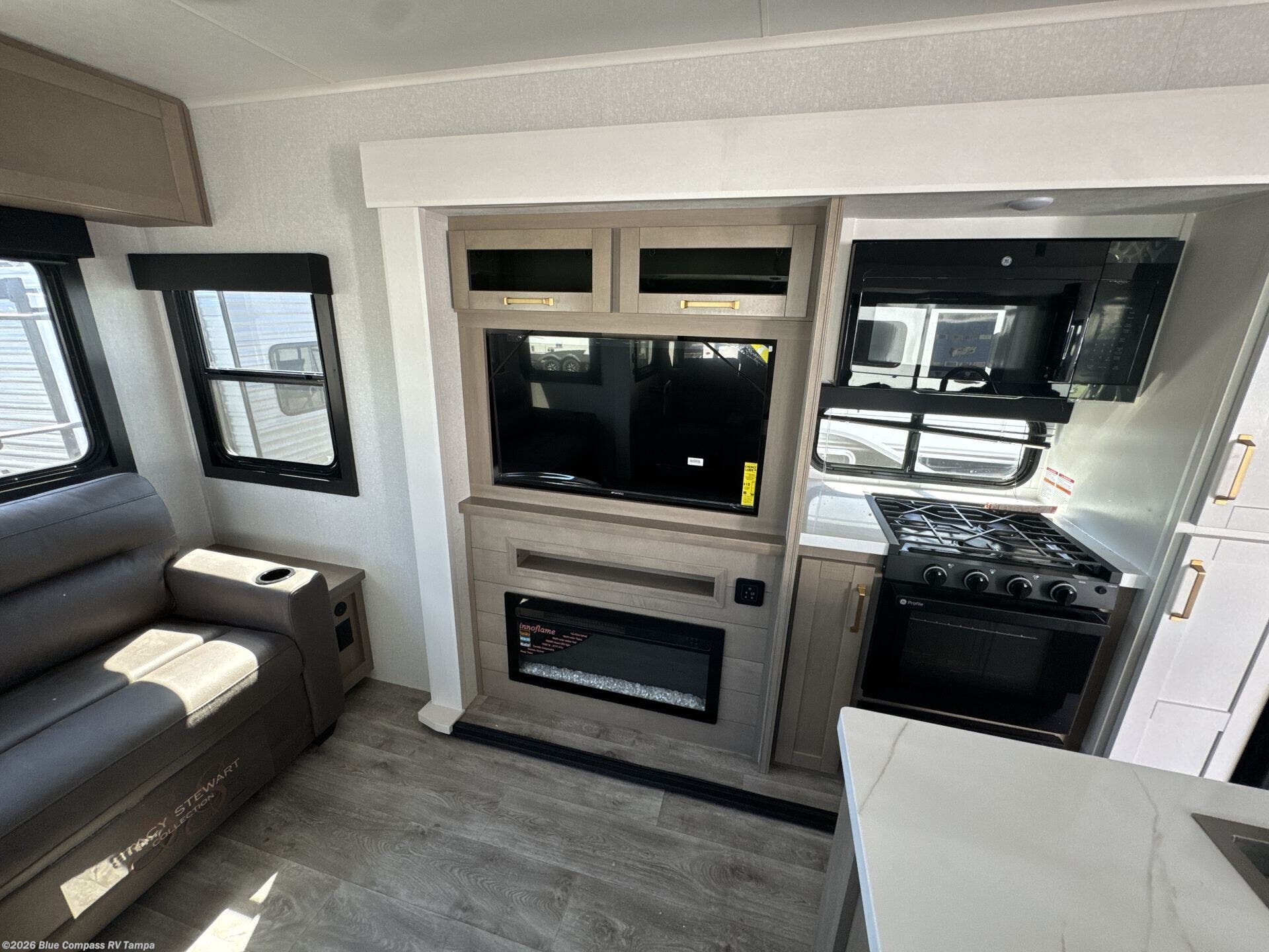 You will feel right at home camping in this travel trailer! It features a front private bedroom with an Olympic queen bed slide for more interior space, a dresser, a front wardrobe to hang your clothes, and a wardrobe that is prepped to add an optional washer and dryer. Start each morning getting squeaky clean in the full bathroom with the shower and then head to the kitchen to fry up some eggs on the stainless steel range. The kitchen island with a multi-functional sink will help make meal prepping easier too, plus there is a hutch to store your dishes. Enjoy a relaxing evening by the fireplace and watch your favorite movie with the entertainment center while sitting on either the rear tri-fold sofa or the theater seating!