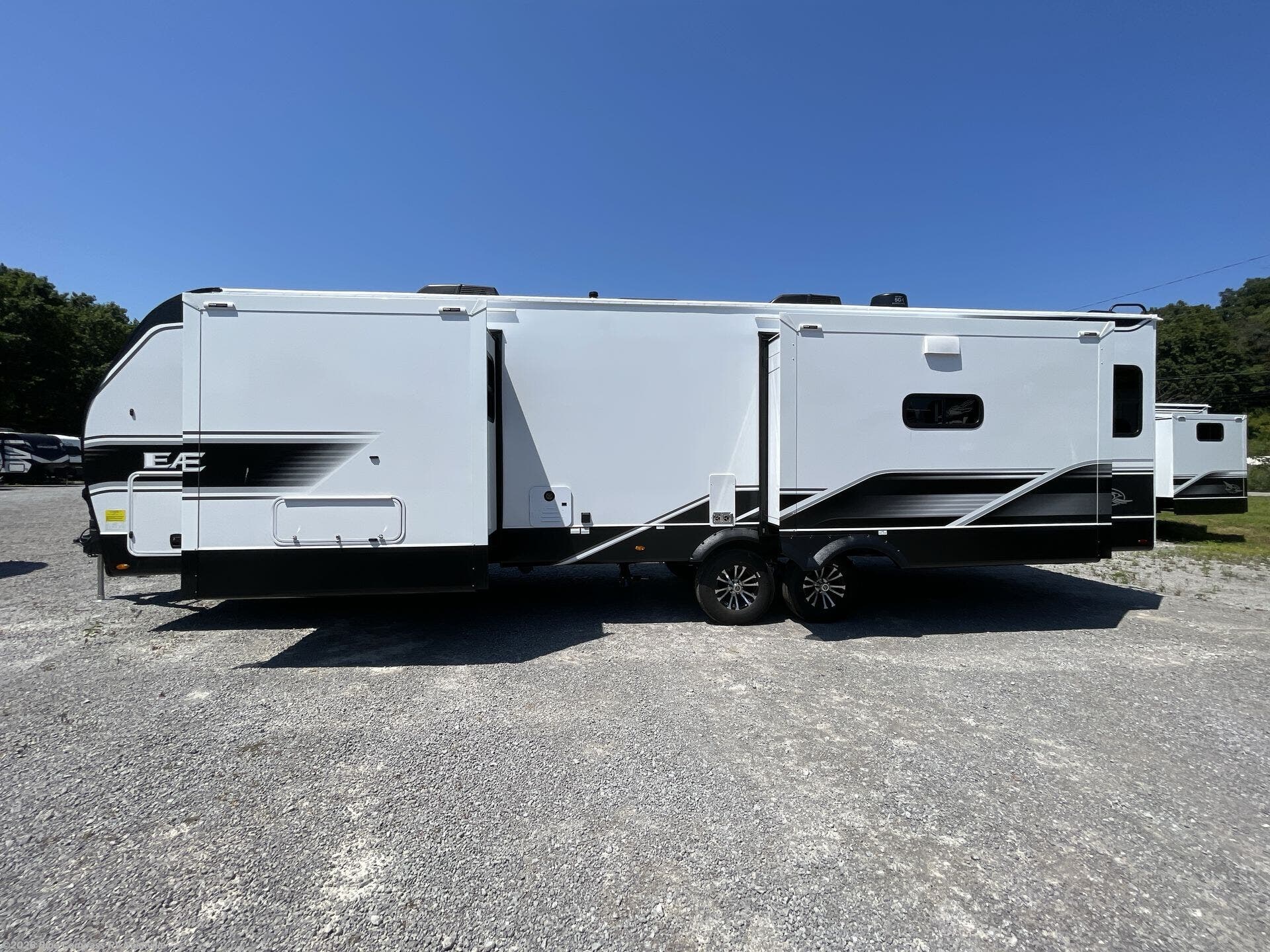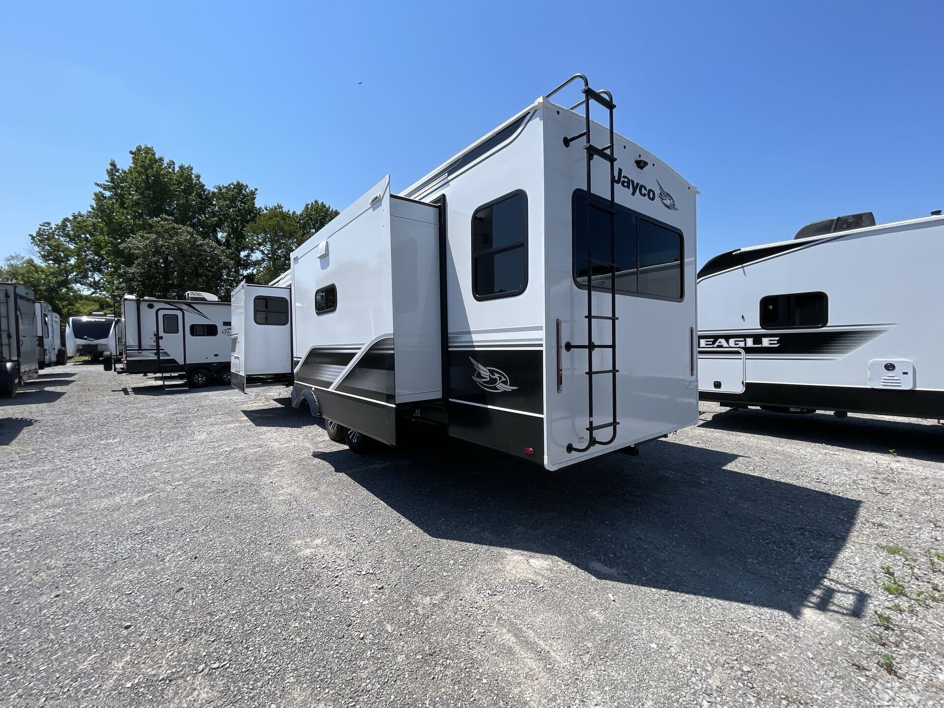With any Eagle HT fifth wheel or travel trailer by Jayco you will enjoy a smooth drive thanks to the 4 Star Handling Package and MORryde CRE-3000 rubberized suspension. The Customer Value Package includes amenities that are sure to make camping easier than ever, like the 60K on-demand water heater, Keyed-Alike lock system, 15,000 BTU "Whisper Quiet" A/C, and more. Handcrafted door/drawer fronts will make your space feel more like home, along with residential vinyl flooring throughout, GE appliances, and blackout roller shades with reflective side throughout to keep the sun out when you want to sleep in. Each model also includes a NuVo H2O water treatment system with filters included, interior and exterior "Blue Sync" audio connect with MB Quart Sound for your TV and phone, and 100% no floor vents for added comfort and convenience!
