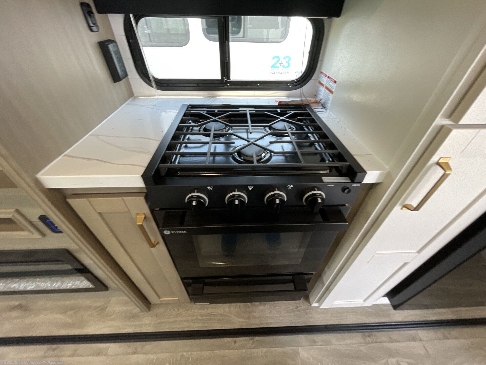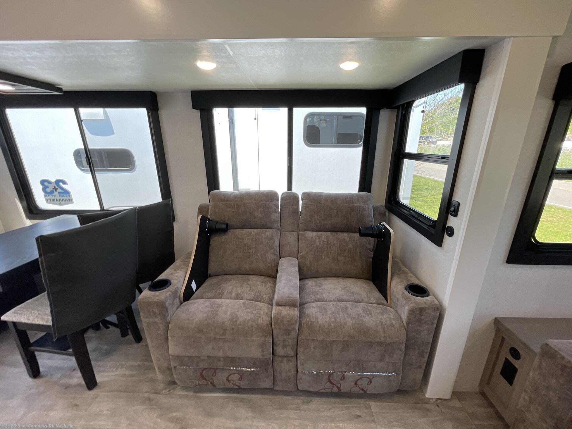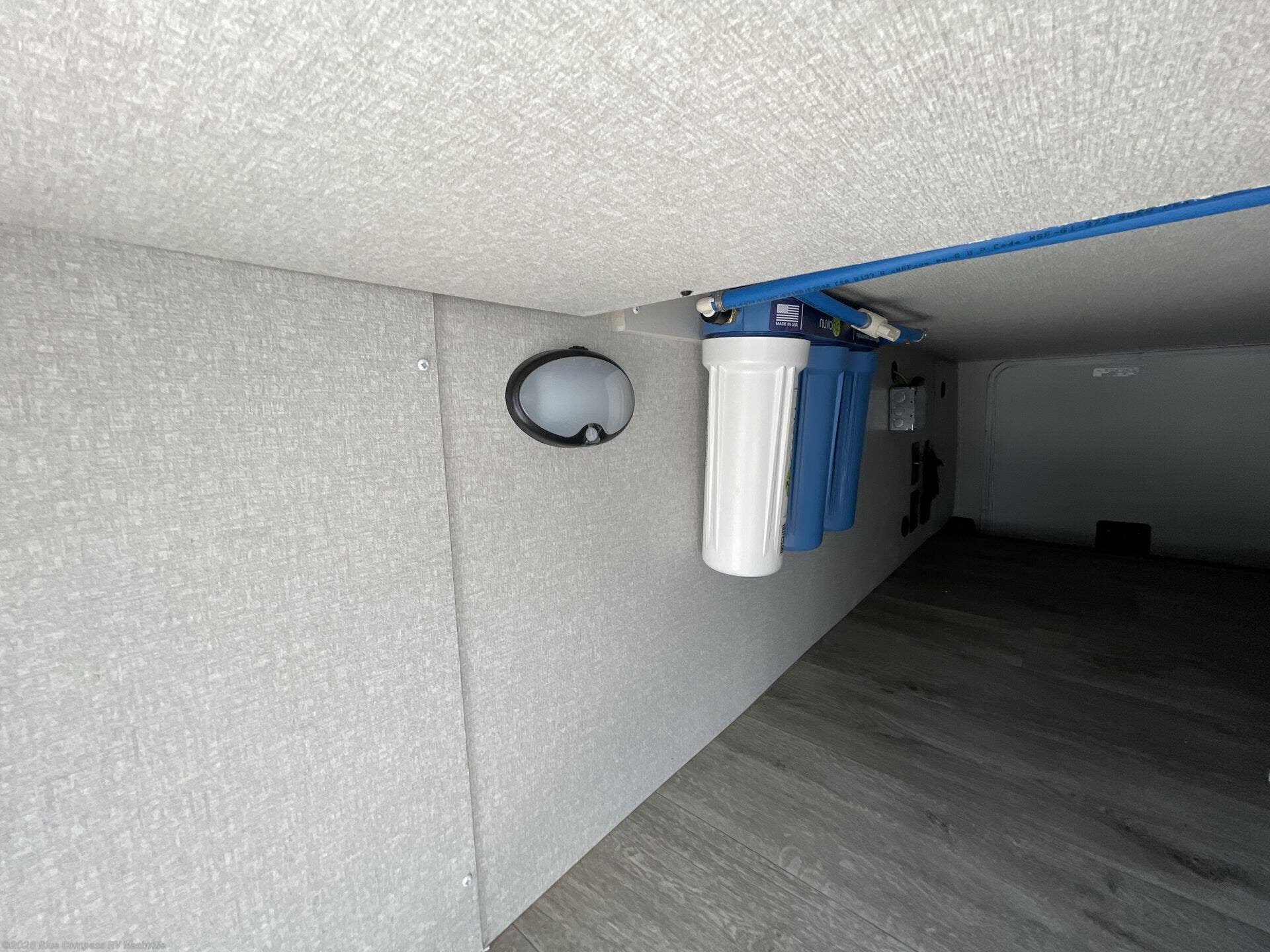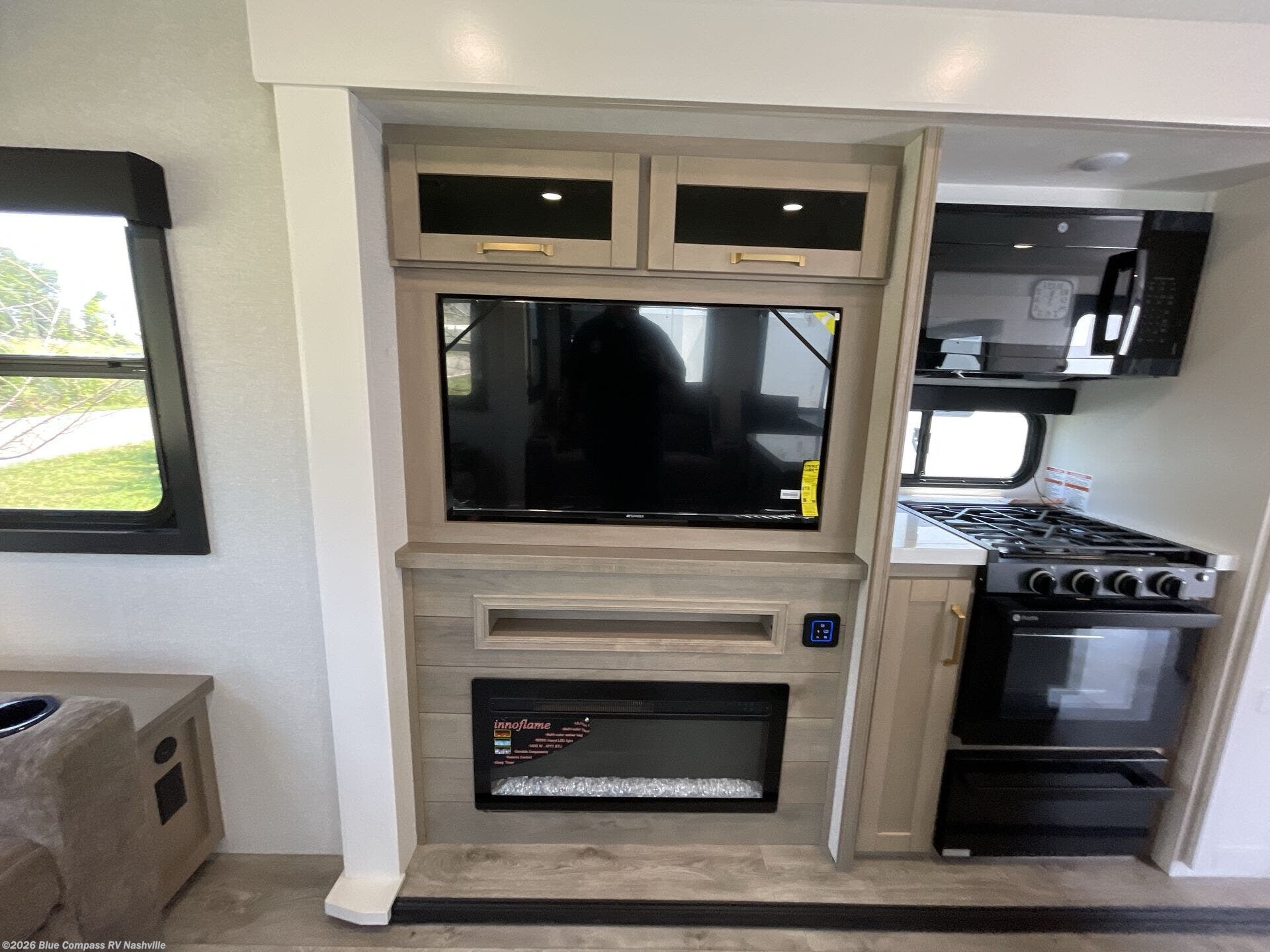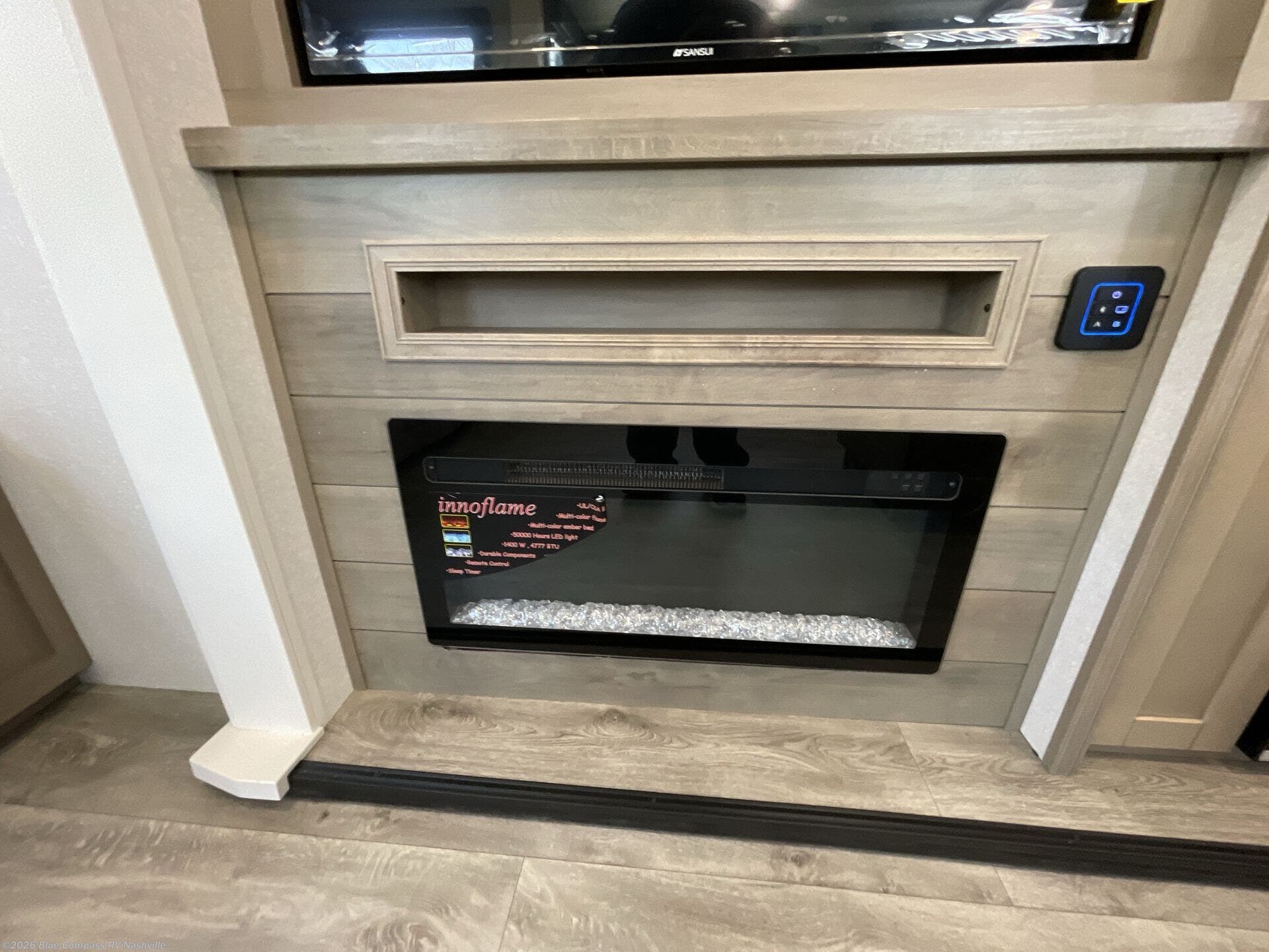 You will feel right at home camping in this travel trailer! It features a front private bedroom with an Olympic queen bed slide for more interior space, a dresser, a front wardrobe to hang your clothes, and a wardrobe that is prepped to add an optional washer and dryer. Start each morning getting squeaky clean in the full bathroom with the shower and then head to the kitchen to fry up some eggs on the stainless steel range. The kitchen island with a multi-functional sink will help make meal prepping easier too, plus there is a hutch to store your dishes. Enjoy a relaxing evening by the fireplace and watch your favorite movie with the entertainment center while sitting on either the rear tri-fold sofa or the theater seating!