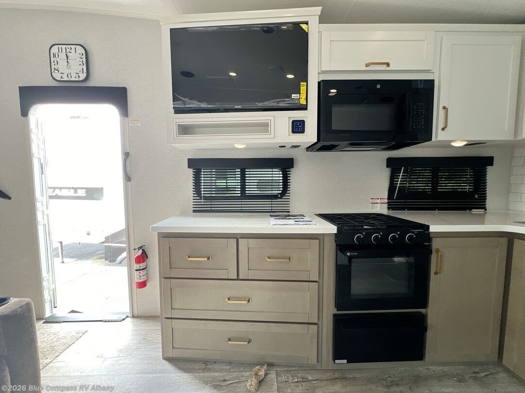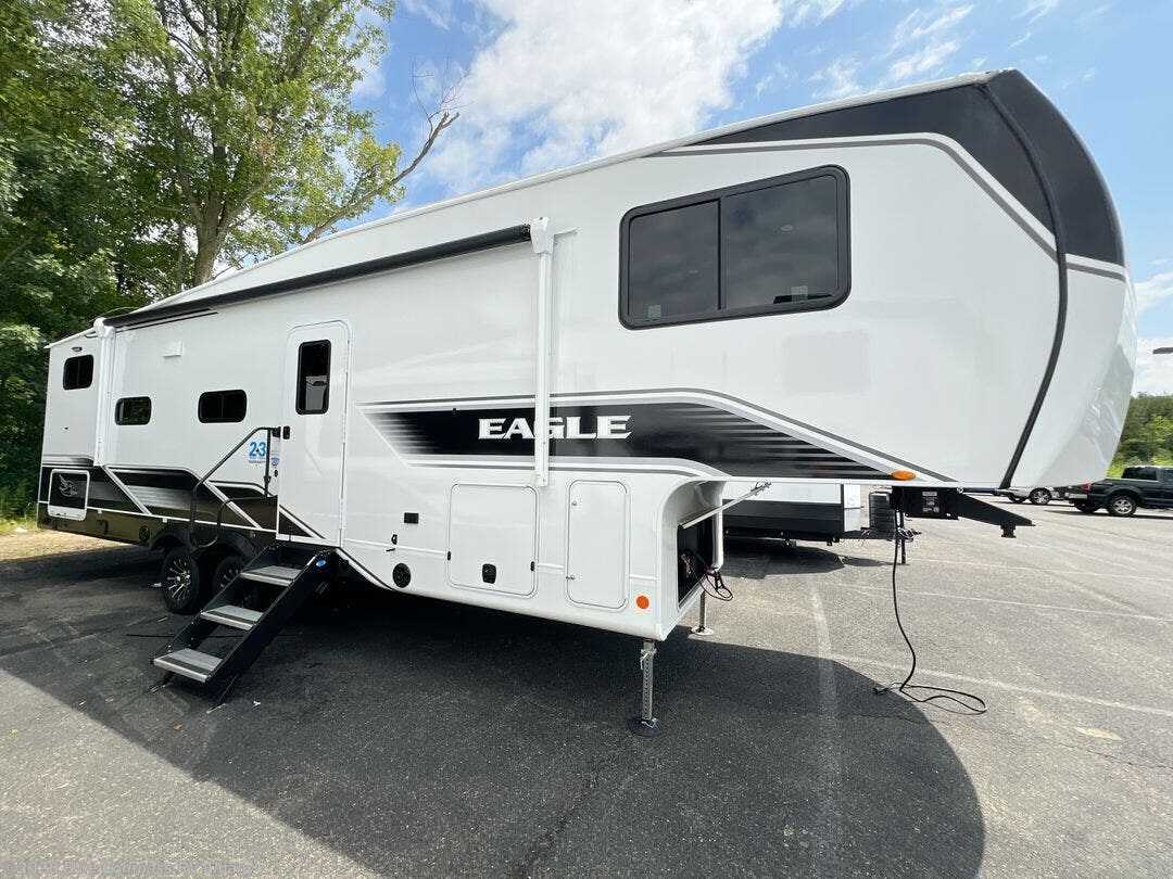 With any Eagle HT fifth wheel or travel trailer by Jayco you will enjoy a smooth drive thanks to the 4 Star Handling Package, Goodyear Endurance tires, and MORryde CRE-3000 rubberized suspension. The Customer Value Package includes amenities that are sure to make camping easier than ever, like the 60K on-demand water heater, Keyed-Alike lock system, 15,000 BTU "Whisper Quiet" A/C, and more. Handcrafted and glazed door/drawer fronts will make your space feel more like home, along with residential vinyl flooring throughout, GE appliances, and blackout roller shades with reflective side throughout to keep the sun out when you want to sleep in. Each model also includes a NuVo H2O water treatment system with filters included, interior and exterior "Blue Sync" audio connect with MB Quart Sound for your TV and phone, and 100% no floor vents for added comfort and convenience!