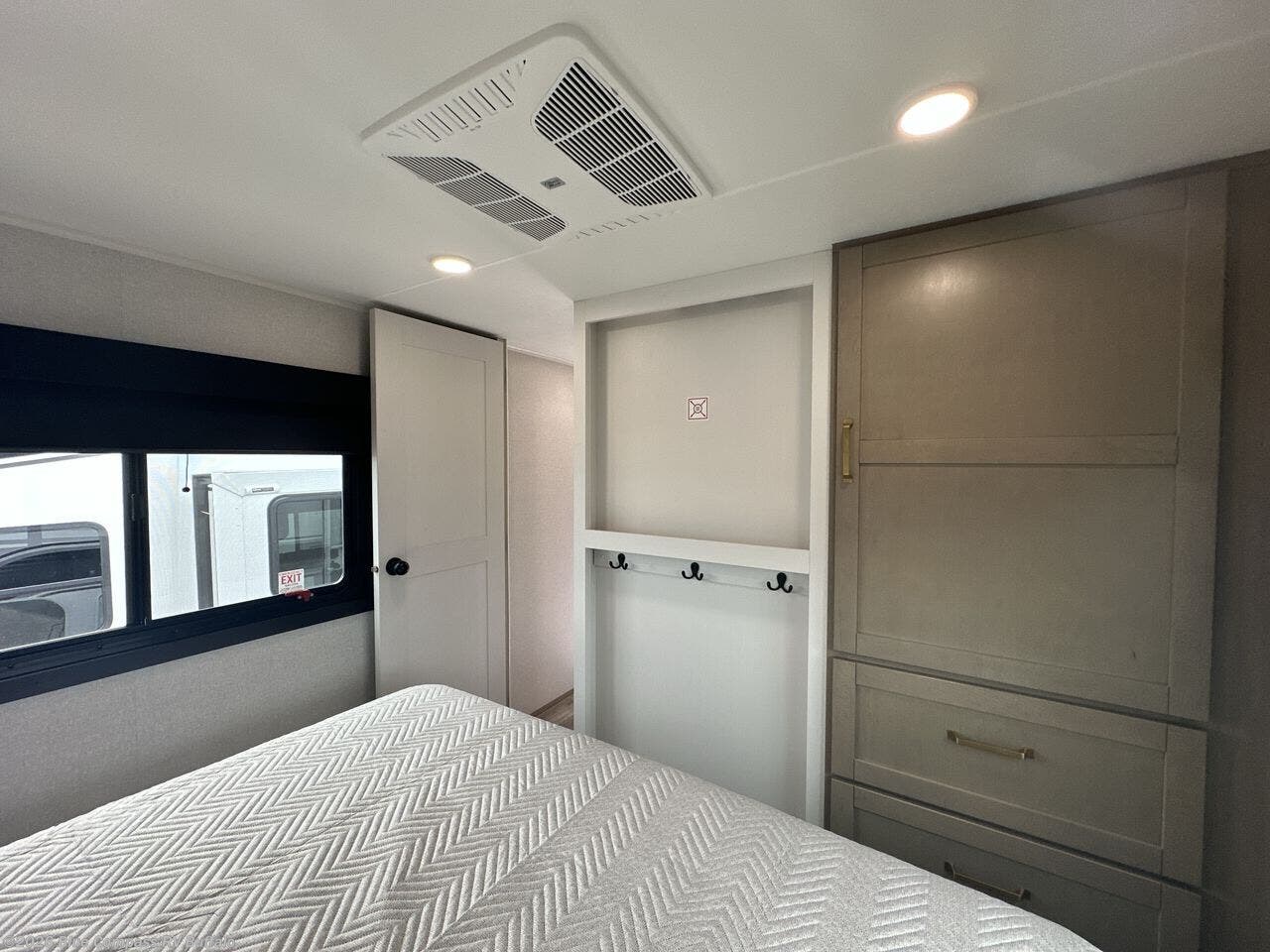 If you're needing a fifth wheel with more sleeping space, this unit will be perfect for you! There are double-size bunks in the back with a wardrobe for your guests' things and TV prep if you want to add a TV here. The front private bedroom up front will have you feeling right at home with its Olympic queen bed and dual wardrobes, and any additional guests you have can sleep on the U-shaped dinette within the slide out. There is also a theater seat here where you can relax with a good book in the evenings.