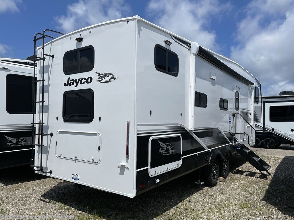 With any Eagle HT fifth wheel or travel trailer by Jayco you will enjoy a smooth drive thanks to the 4 Star Handling Package and MORryde CRE-3000 rubberized suspension. The Customer Value Package includes amenities that are sure to make camping easier than ever, like the 60K on-demand water heater, Keyed-Alike lock system, 15,000 BTU "Whisper Quiet" A/C, and more. Handcrafted door/drawer fronts will make your space feel more like home, along with residential vinyl flooring throughout, GE appliances, and blackout roller shades with reflective side throughout to keep the sun out when you want to sleep in. Each model also includes a NuVo H2O water treatment system with filters included, interior and exterior "Blue Sync" audio connect with MB Quart Sound for your TV and phone, and 100% no floor vents for added comfort and convenience!