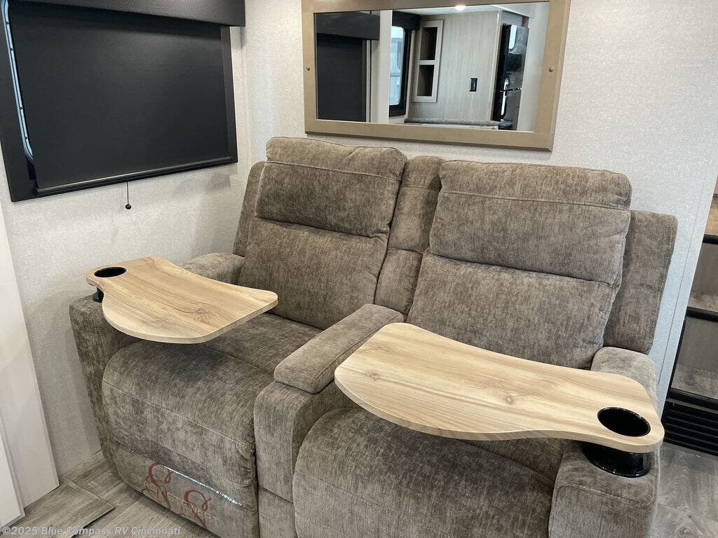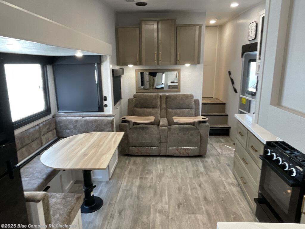 If you're needing a fifth wheel with more sleeping space, this unit will be perfect for you! There are double-size bunks in the back with a wardrobe for your guests' things and TV prep if you want to add a TV here. The front private bedroom up front will have you feeling right at home with its Olympic queen bed and dual wardrobes, and any additional guests you have can sleep on the U-shaped dinette within the slide out. There is also a theater seat here where you can relax with a good book in the evenings.