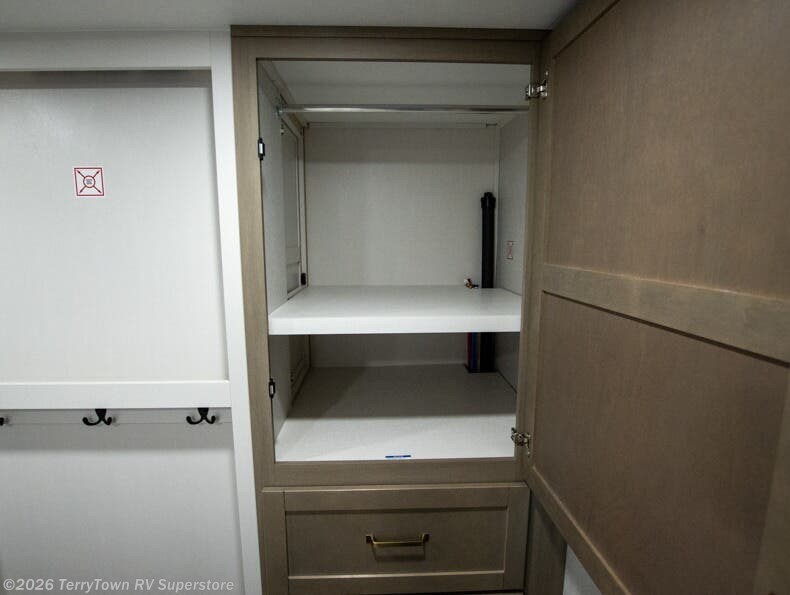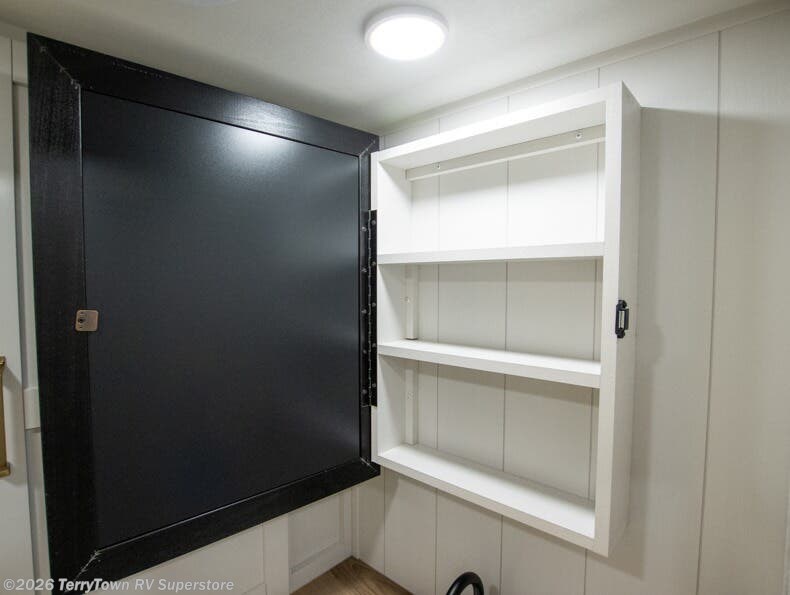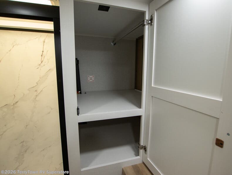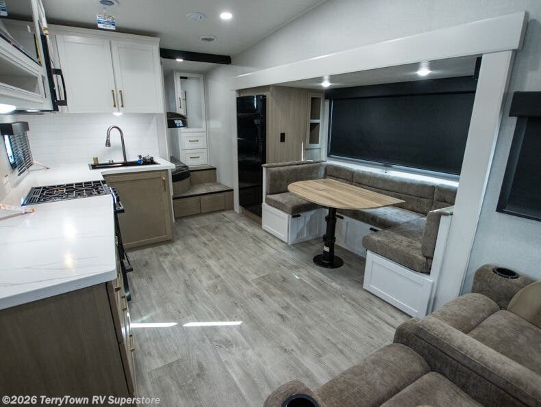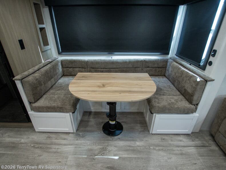 If you're needing a fifth wheel with more sleeping space, this unit will be perfect for you! There are double-size bunks in the back with a wardrobe for your guests' things and TV prep if you want to add a TV here. The front private bedroom up front will have you feeling right at home with its Olympic queen bed and dual wardrobes, and any additional guests you have can sleep on the U-shaped dinette within the slide out. There is also a theater seat here where you can relax with a good book in the evenings.