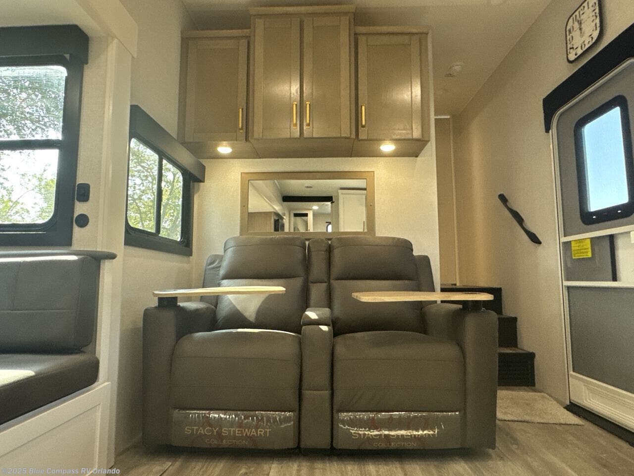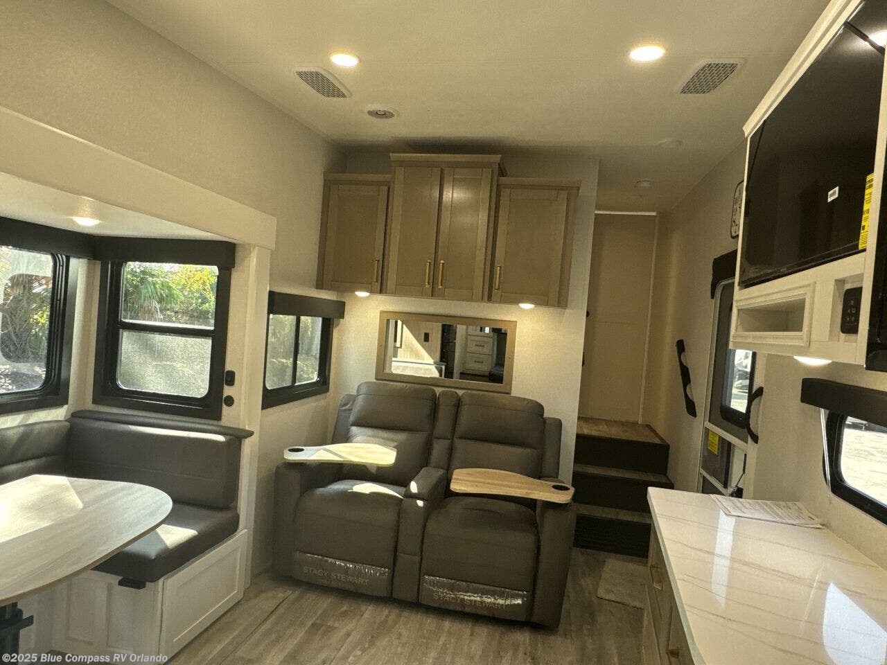 If you're needing a fifth wheel with more sleeping space, this unit will be perfect for you! There are double-size bunks in the back with a wardrobe for your guests' things and TV prep if you want to add a TV here. The front private bedroom up front will have you feeling right at home with its Olympic queen bed and dual wardrobes, and any additional guests you have can sleep on the U-shaped dinette within the slide out. There is also a theater seat here where you can relax with a good book in the evenings.