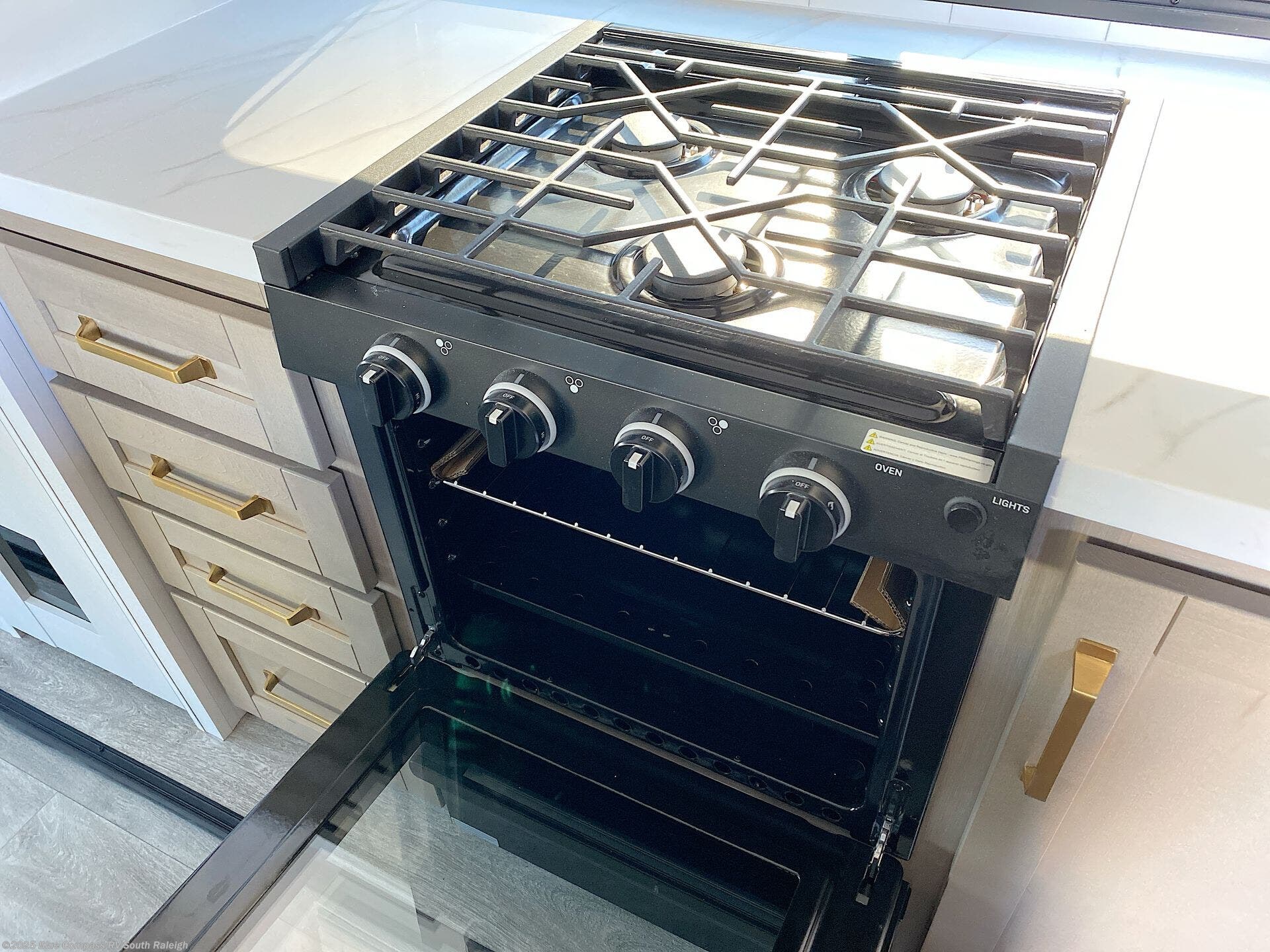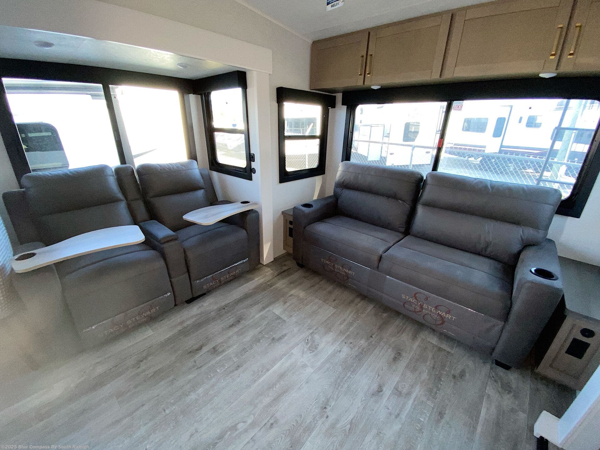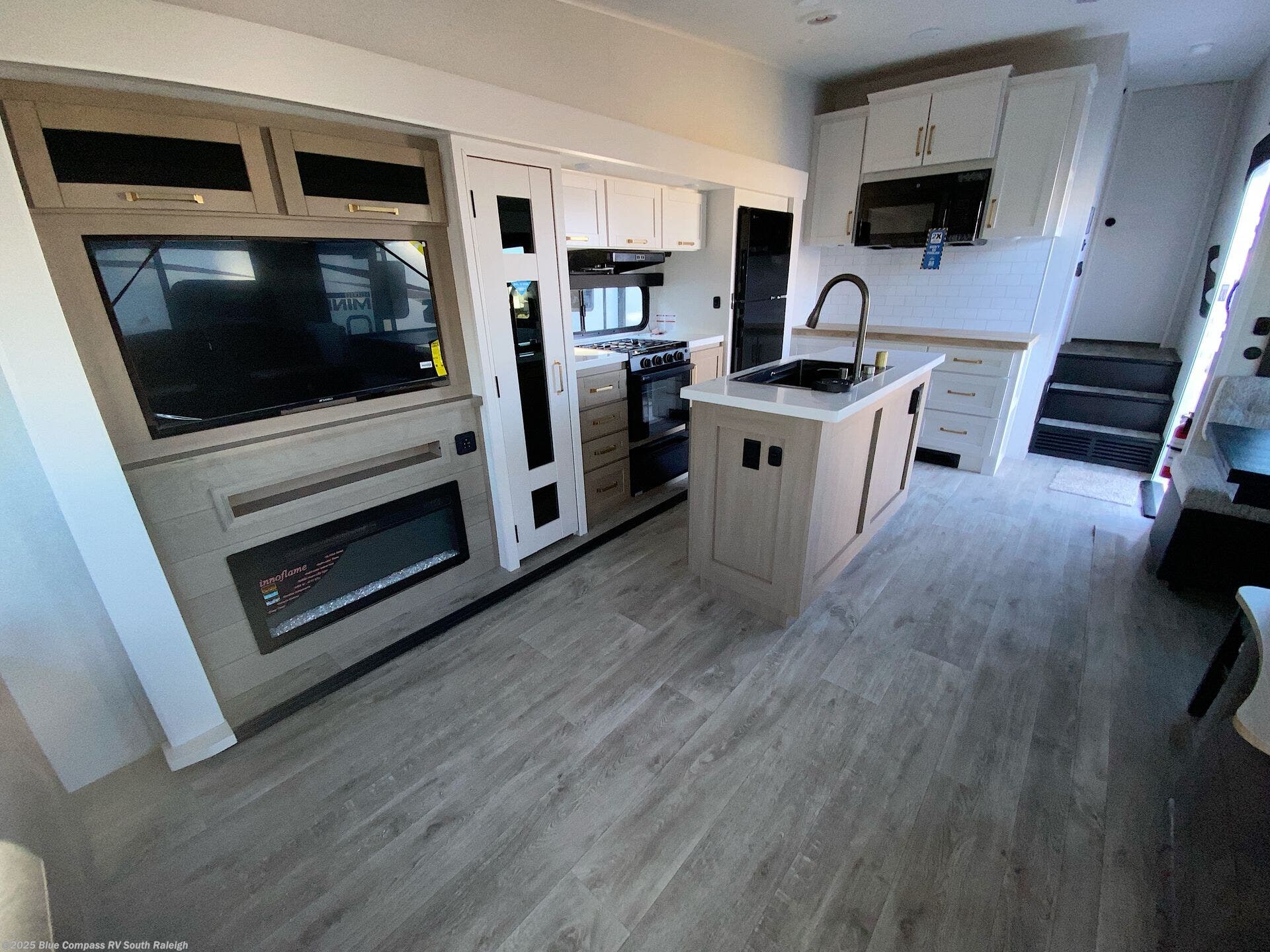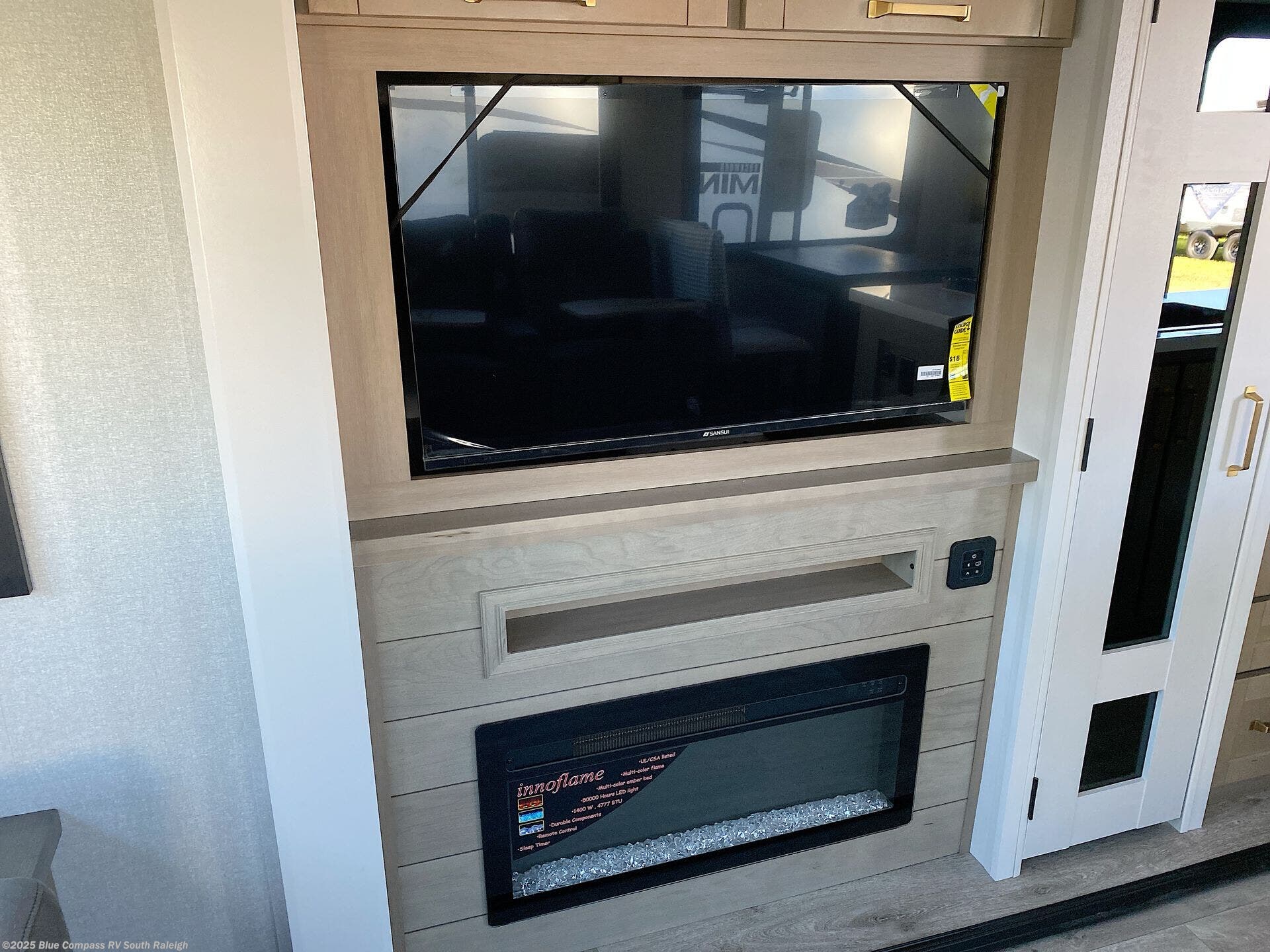 You will love how much interior space you have in this fifth wheel thanks to the dual opposing slides in the combined kitchen and living area! While your crew is relaxing on the theater seat or tri-fold sofa, you can prepare dinner on the GE black and stainless 21" range. There is also an entertainment center and fireplace across from the theater seat for easy viewing, and the table and chairs with a bench will be the perfect place to play a board game at. Head to the front to enjoy the private bedroom with an Olympic queen bed, and the full bath is close by for easy nighttime use!