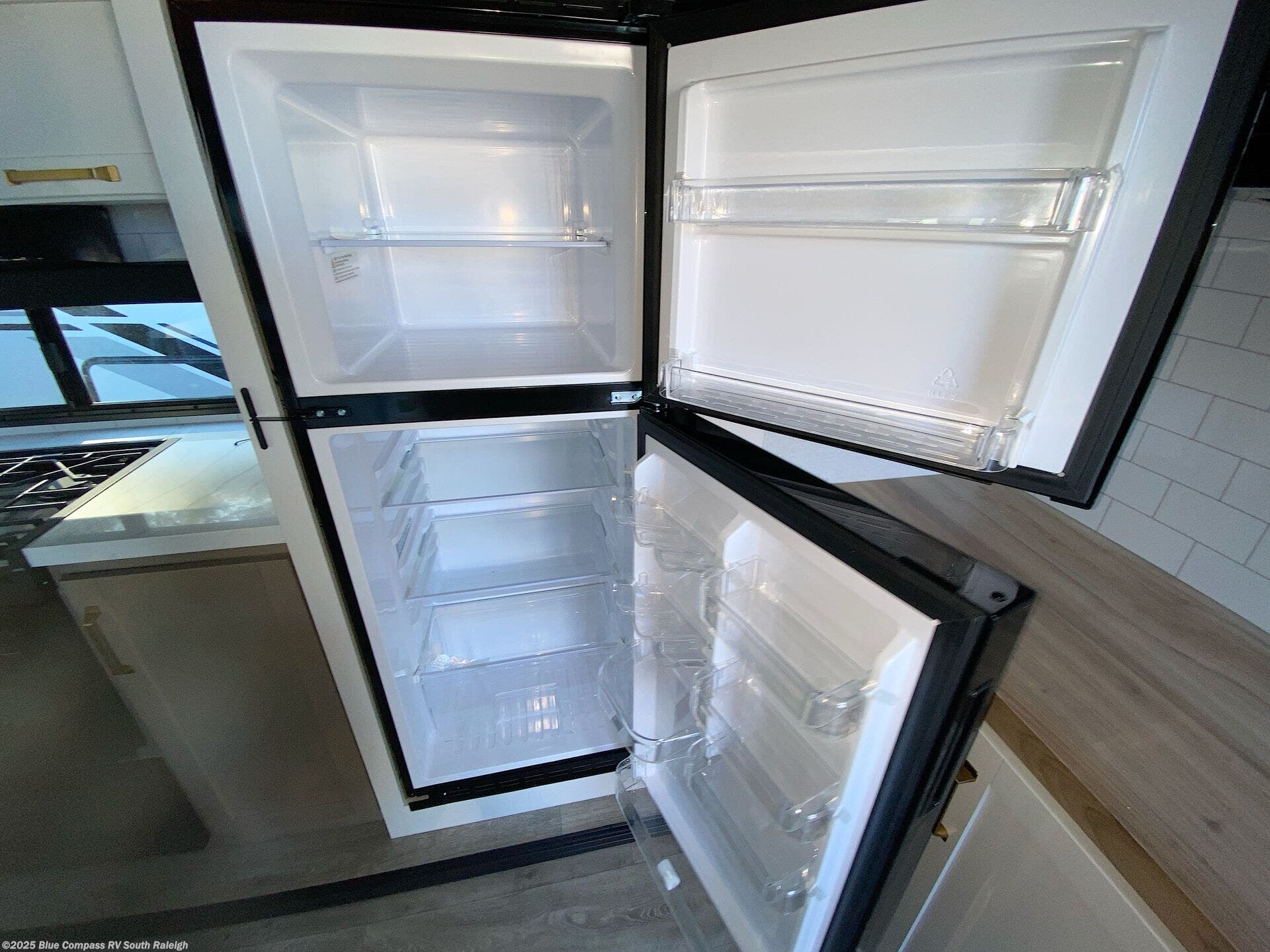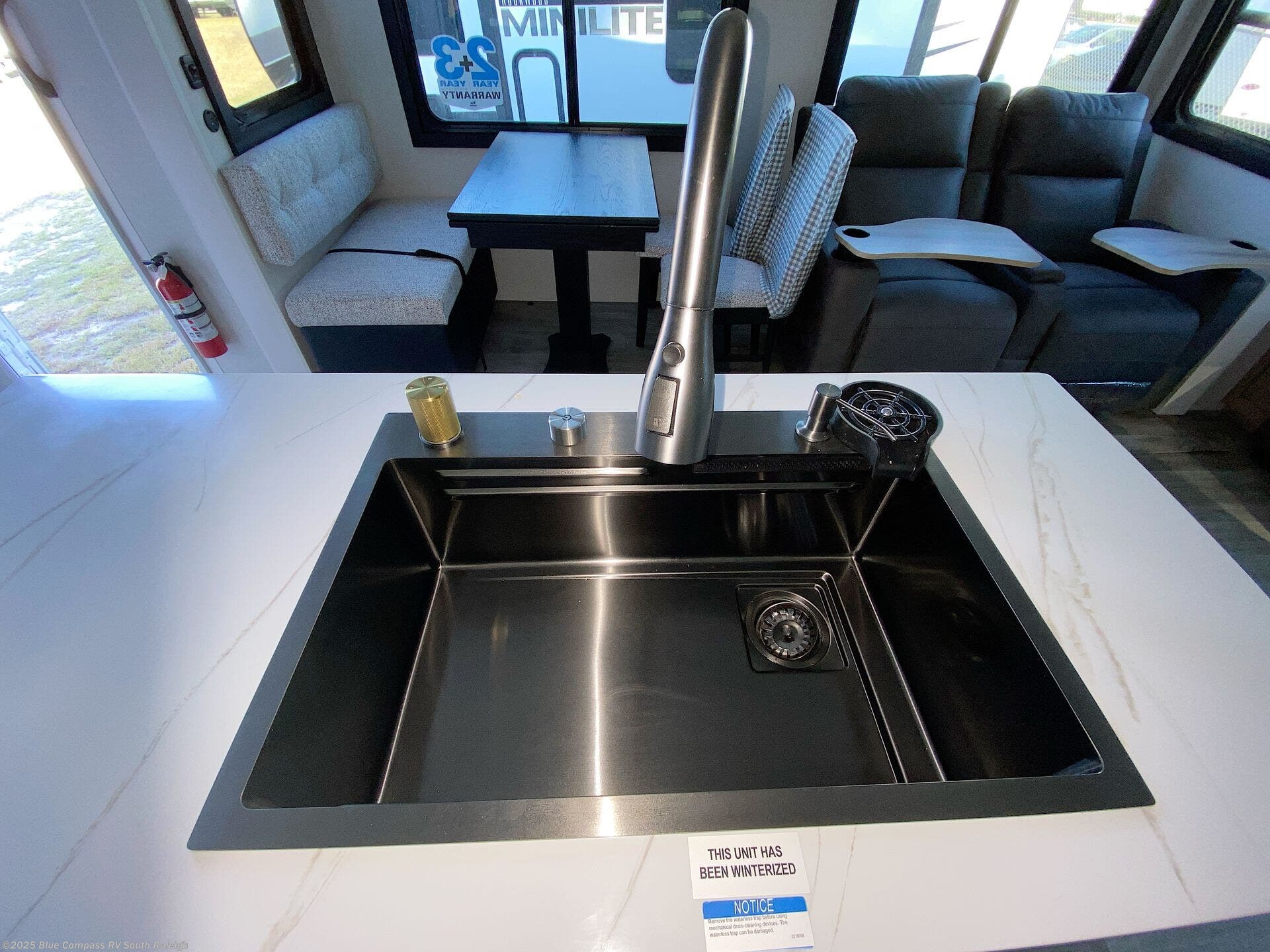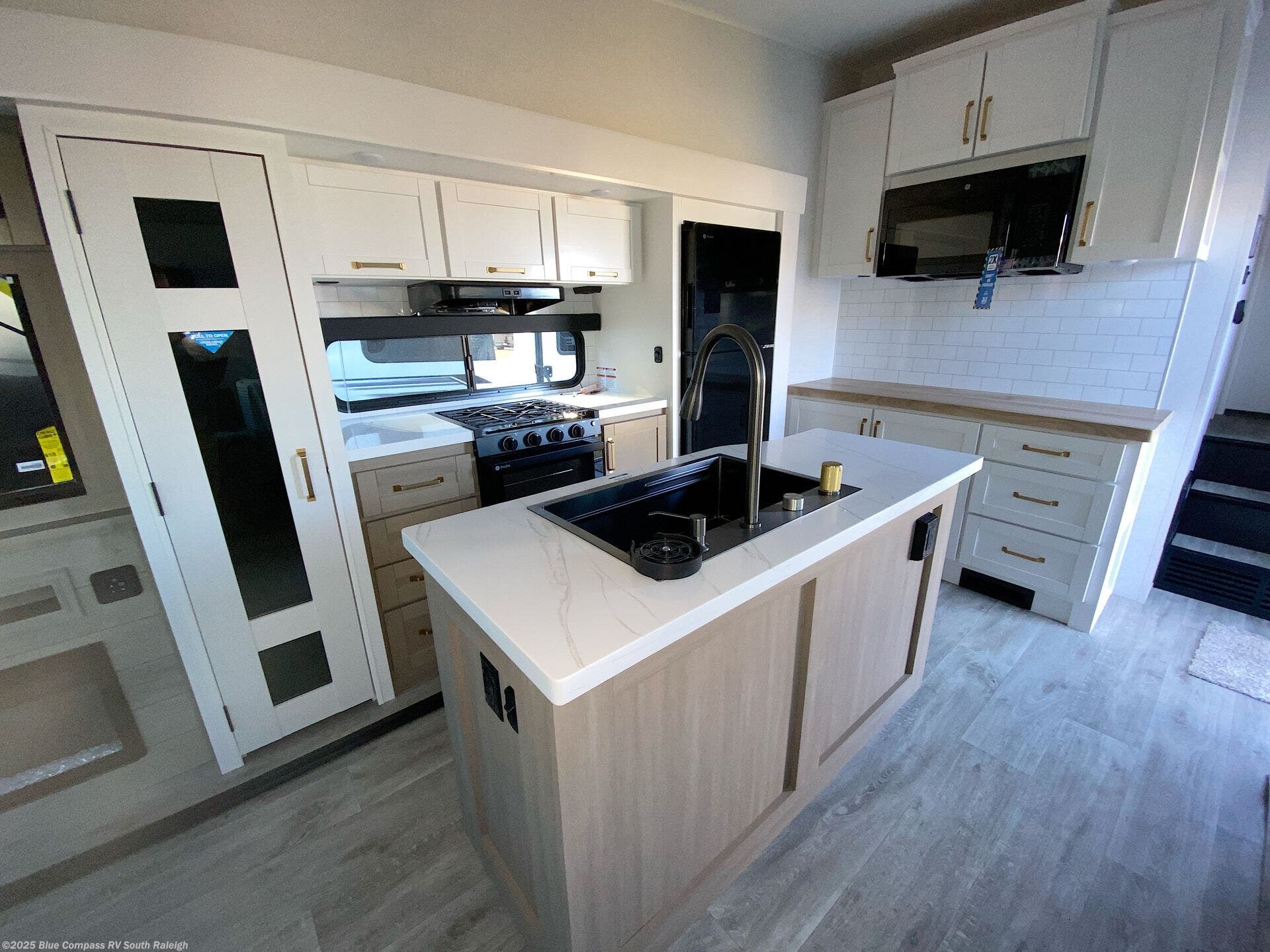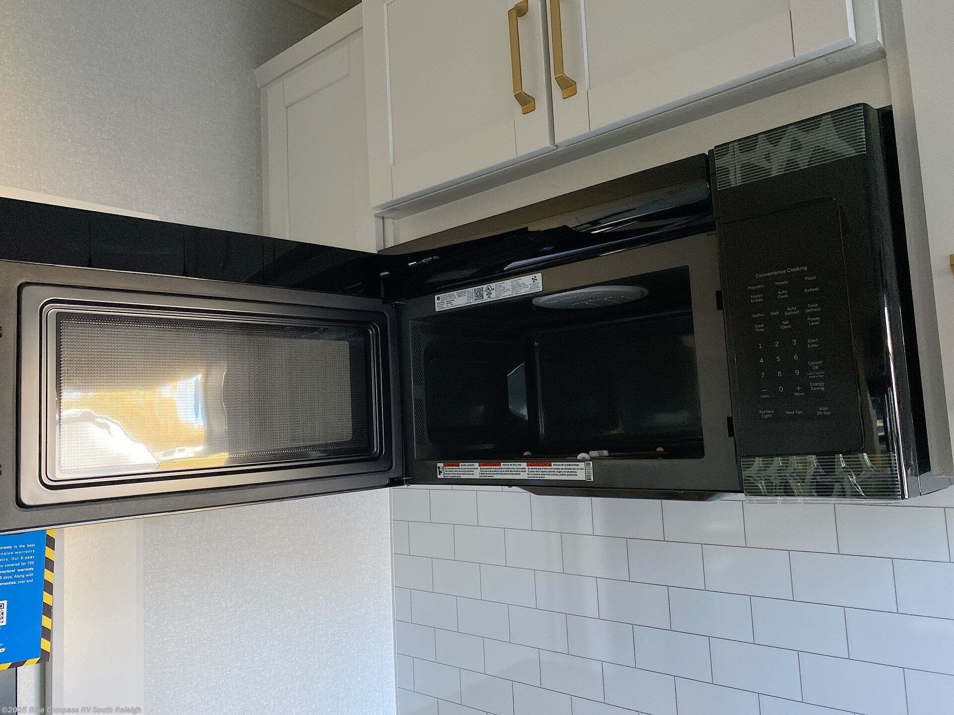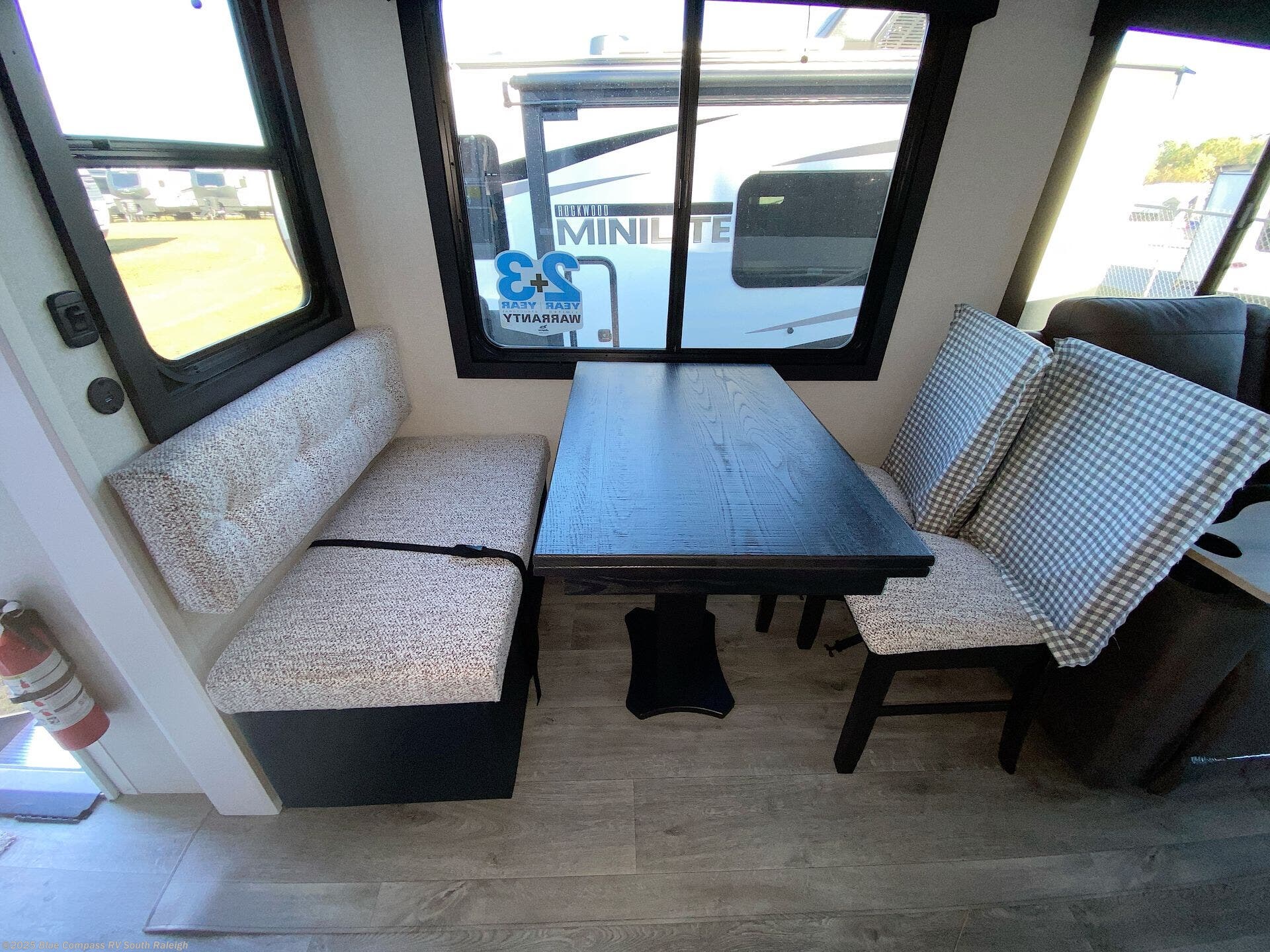 You will love how much interior space you have in this fifth wheel thanks to the dual opposing slides in the combined kitchen and living area! While your crew is relaxing on the theater seat or tri-fold sofa, you can prepare dinner on the GE black and stainless 21" range. There is also an entertainment center and fireplace across from the theater seat for easy viewing, and the table and chairs with a bench will be the perfect place to play a board game at. Head to the front to enjoy the private bedroom with an Olympic queen bed, and the full bath is close by for easy nighttime use!