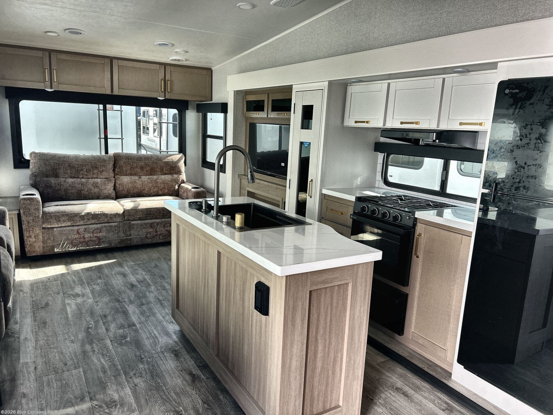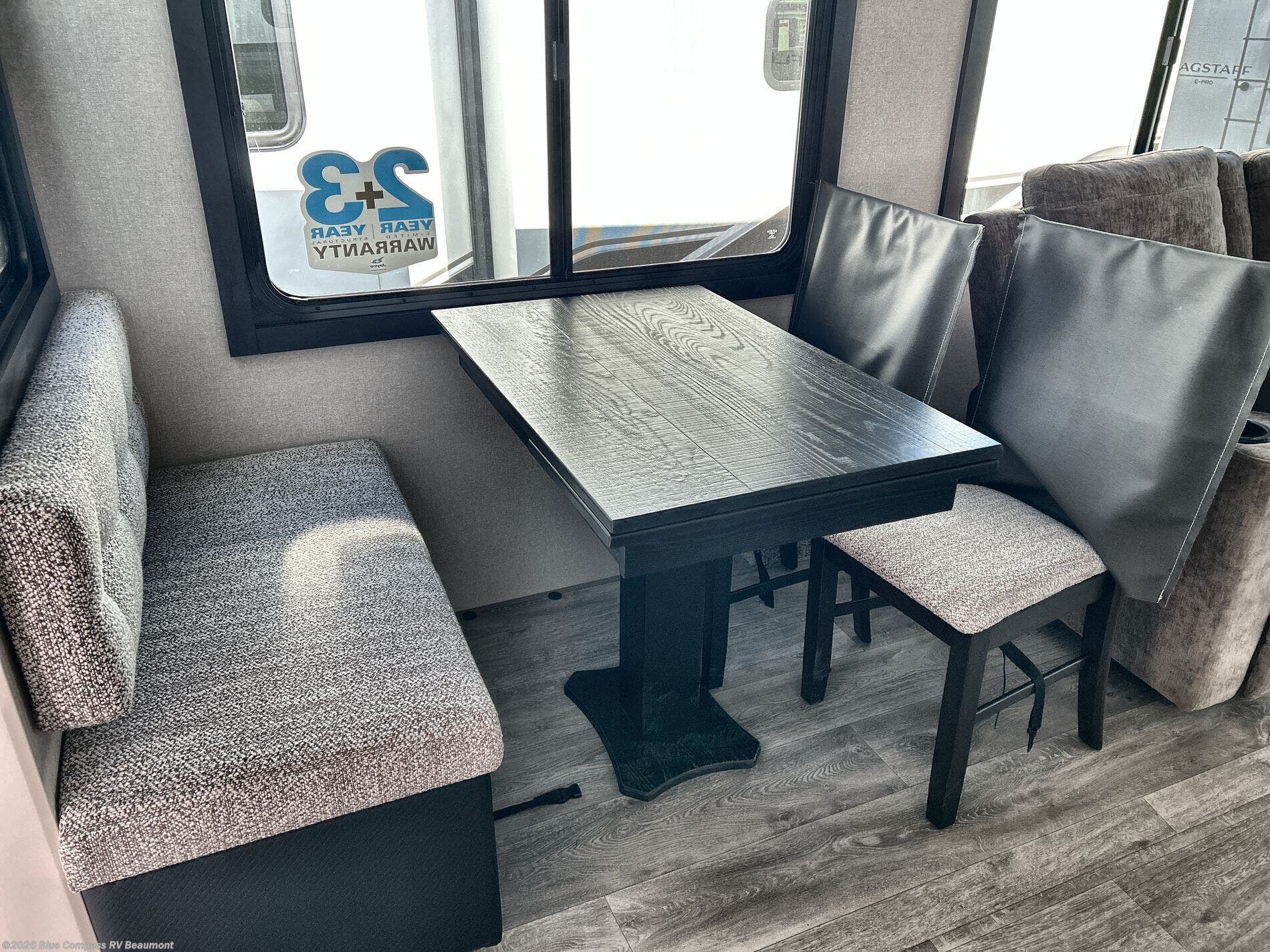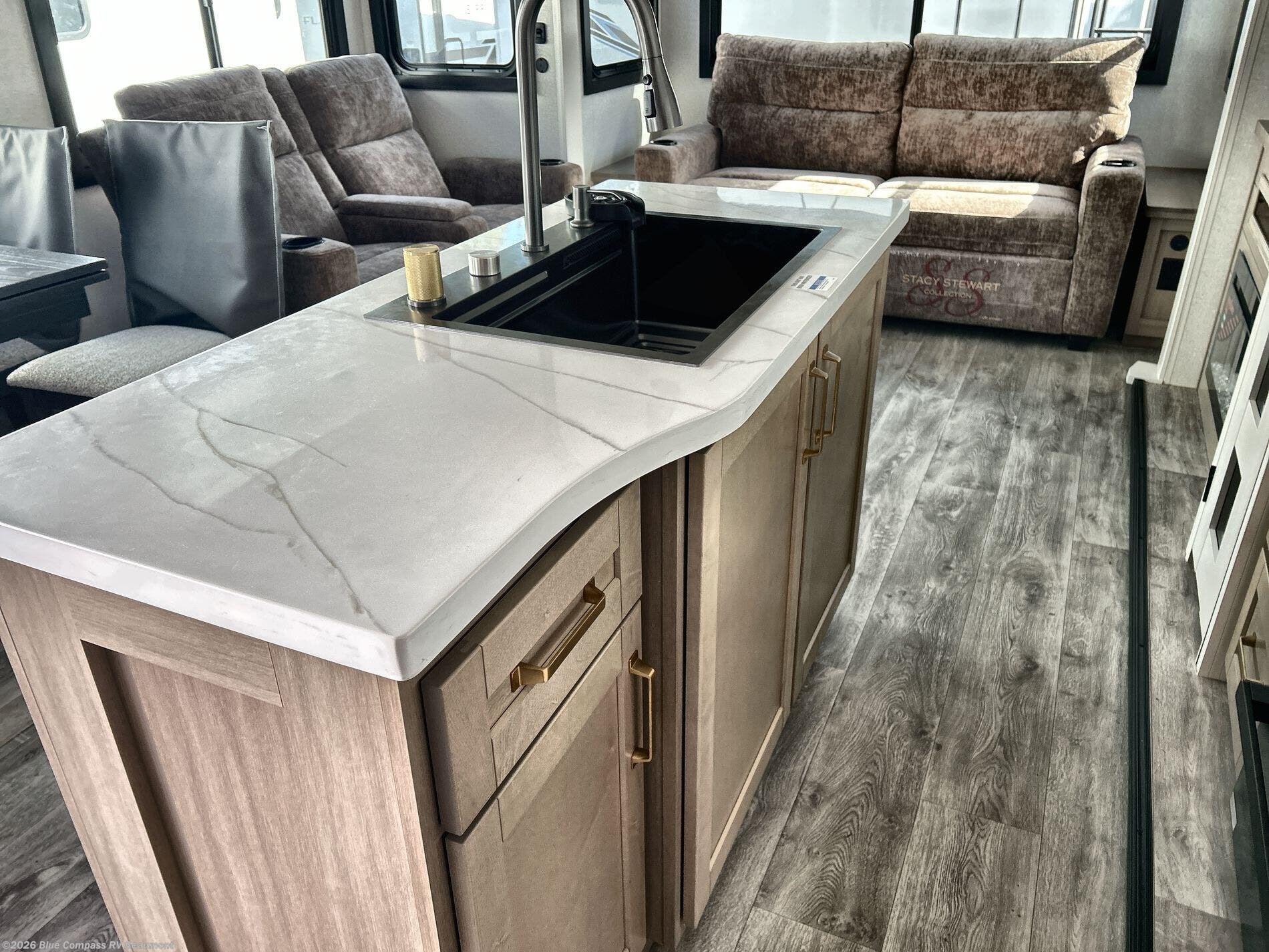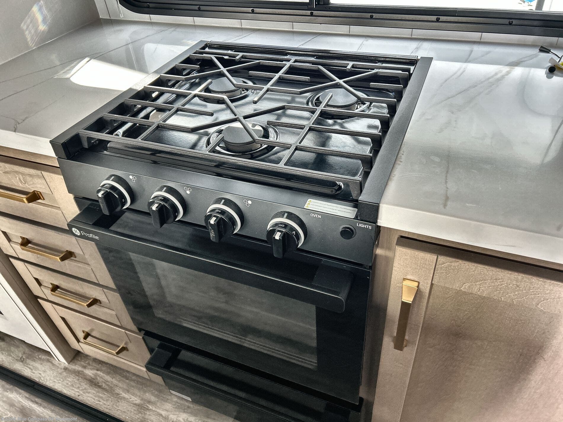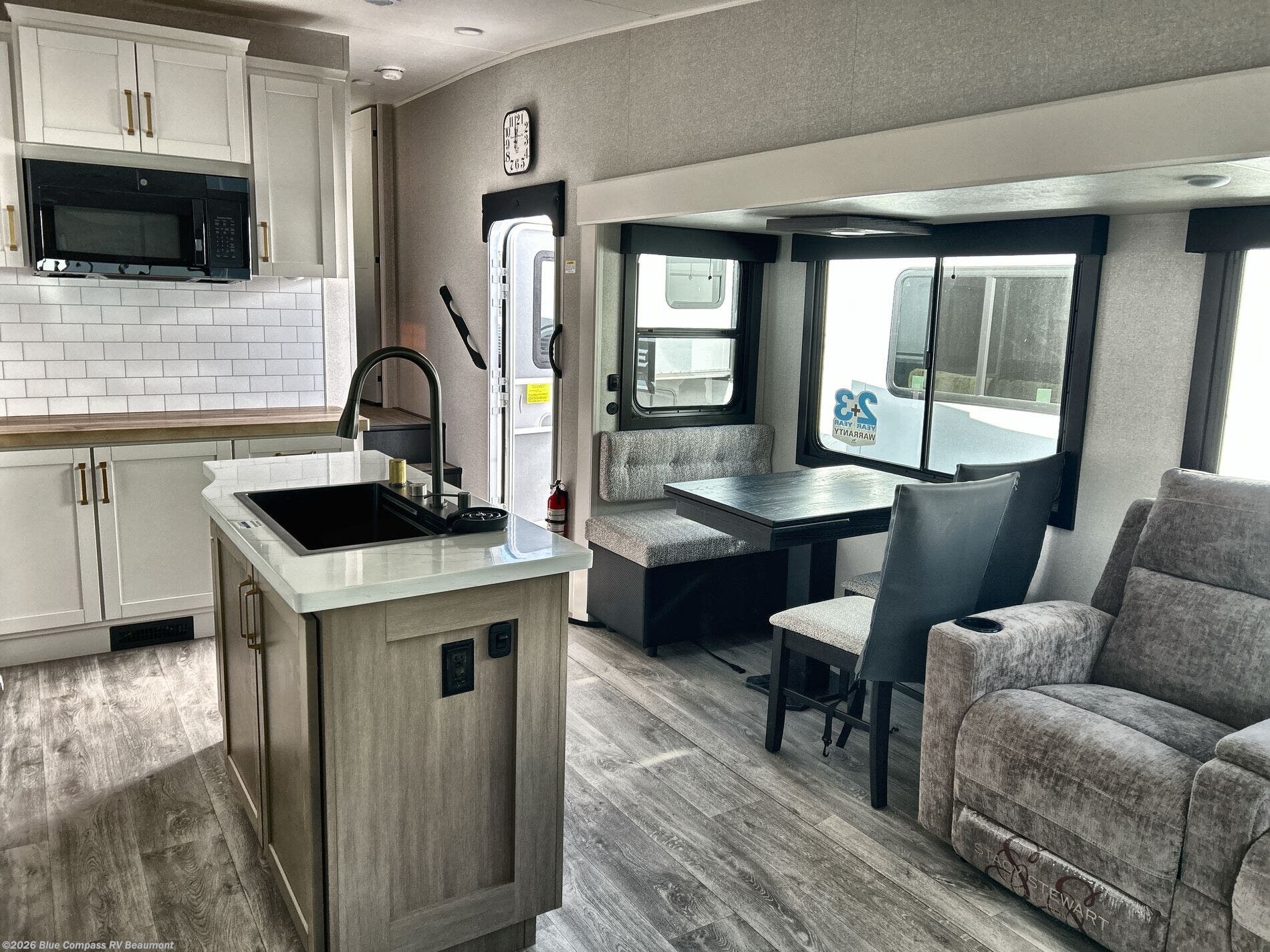 You will love how much interior space you have in this fifth wheel thanks to the dual opposing slides in the combined kitchen and living area! While your crew is relaxing on the theater seat or tri-fold sofa, you can prepare dinner on the GE black and stainless 21" range. There is also an entertainment center and fireplace across from the theater seat for easy viewing, and the table and chairs with a bench will be the perfect place to play a board game at. Head to the front to enjoy the private bedroom with an Olympic queen bed, and the full bath is close by for easy nighttime use!