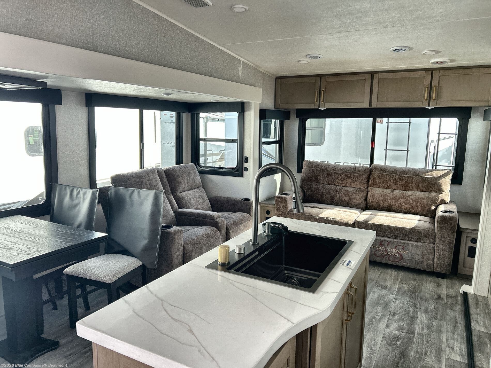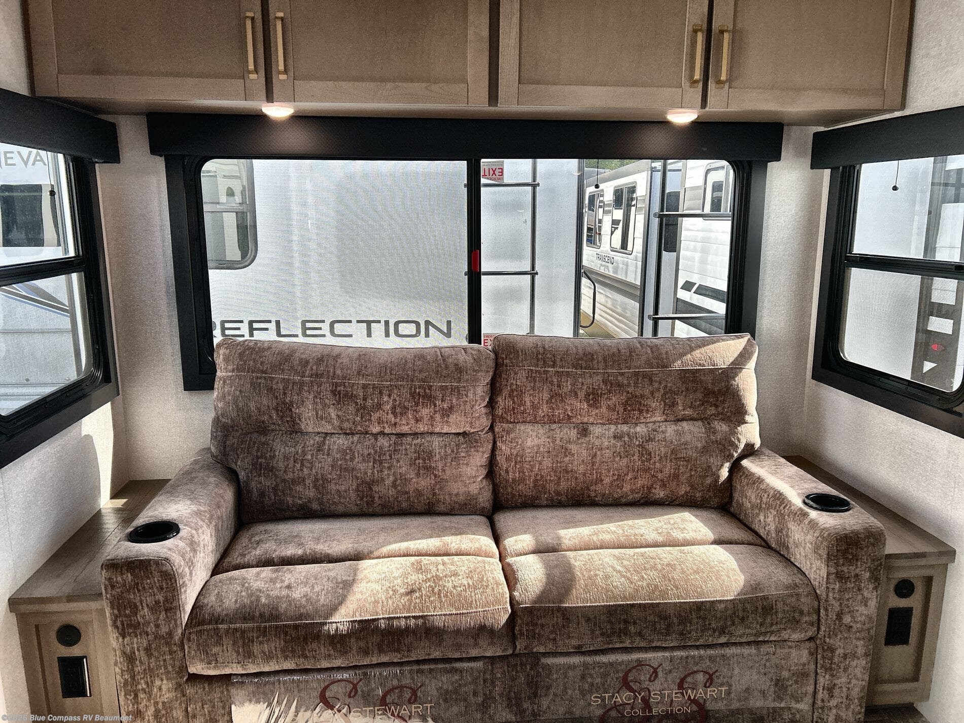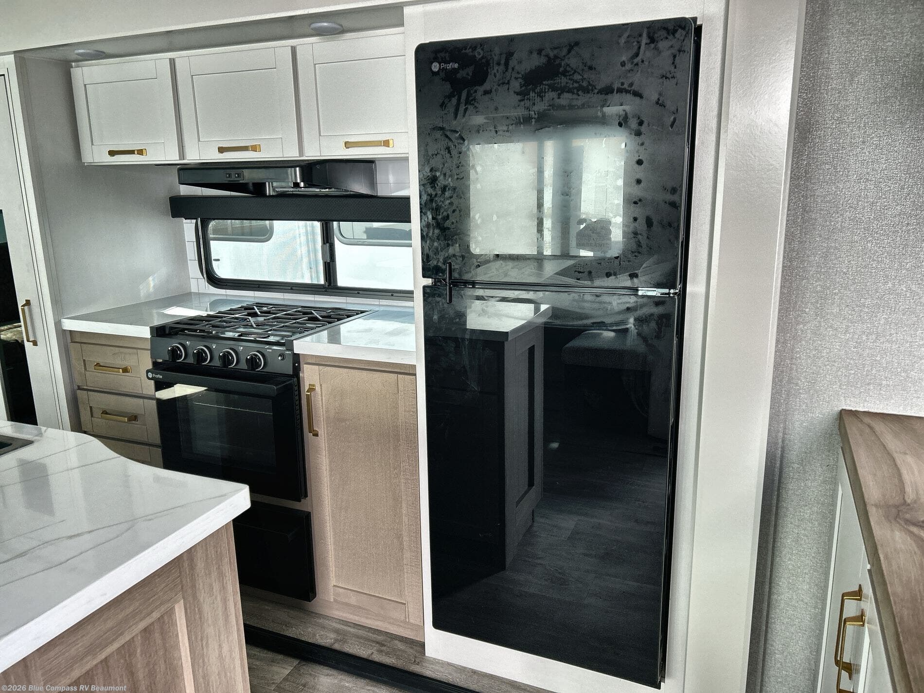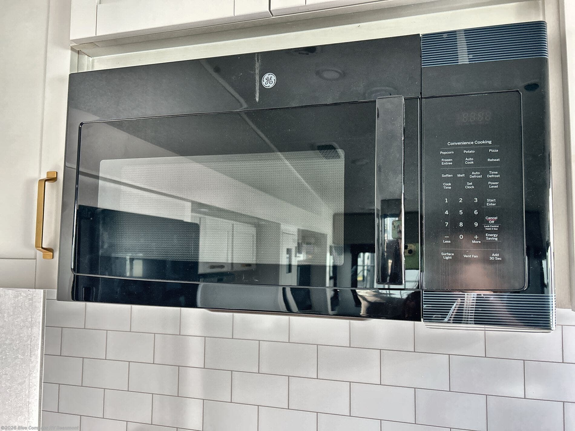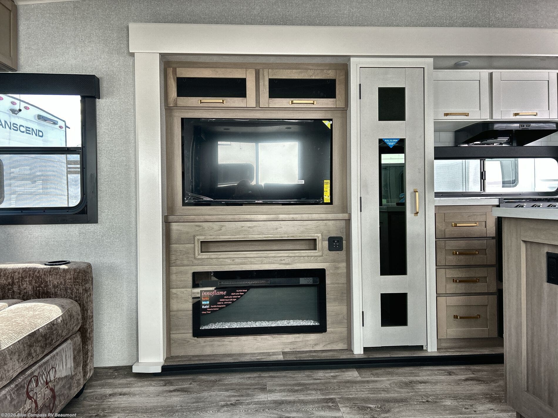 You will love how much interior space you have in this fifth wheel thanks to the dual opposing slides in the combined kitchen and living area! While your crew is relaxing on the theater seat or tri-fold sofa, you can prepare dinner on the GE black and stainless 21" range. There is also an entertainment center and fireplace across from the theater seat for easy viewing, and the table and chairs with a bench will be the perfect place to play a board game at. Head to the front to enjoy the private bedroom with an Olympic queen bed, and the full bath is close by for easy nighttime use!