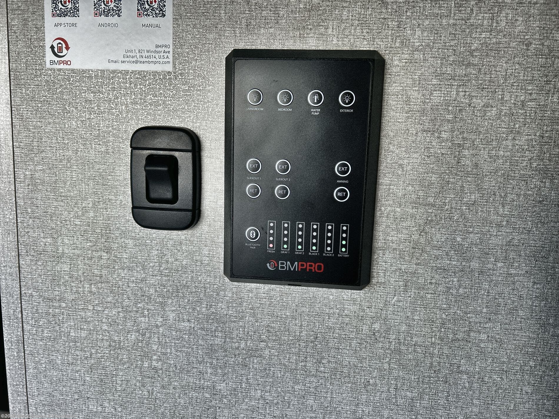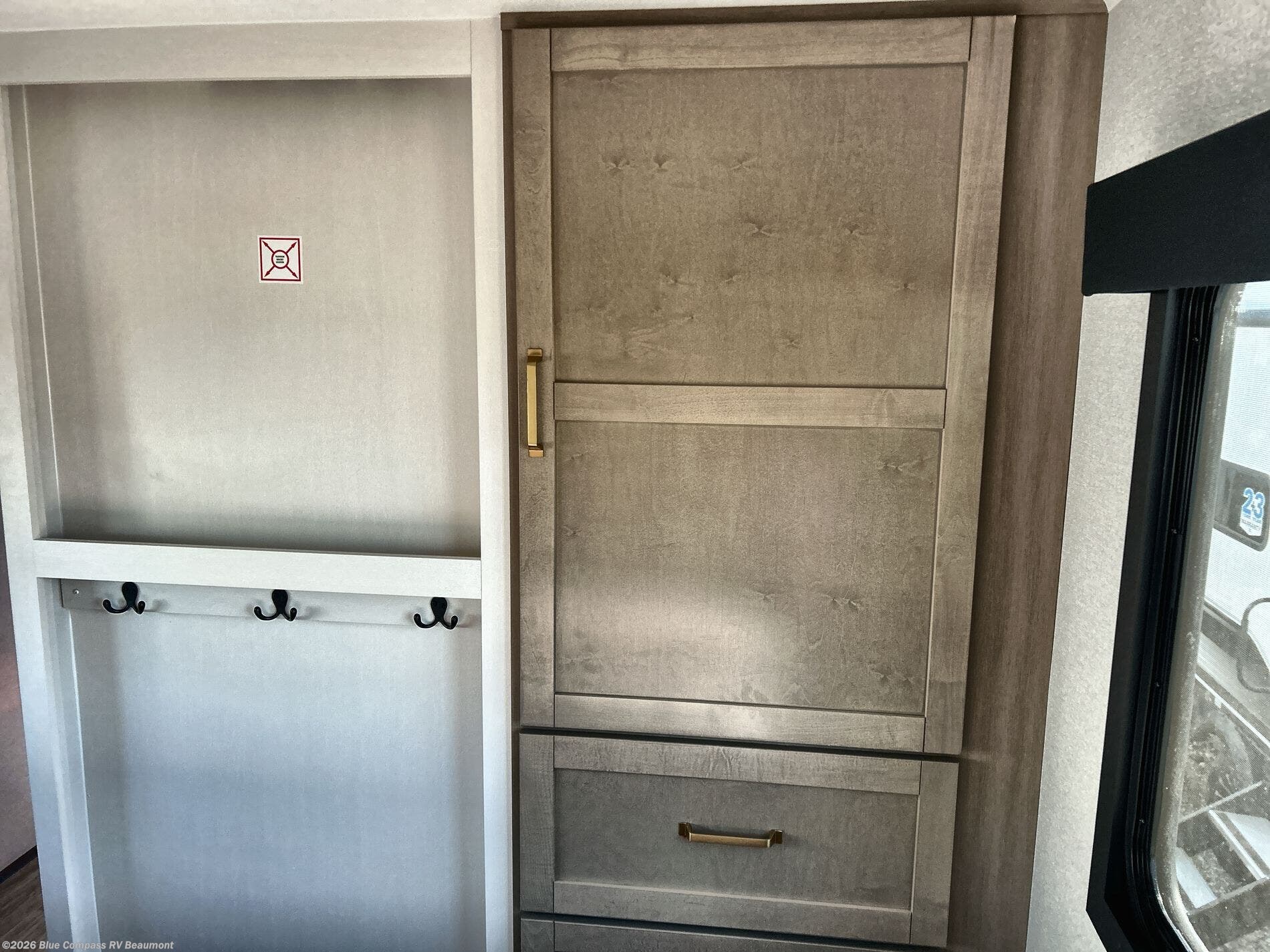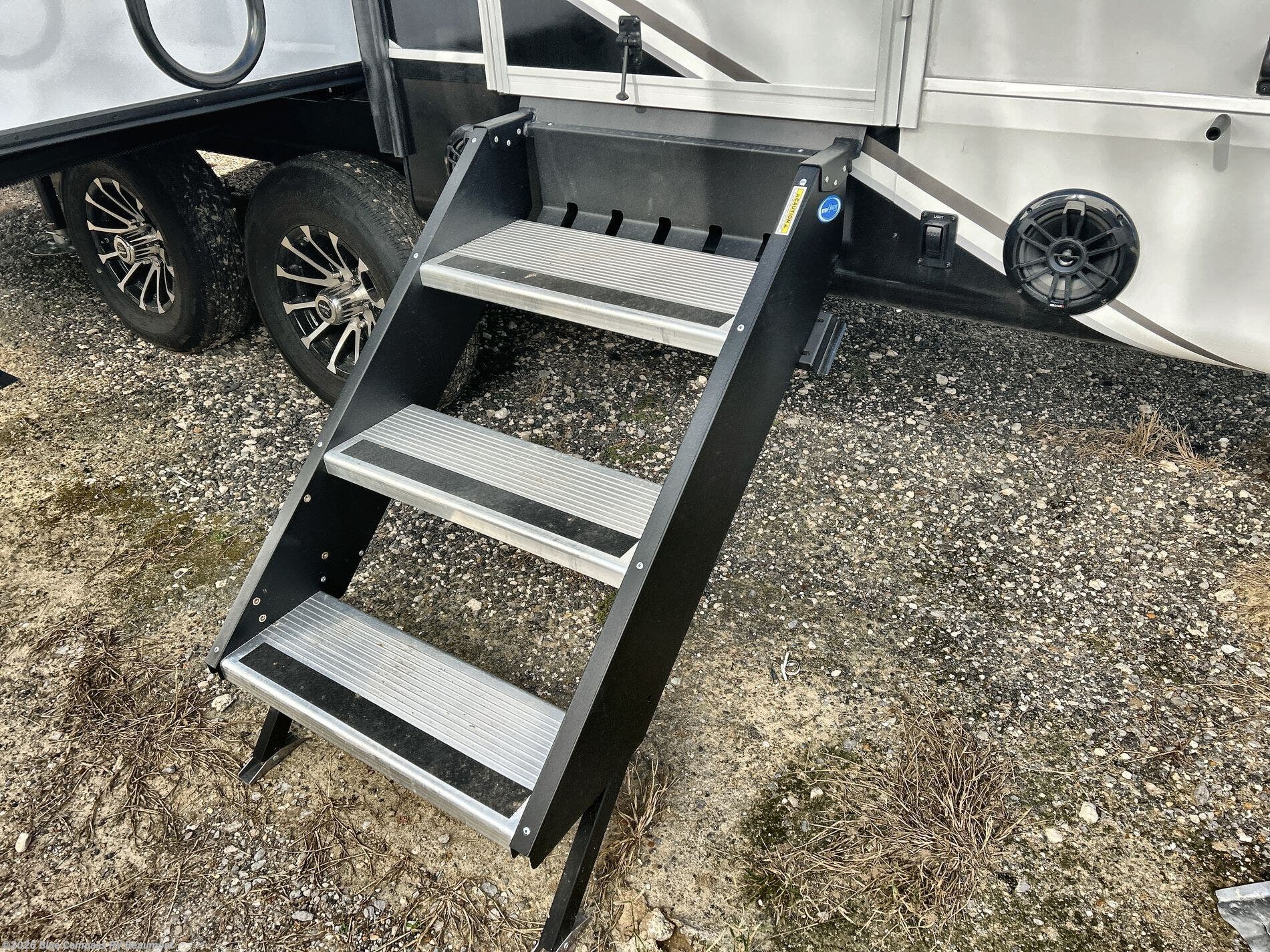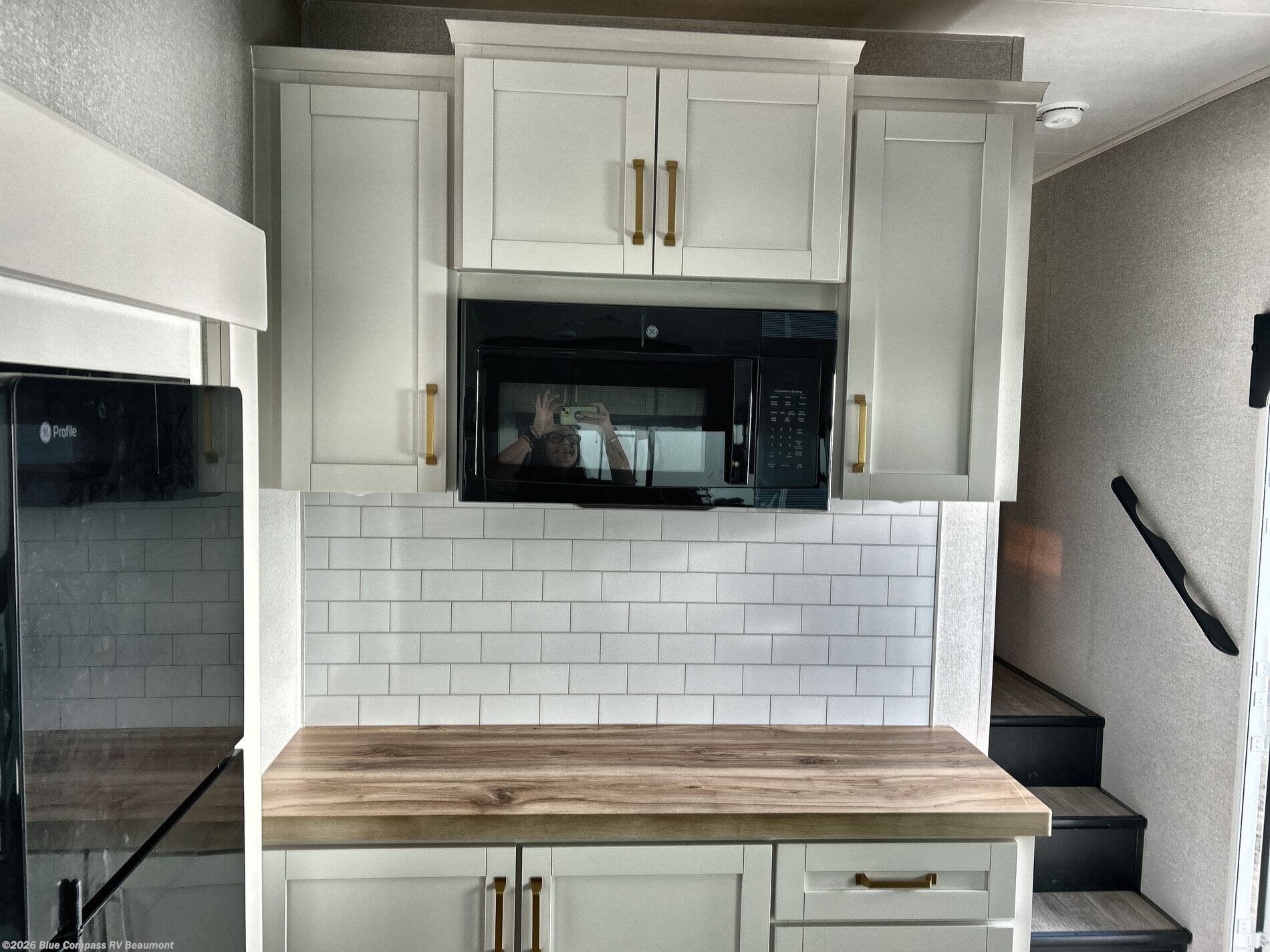 You will love how much interior space you have in this fifth wheel thanks to the dual opposing slides in the combined kitchen and living area! While your crew is relaxing on the theater seat or tri-fold sofa, you can prepare dinner on the GE black and stainless 21" range. There is also an entertainment center and fireplace across from the theater seat for easy viewing, and the table and chairs with a bench will be the perfect place to play a board game at. Head to the front to enjoy the private bedroom with an Olympic queen bed, and the full bath is close by for easy nighttime use!