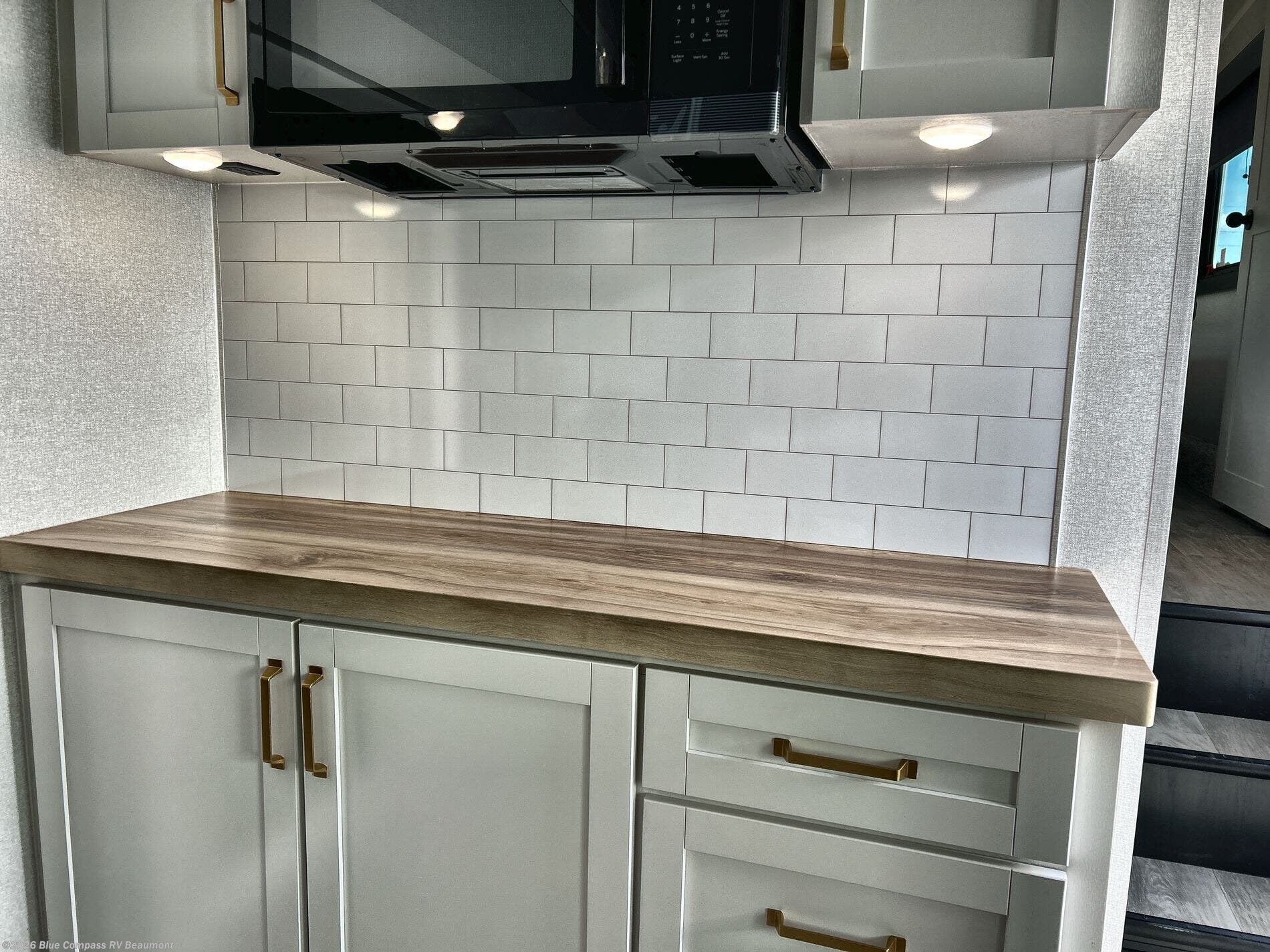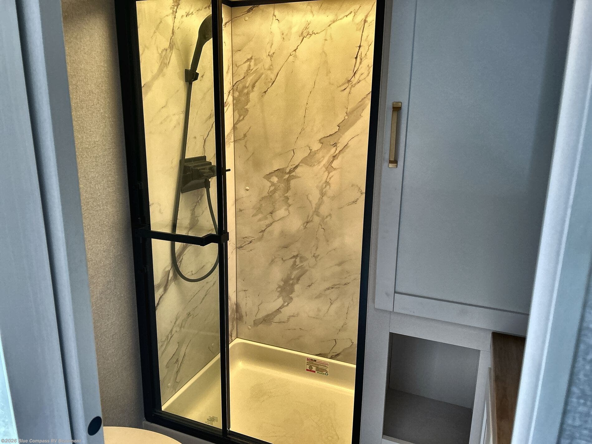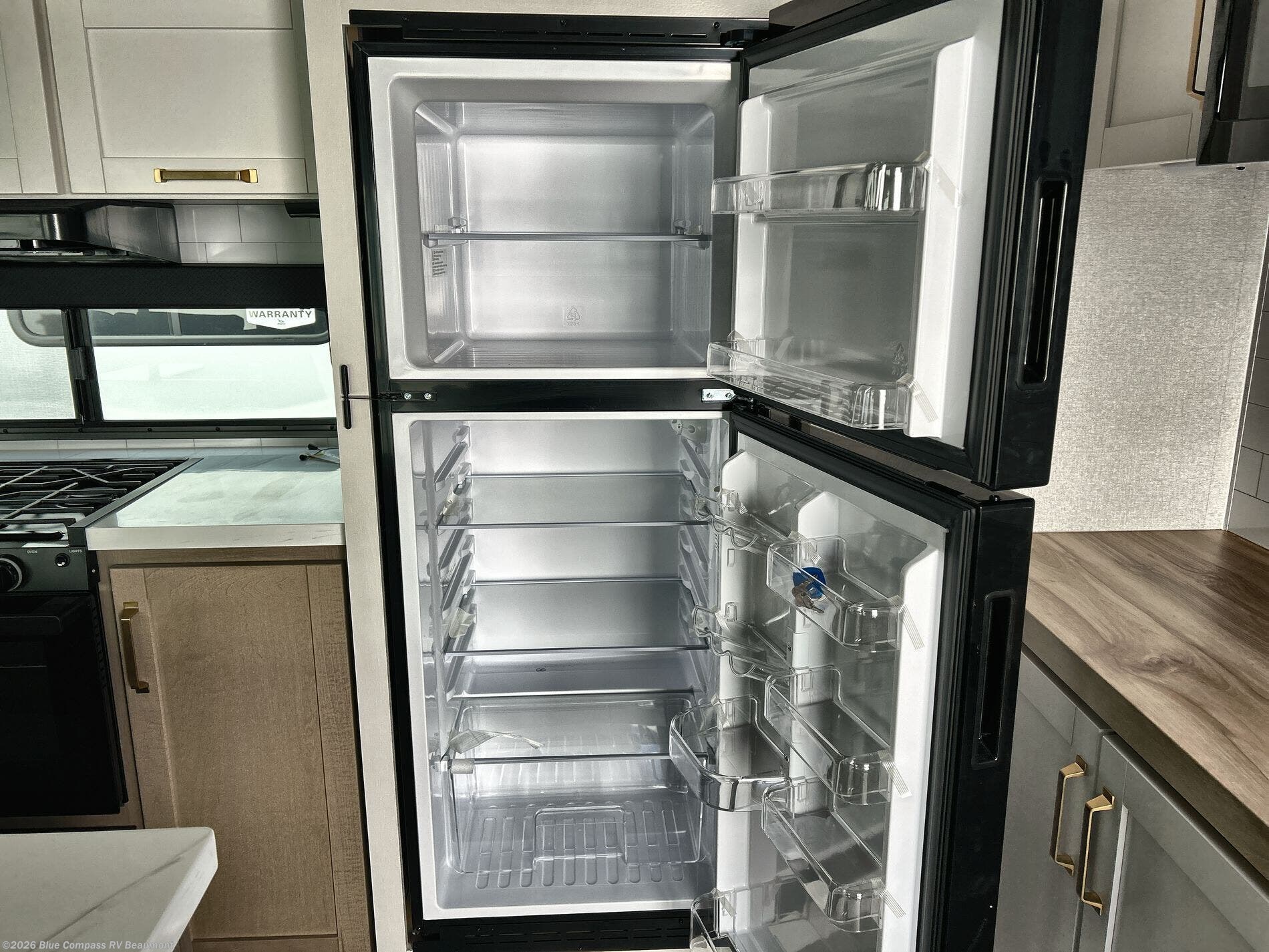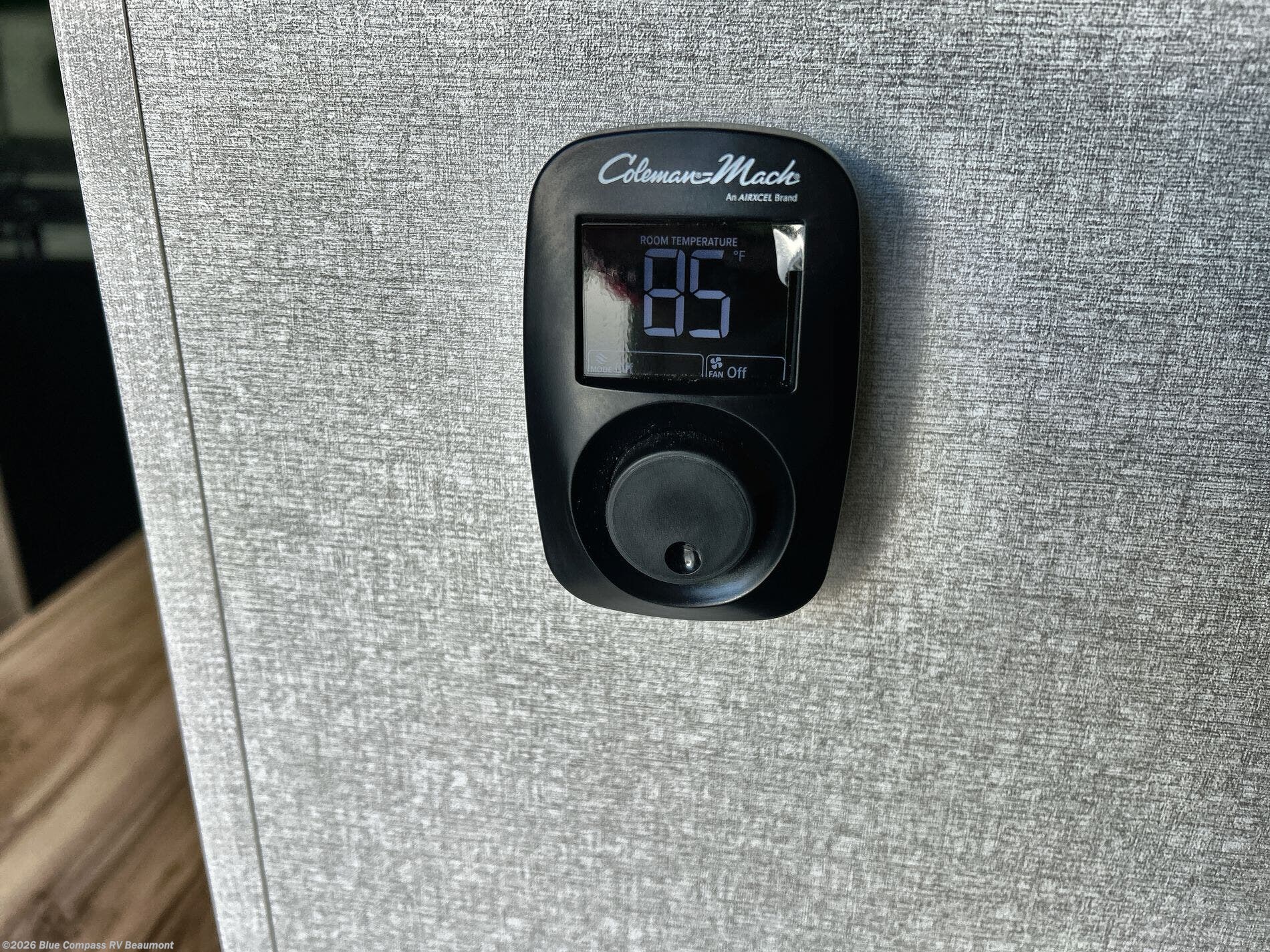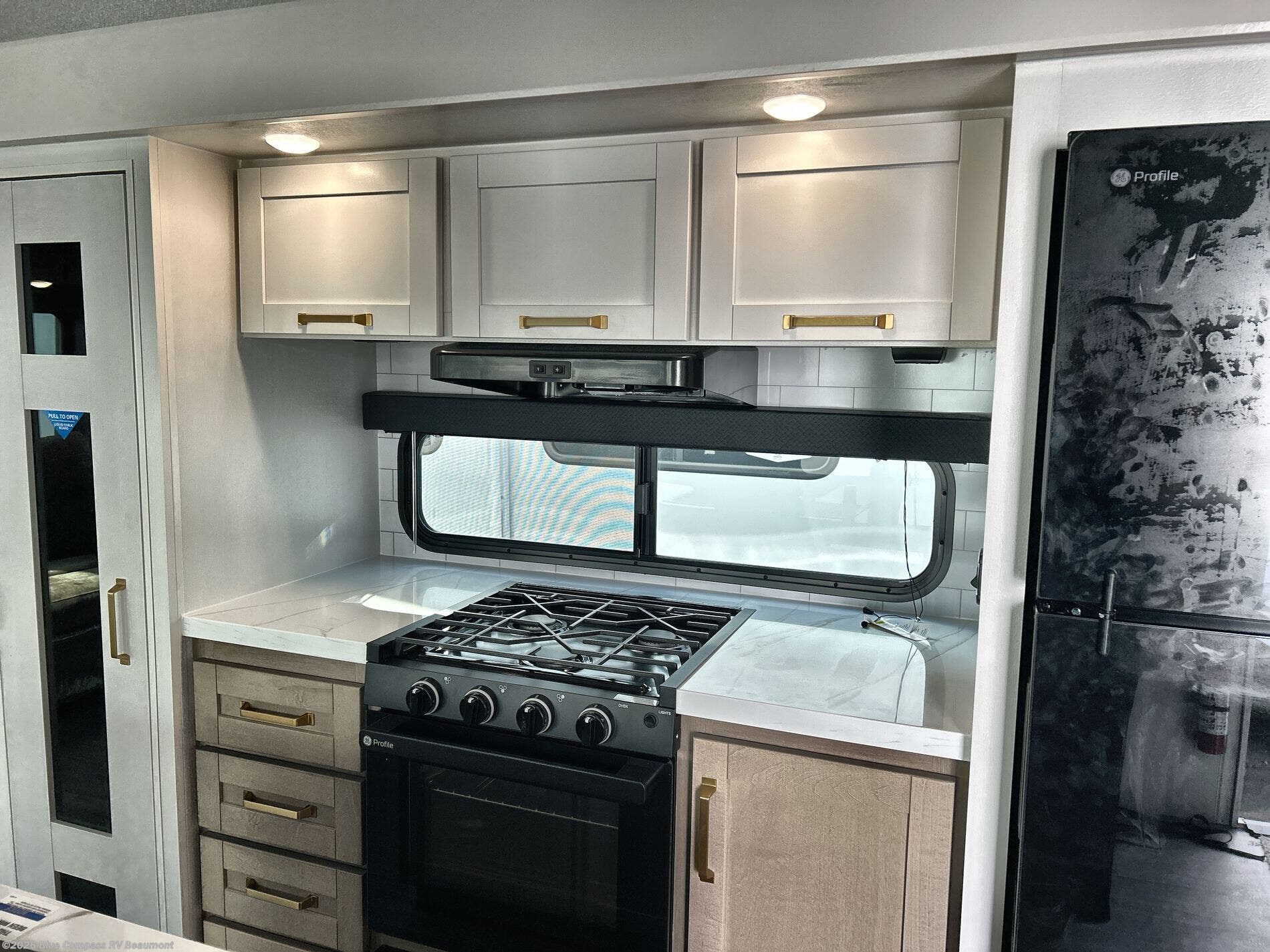 You will love how much interior space you have in this fifth wheel thanks to the dual opposing slides in the combined kitchen and living area! While your crew is relaxing on the theater seat or tri-fold sofa, you can prepare dinner on the GE black and stainless 21" range. There is also an entertainment center and fireplace across from the theater seat for easy viewing, and the table and chairs with a bench will be the perfect place to play a board game at. Head to the front to enjoy the private bedroom with an Olympic queen bed, and the full bath is close by for easy nighttime use!