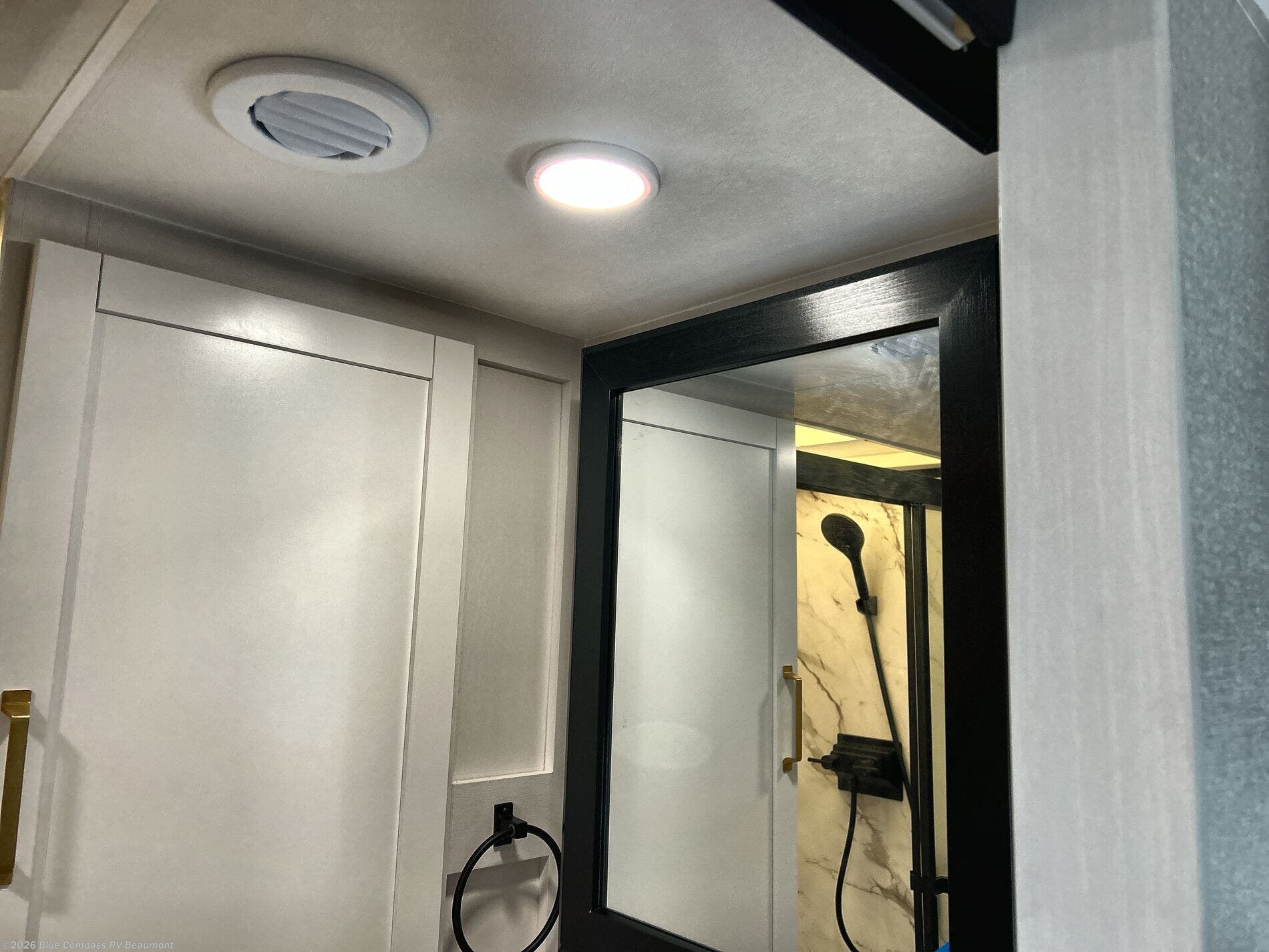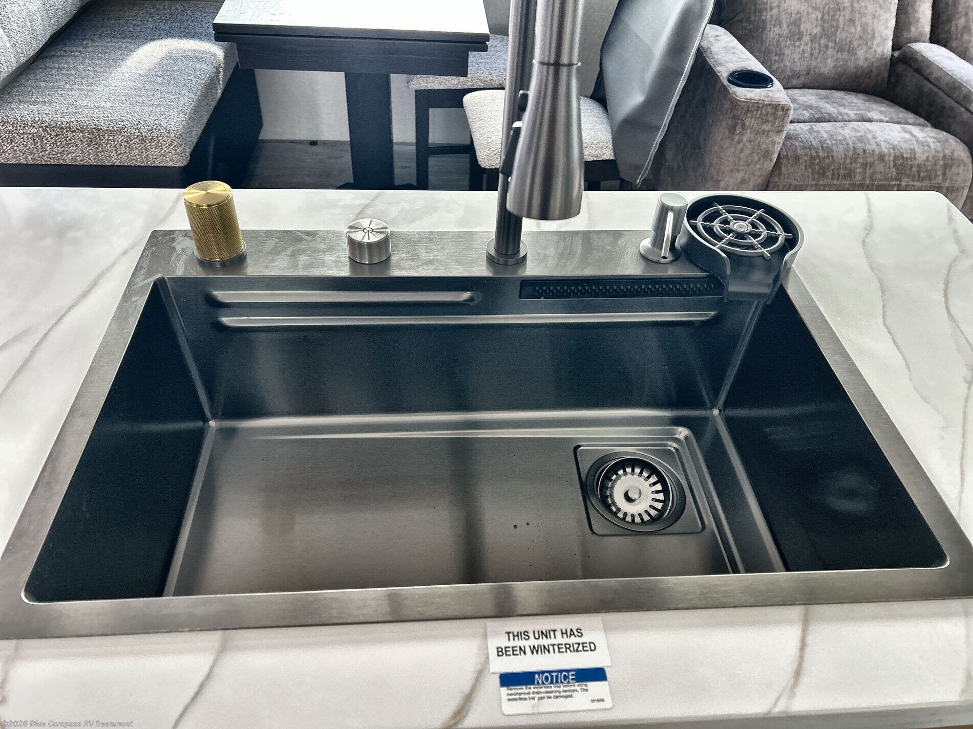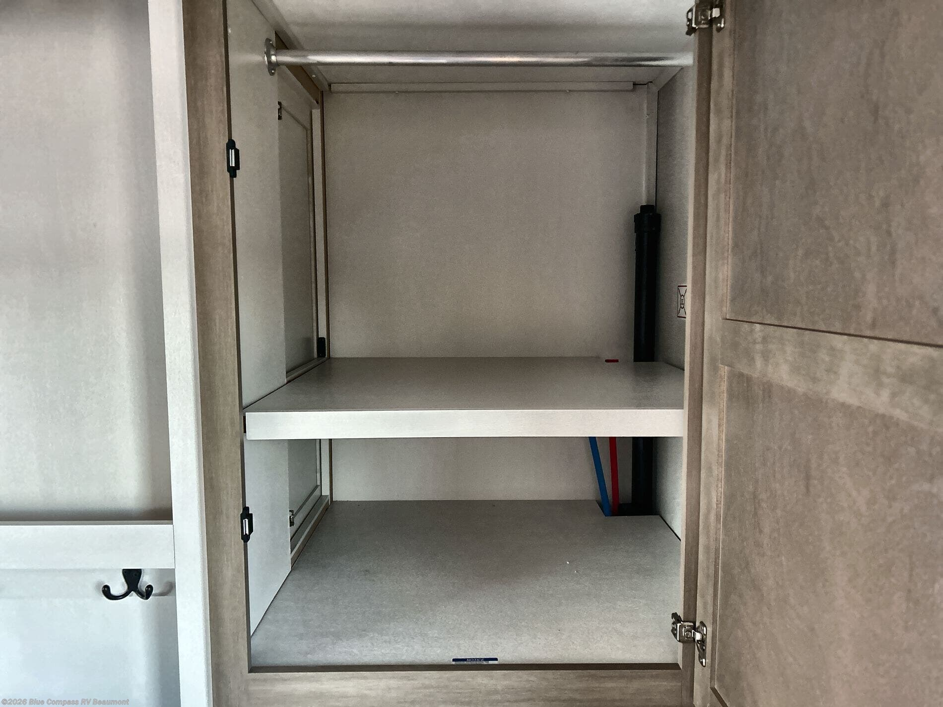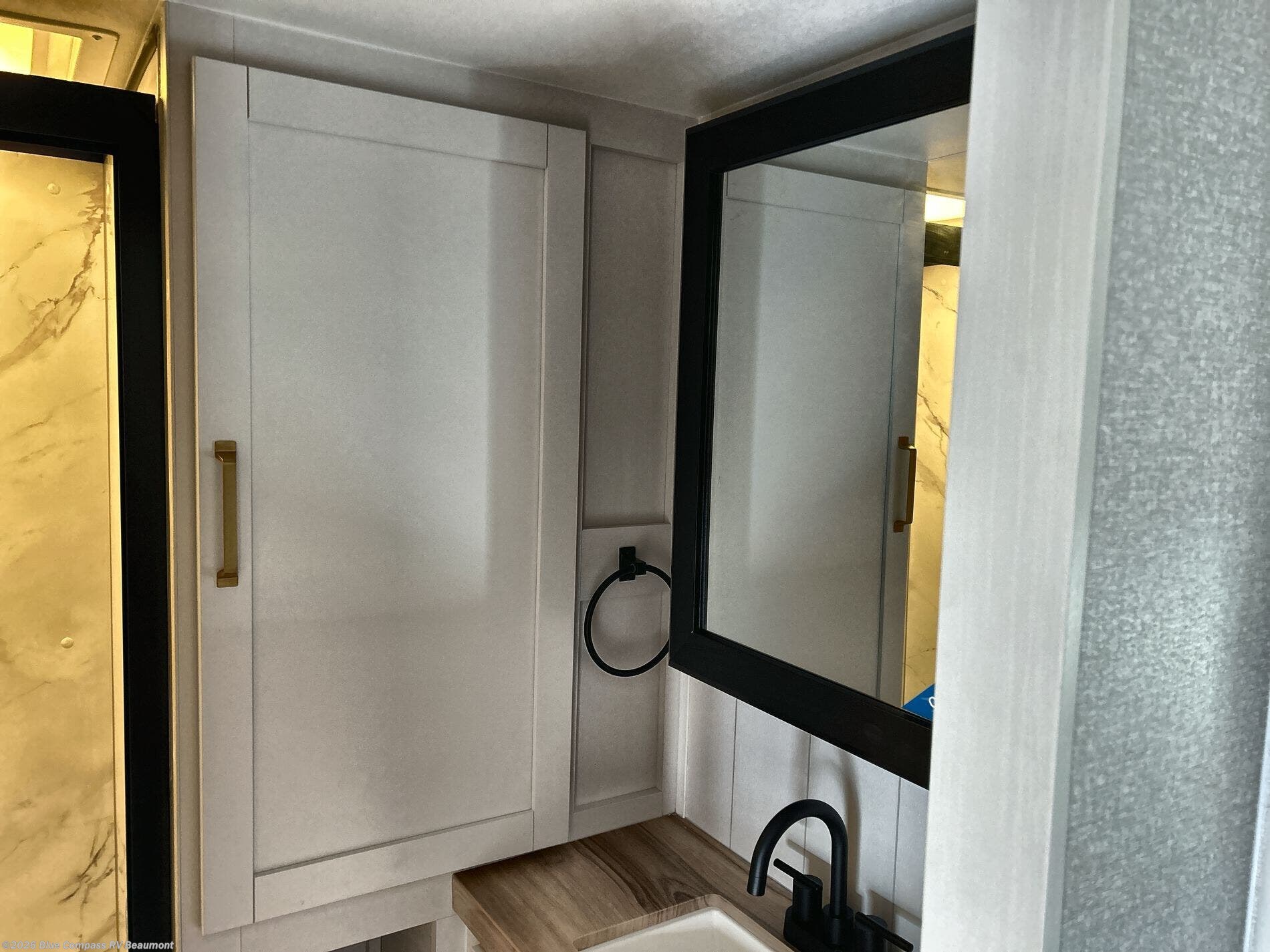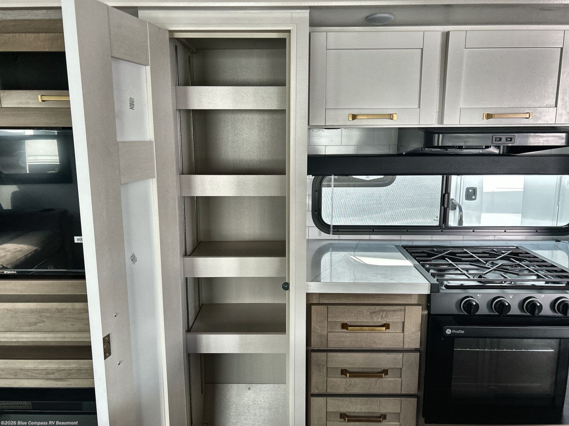 You will love how much interior space you have in this fifth wheel thanks to the dual opposing slides in the combined kitchen and living area! While your crew is relaxing on the theater seat or tri-fold sofa, you can prepare dinner on the GE black and stainless 21" range. There is also an entertainment center and fireplace across from the theater seat for easy viewing, and the table and chairs with a bench will be the perfect place to play a board game at. Head to the front to enjoy the private bedroom with an Olympic queen bed, and the full bath is close by for easy nighttime use!