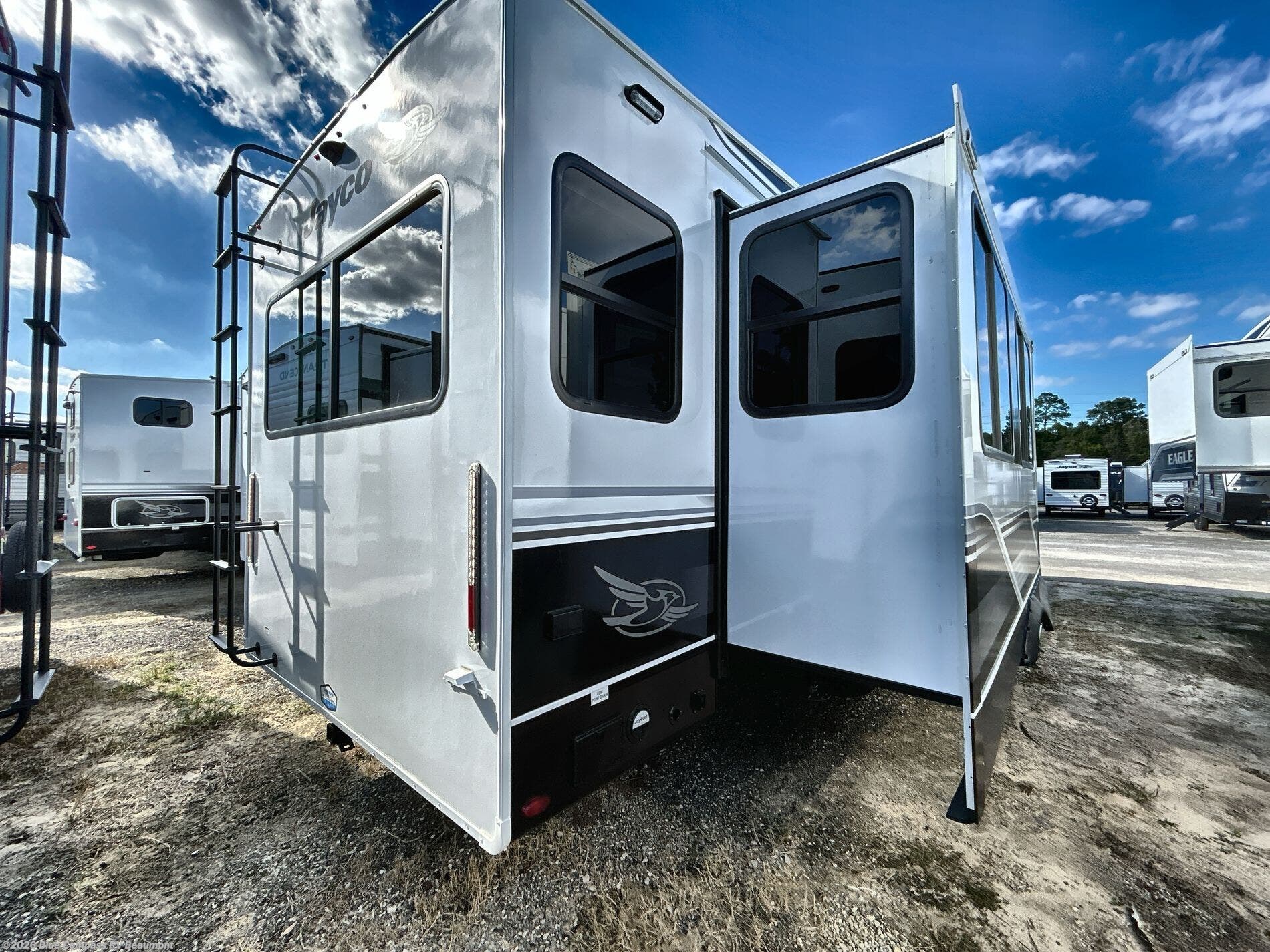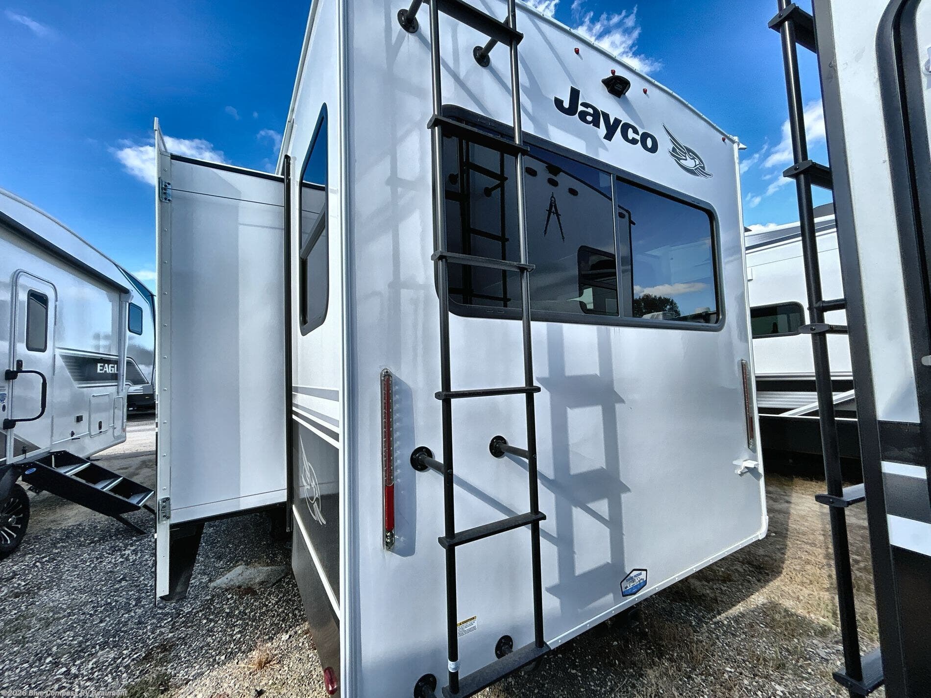 With any Eagle HT fifth wheel or travel trailer by Jayco you will enjoy a smooth drive thanks to the 4 Star Handling Package and MORryde CRE-3000 rubberized suspension. The Customer Value Package includes amenities that are sure to make camping easier than ever, like the 60K on-demand water heater, Keyed-Alike lock system, 15,000 BTU "Whisper Quiet" A/C, and more. Handcrafted door/drawer fronts will make your space feel more like home, along with residential vinyl flooring throughout, GE appliances, and blackout roller shades with reflective side throughout to keep the sun out when you want to sleep in. Each model also includes a NuVo H2O water treatment system with filters included, interior and exterior "Blue Sync" audio connect with MB Quart Sound for your TV and phone, and 100% no floor vents for added comfort and convenience!