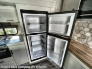 You will love how much interior space you have in this fifth wheel thanks to the dual opposing slides in the combined kitchen and living area! While your crew is relaxing on the theater seat or tri-fold sofa, you can prepare dinner on the GE black and stainless 21" range. There is also an entertainment center and fireplace across from the theater seat for easy viewing, and the table and chairs with a bench will be the perfect place to play a board game at. Head to the front to enjoy the private bedroom with an Olympic queen bed, and the full bath is close by for easy nighttime use!