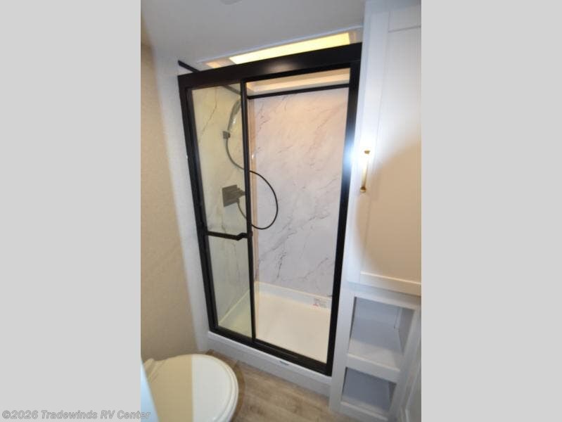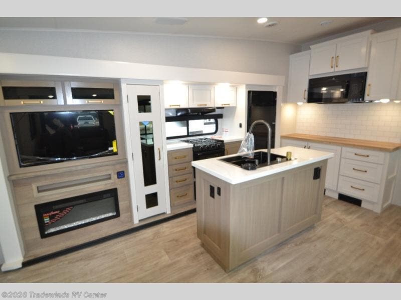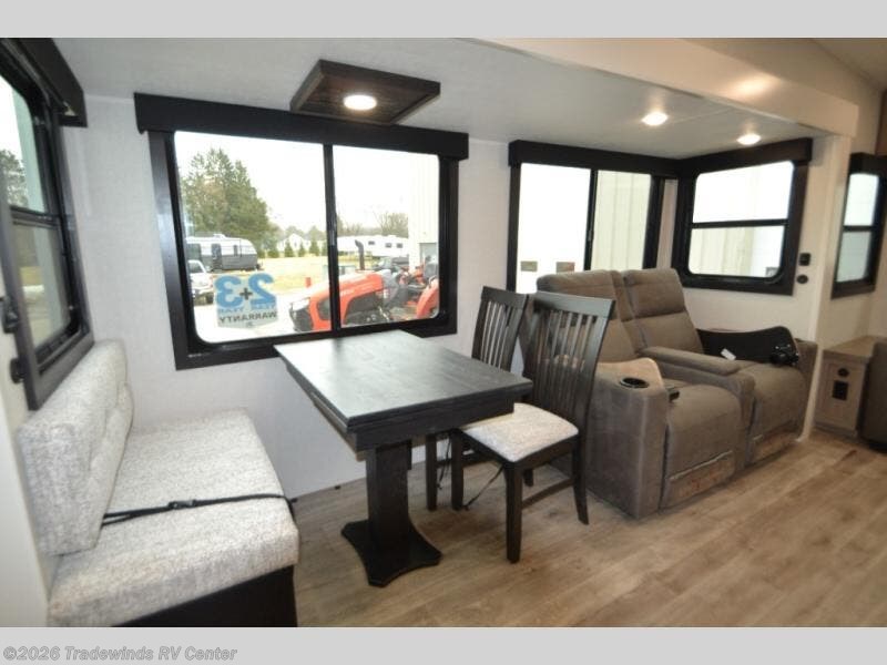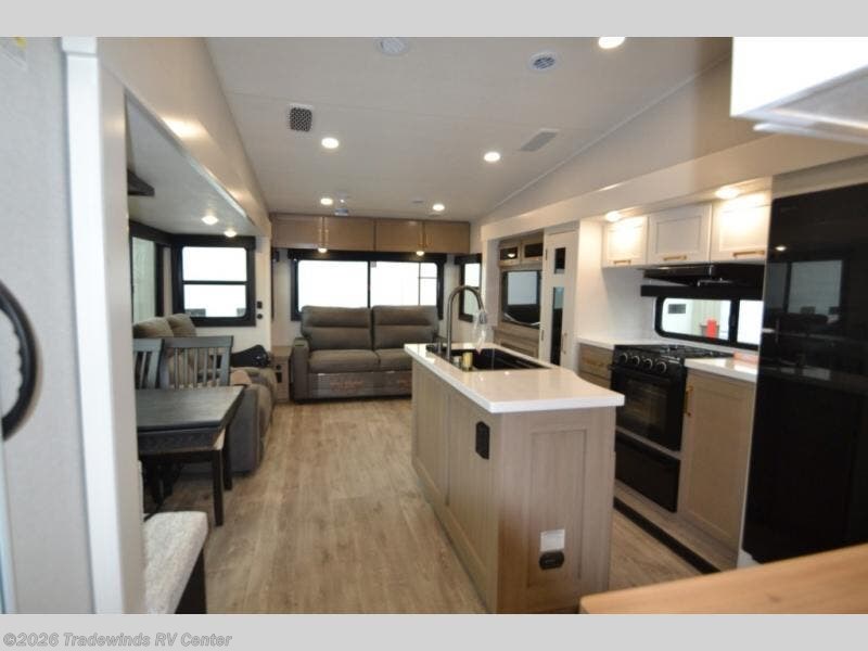 You will love how much interior space you have in this fifth wheel thanks to the dual opposing slides in the combined kitchen and living area! While your crew is relaxing on the theater seat or tri-fold sofa, you can prepare dinner on the GE black and stainless 21" range. There is also an entertainment center and fireplace across from the theater seat for easy viewing, and the table and chairs with a bench will be the perfect place to play a board game at. Head to the front to enjoy the private bedroom with an Olympic queen bed, and the full bath is close by for easy nighttime use!