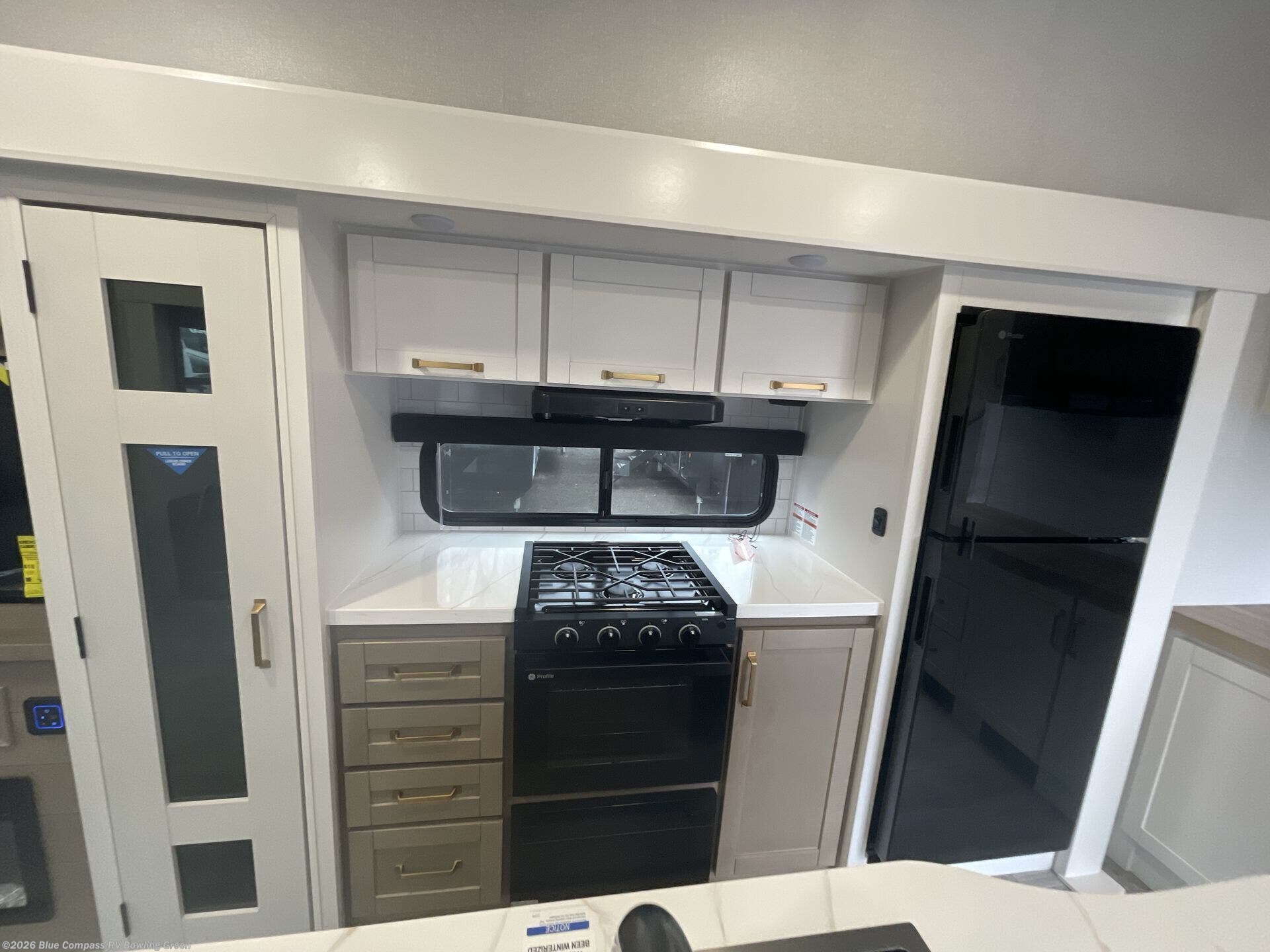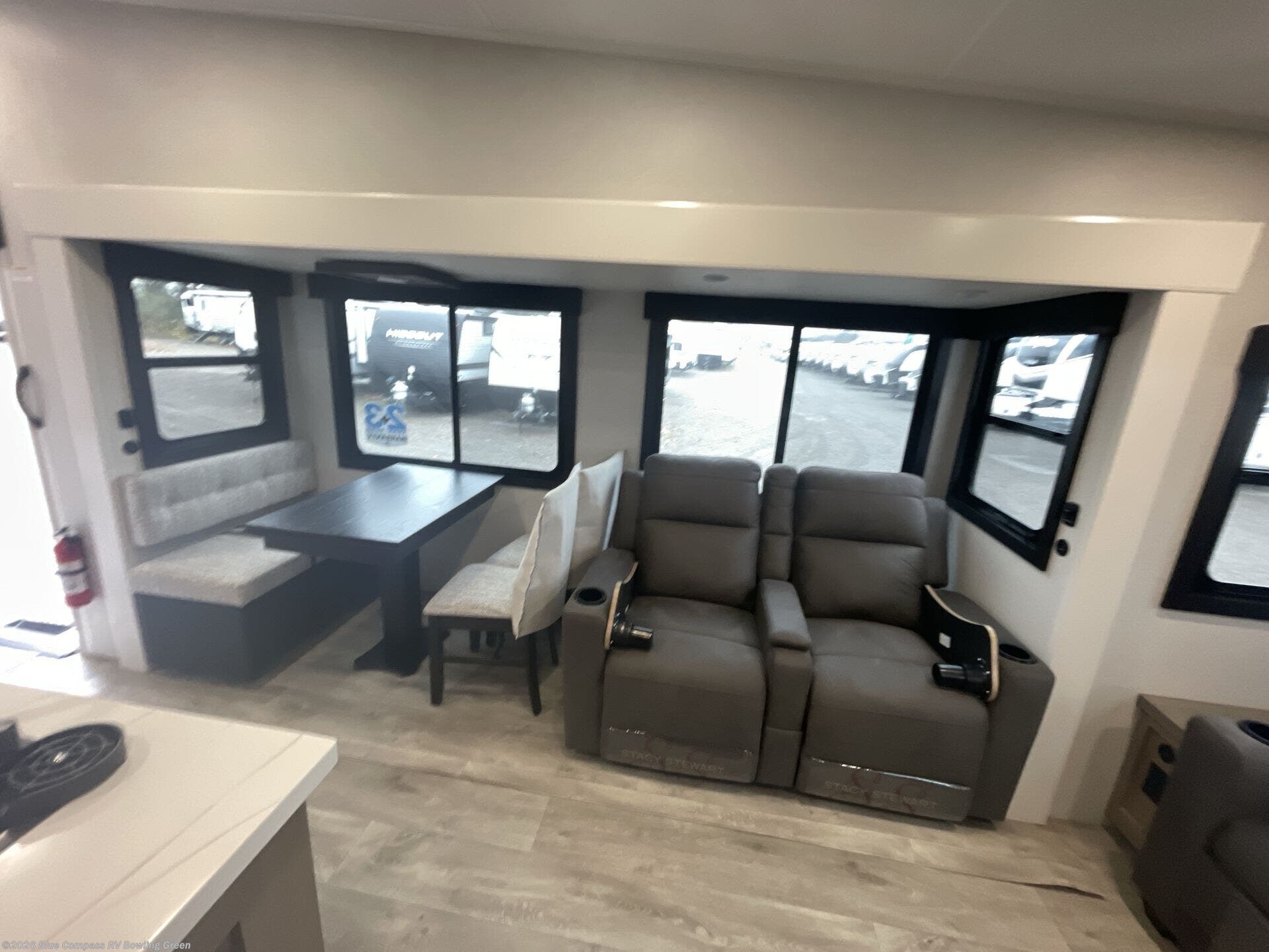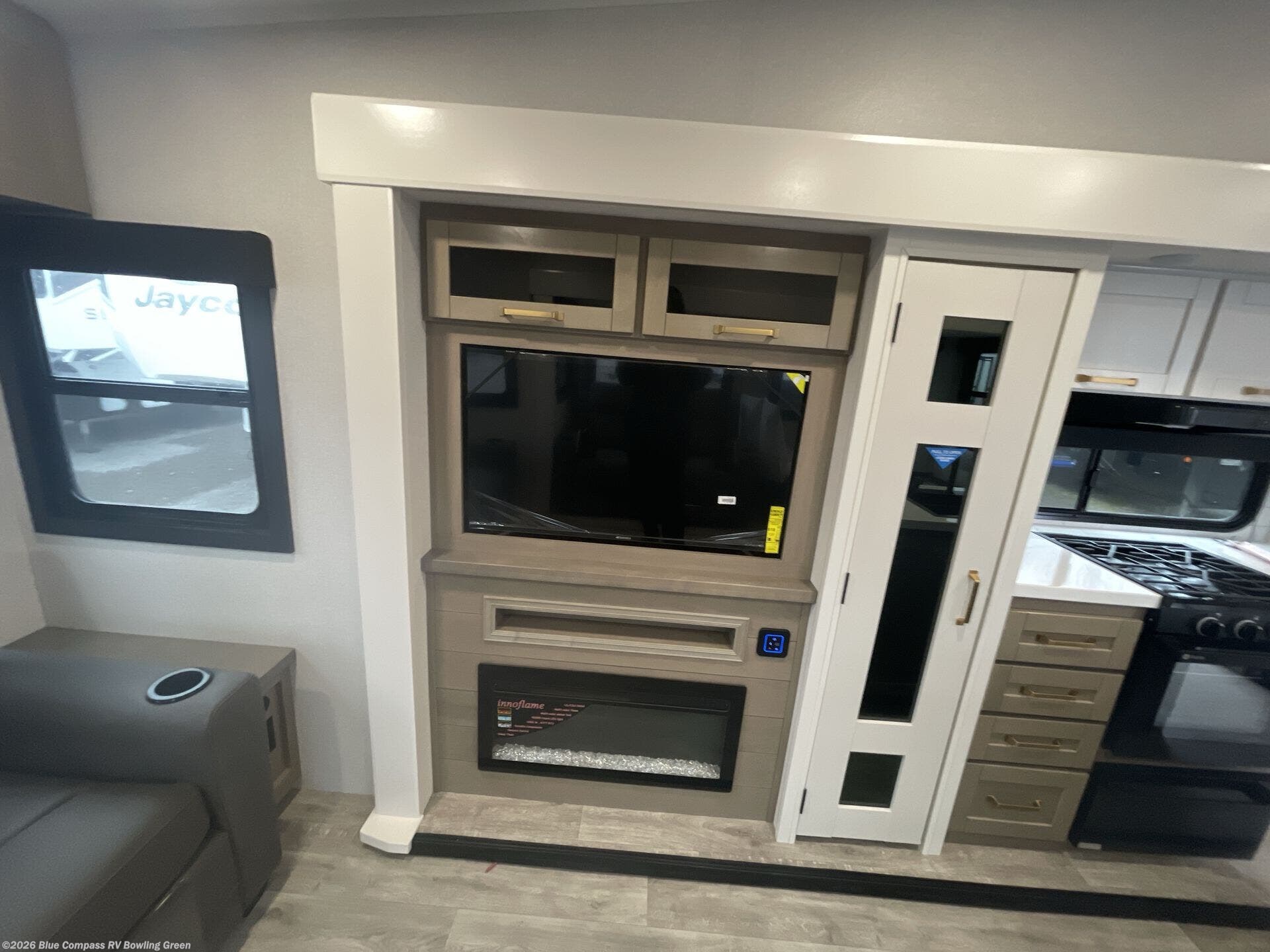 You will love how much interior space you have in this fifth wheel thanks to the dual opposing slides in the combined kitchen and living area! While your crew is relaxing on the theater seat or tri-fold sofa, you can prepare dinner on the GE black and stainless 21" range. There is also an entertainment center and fireplace across from the theater seat for easy viewing, and the table and chairs with a bench will be the perfect place to play a board game at. Head to the front to enjoy the private bedroom with an Olympic queen bed, and the full bath is close by for easy nighttime use!