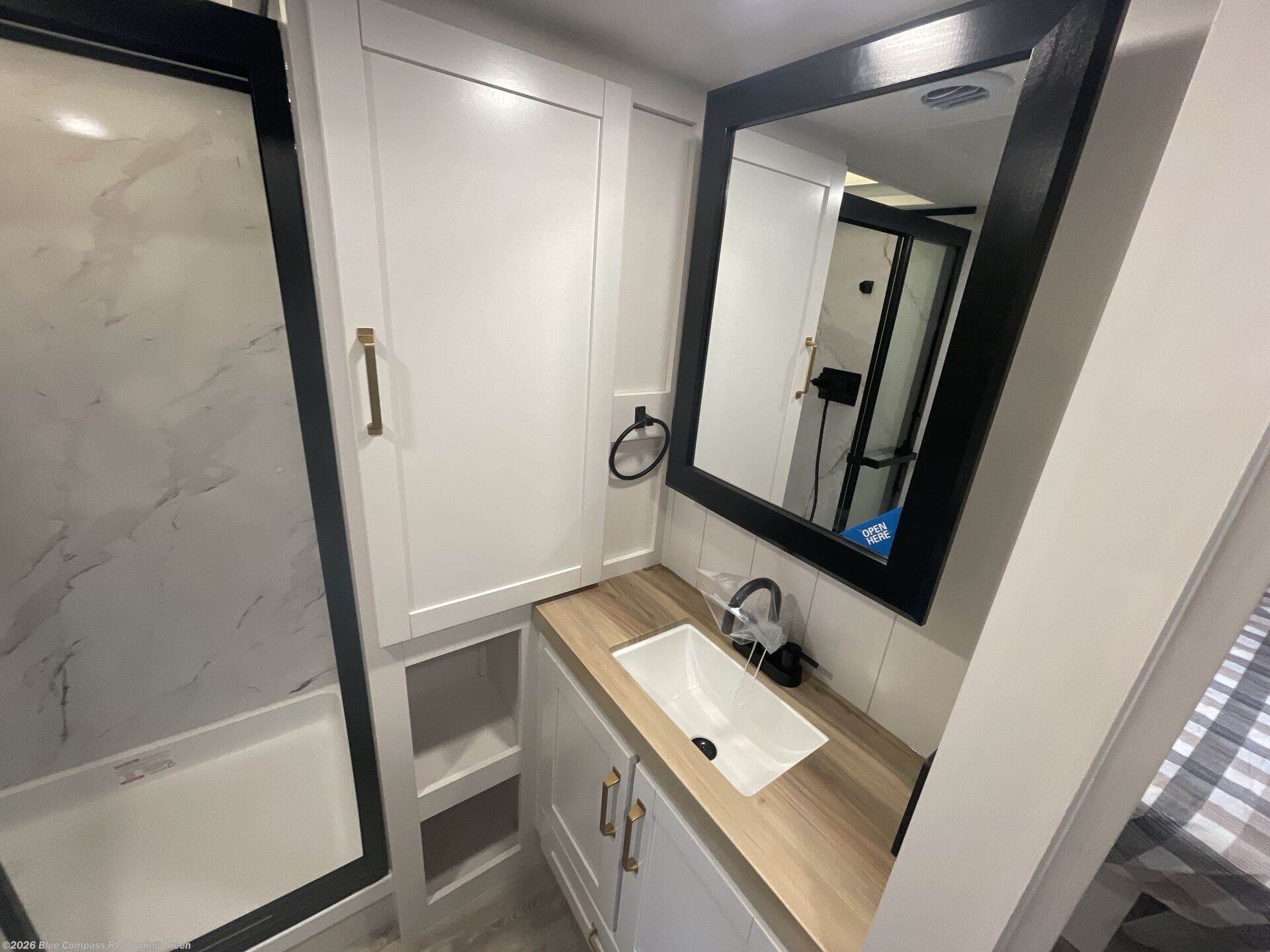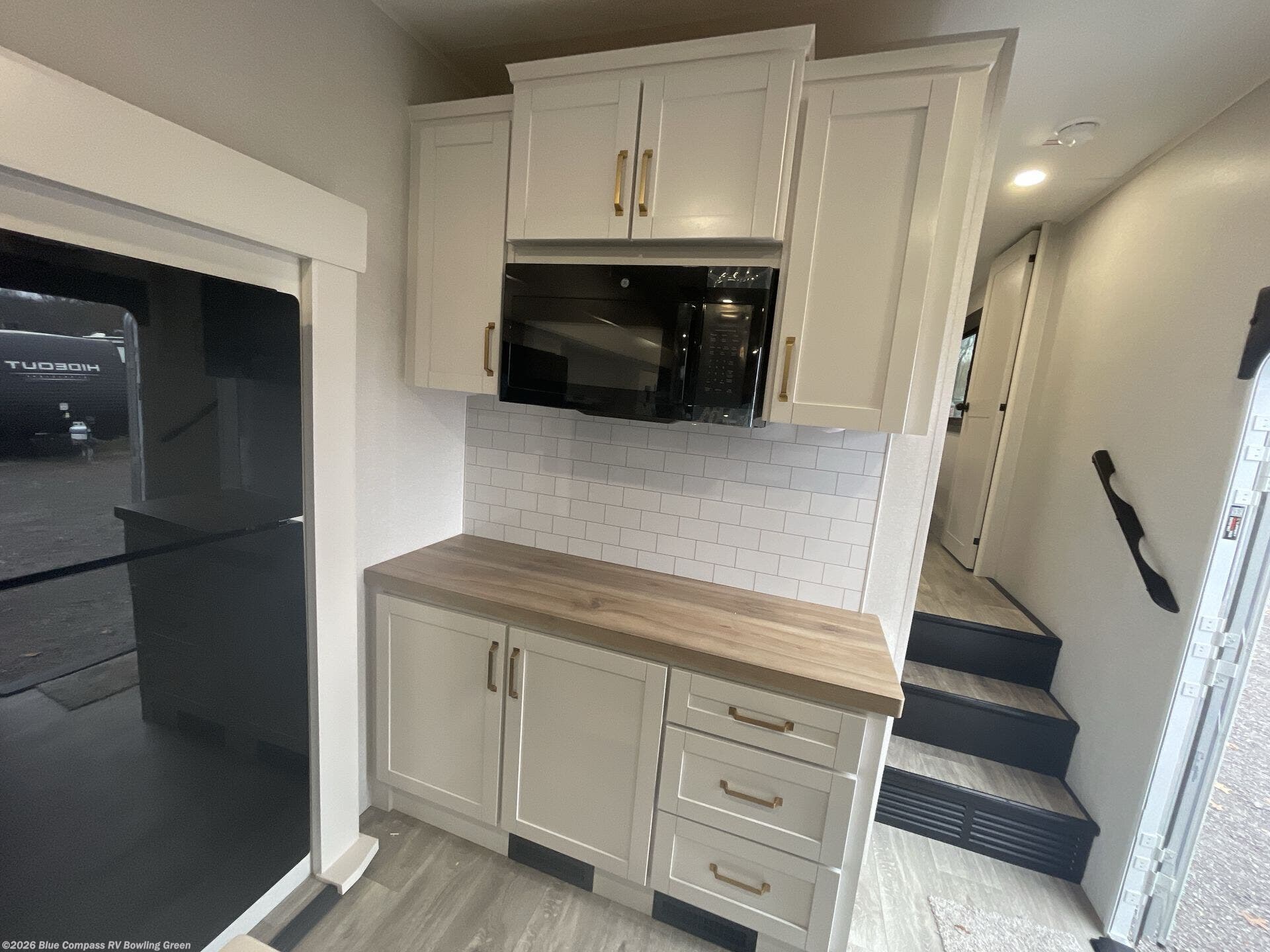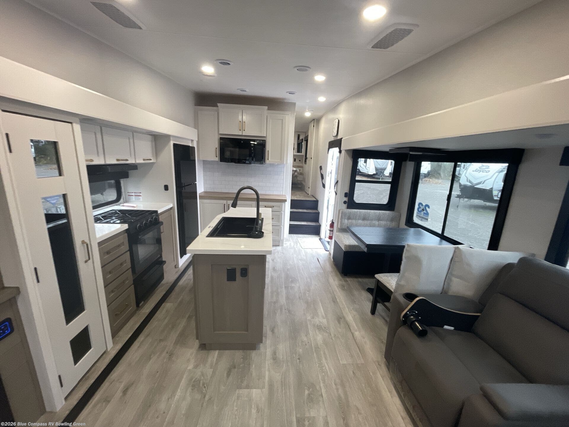 You will love how much interior space you have in this fifth wheel thanks to the dual opposing slides in the combined kitchen and living area! While your crew is relaxing on the theater seat or tri-fold sofa, you can prepare dinner on the GE black and stainless 21" range. There is also an entertainment center and fireplace across from the theater seat for easy viewing, and the table and chairs with a bench will be the perfect place to play a board game at. Head to the front to enjoy the private bedroom with an Olympic queen bed, and the full bath is close by for easy nighttime use!