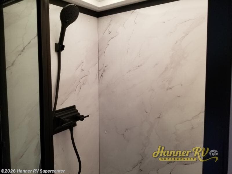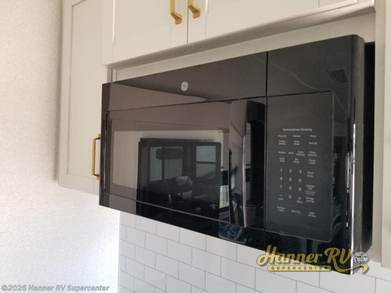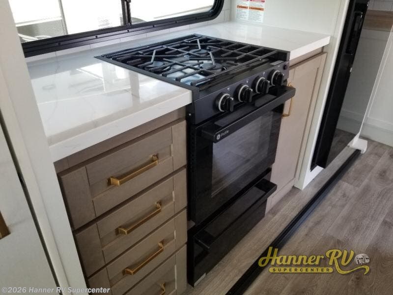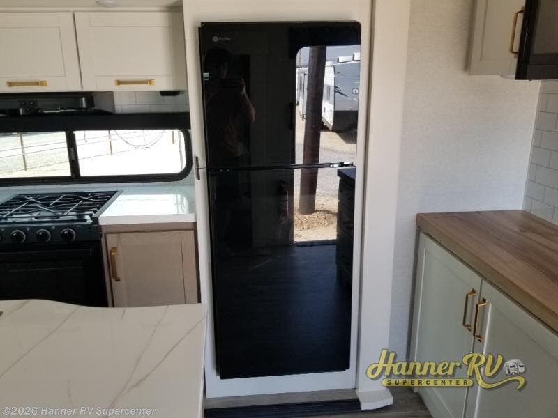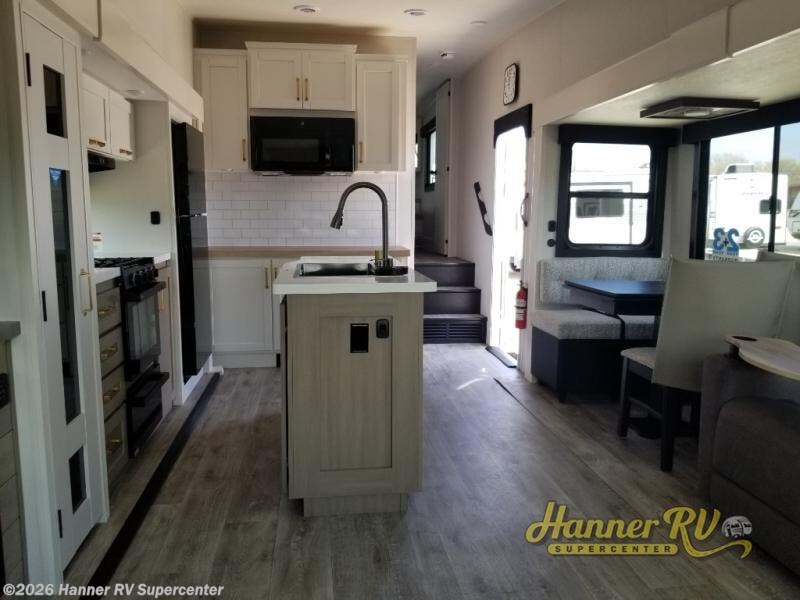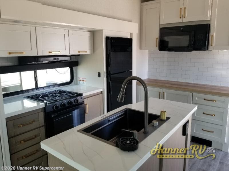 You will love how much interior space you have in this fifth wheel thanks to the dual opposing slides in the combined kitchen and living area! While your crew is relaxing on the theater seat or tri-fold sofa, you can prepare dinner on the GE black and stainless 21" range. There is also an entertainment center and fireplace across from the theater seat for easy viewing, and the table and chairs with a bench will be the perfect place to play a board game at. Head to the front to enjoy the private bedroom with an Olympic queen bed, and the full bath is close by for easy nighttime use!