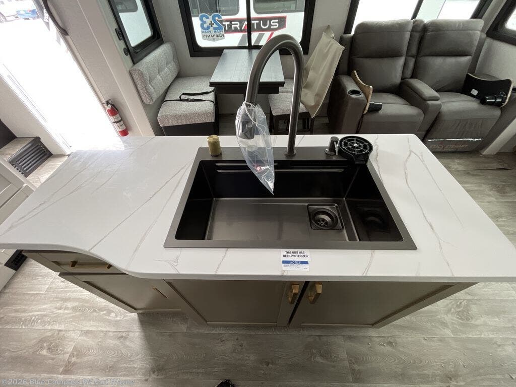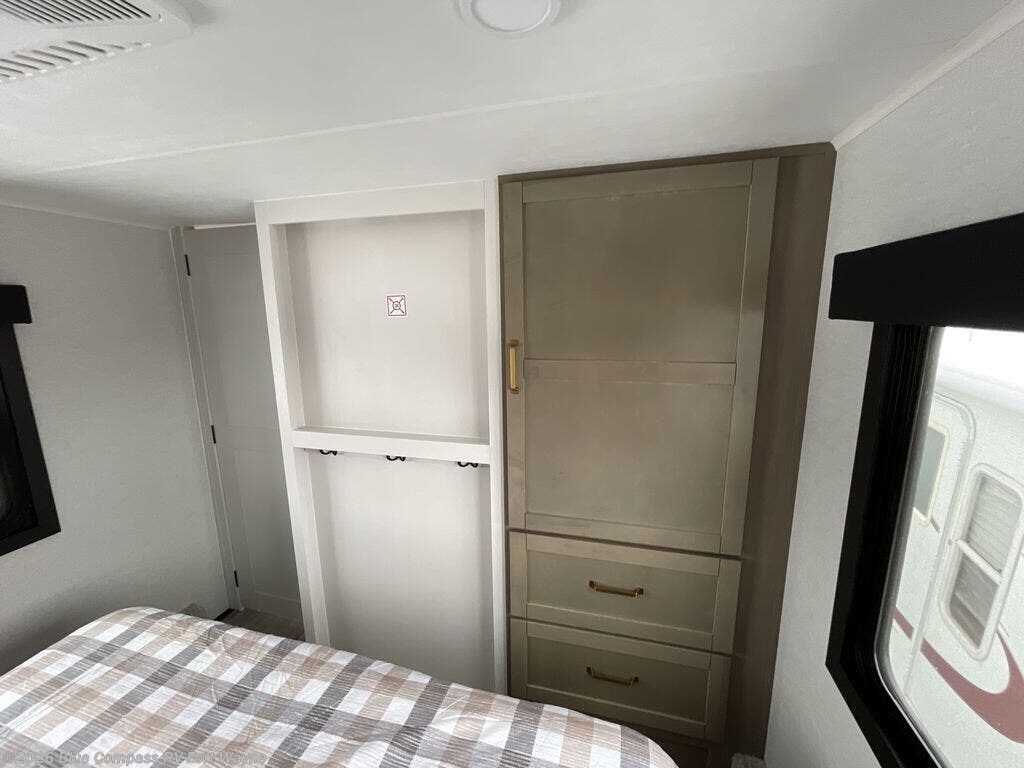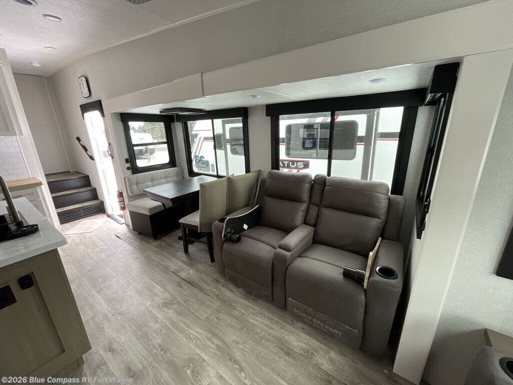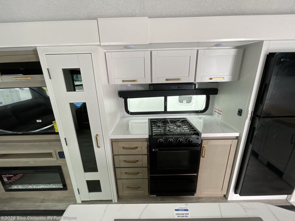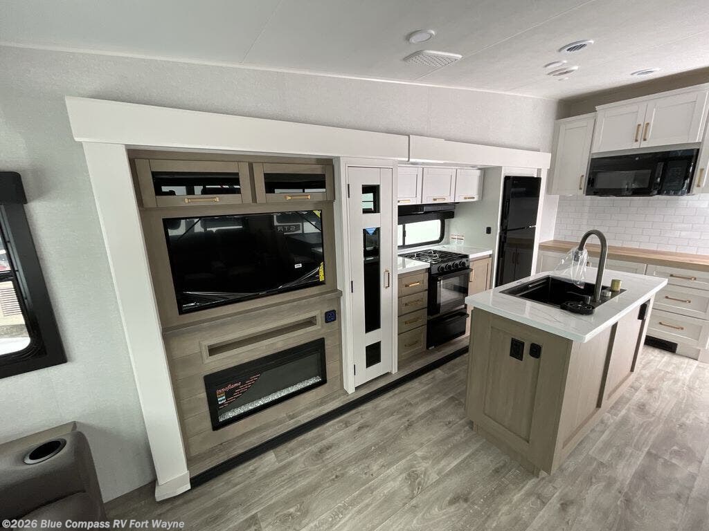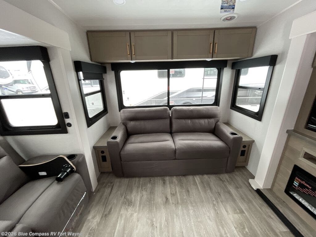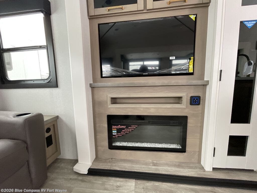 You will love how much interior space you have in this fifth wheel thanks to the dual opposing slides in the combined kitchen and living area! While your crew is relaxing on the theater seat or tri-fold sofa, you can prepare dinner on the GE black and stainless 21" range. There is also an entertainment center and fireplace across from the theater seat for easy viewing, and the table and chairs with a bench will be the perfect place to play a board game at. Head to the front to enjoy the private bedroom with an Olympic queen bed, and the full bath is close by for easy nighttime use!