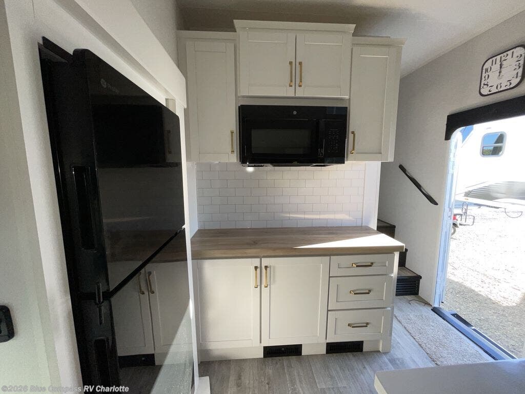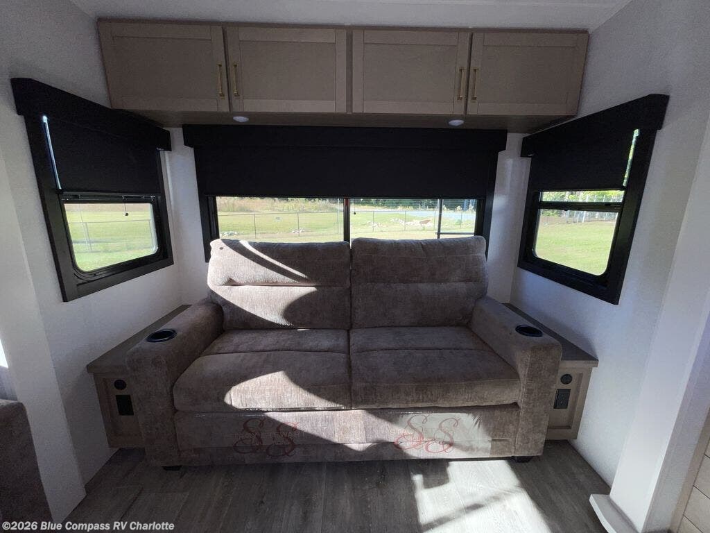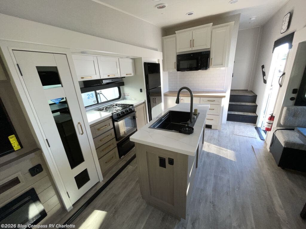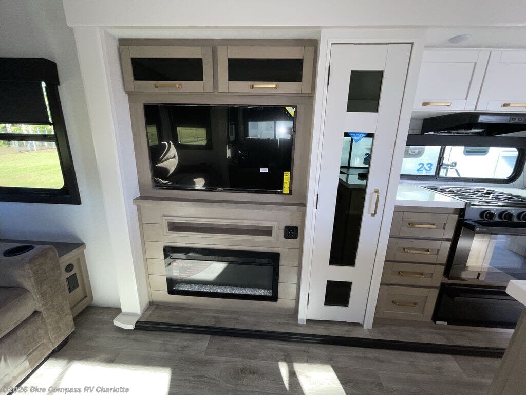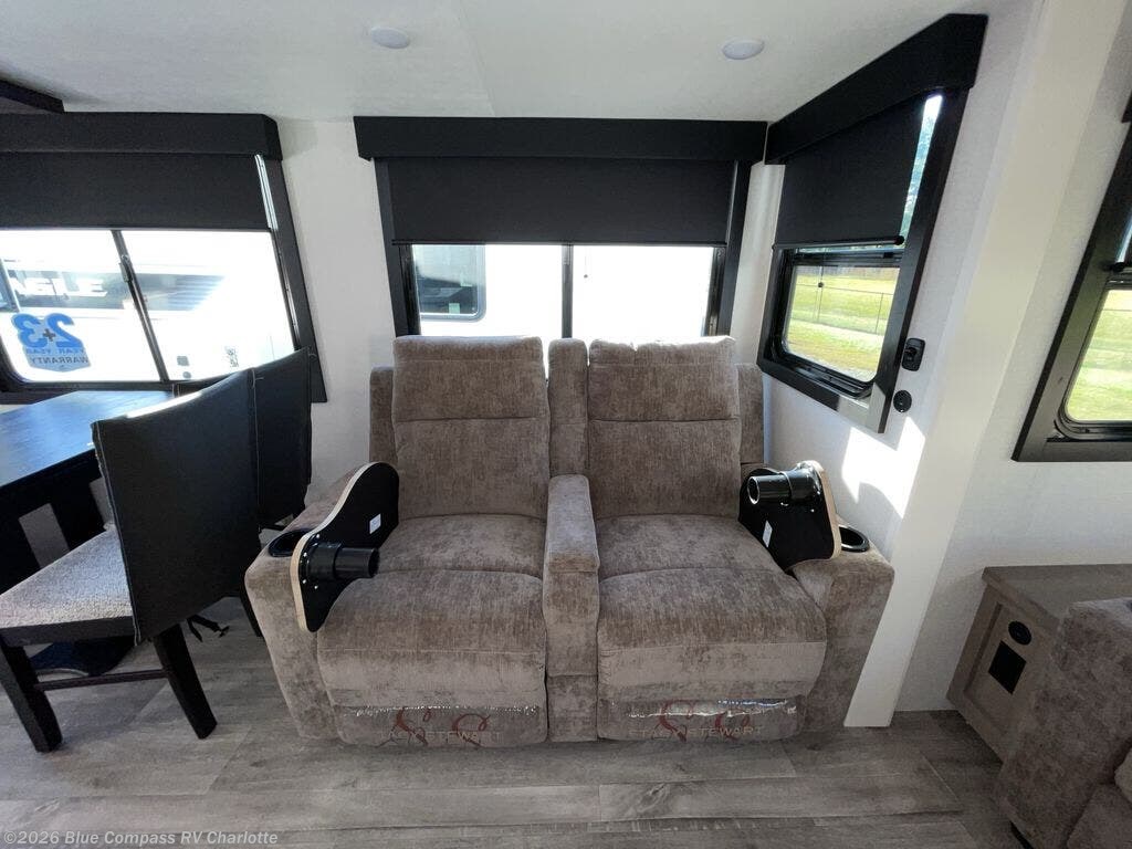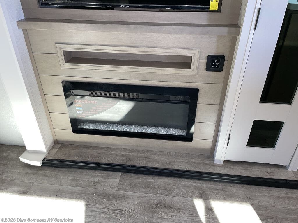 You will love how much interior space you have in this fifth wheel thanks to the dual opposing slides in the combined kitchen and living area! While your crew is relaxing on the theater seat or tri-fold sofa, you can prepare dinner on the GE black and stainless 21" range. There is also an entertainment center and fireplace across from the theater seat for easy viewing, and the table and chairs with a bench will be the perfect place to play a board game at. Head to the front to enjoy the private bedroom with an Olympic queen bed, and the full bath is close by for easy nighttime use!