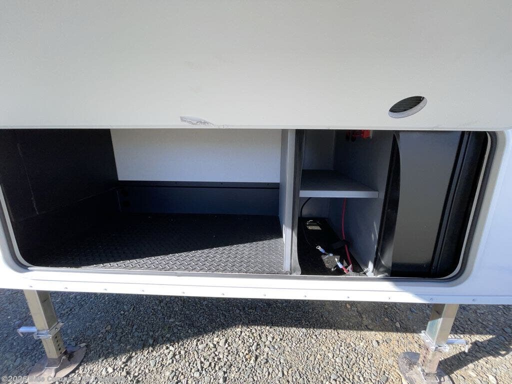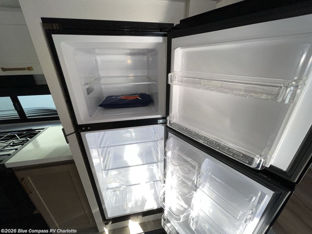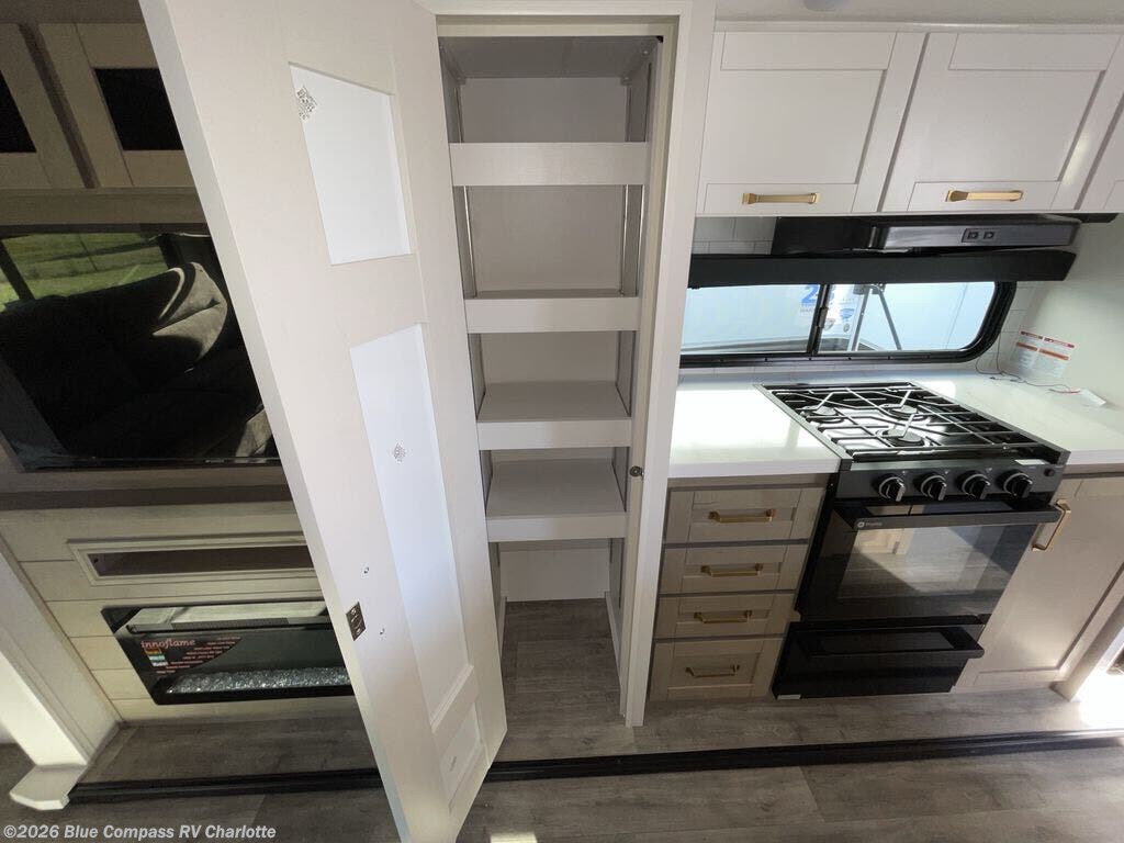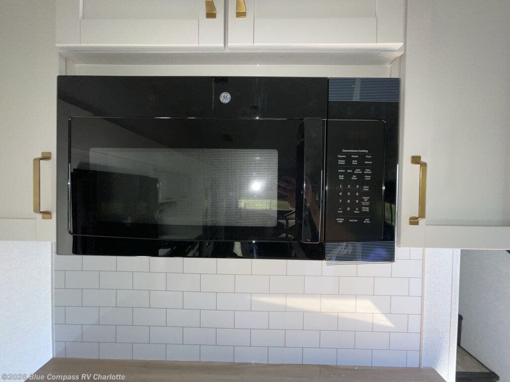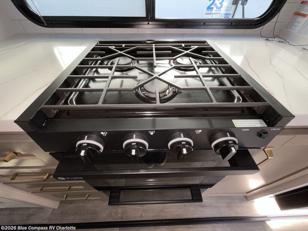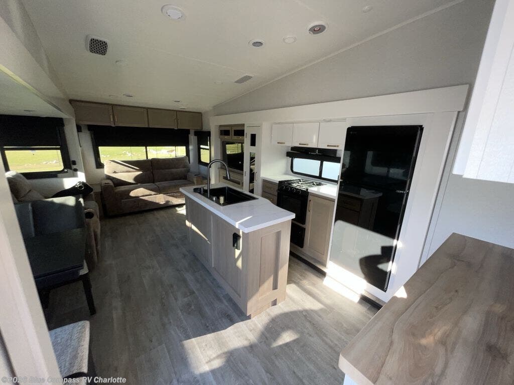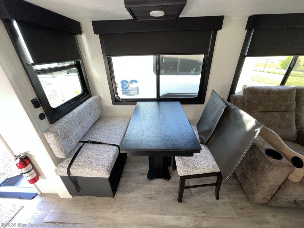 You will love how much interior space you have in this fifth wheel thanks to the dual opposing slides in the combined kitchen and living area! While your crew is relaxing on the theater seat or tri-fold sofa, you can prepare dinner on the GE black and stainless 21" range. There is also an entertainment center and fireplace across from the theater seat for easy viewing, and the table and chairs with a bench will be the perfect place to play a board game at. Head to the front to enjoy the private bedroom with an Olympic queen bed, and the full bath is close by for easy nighttime use!