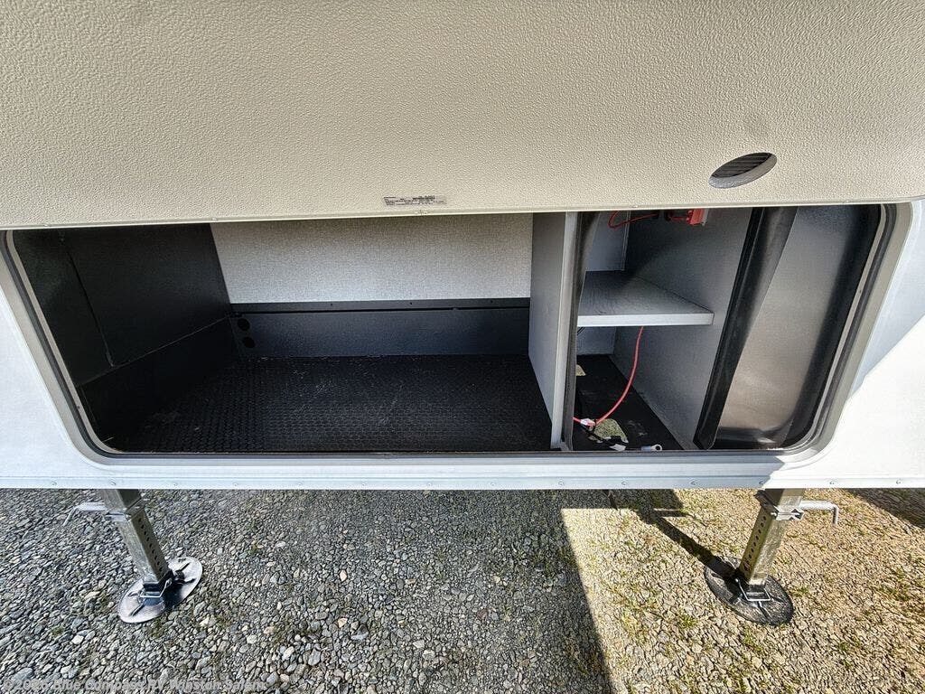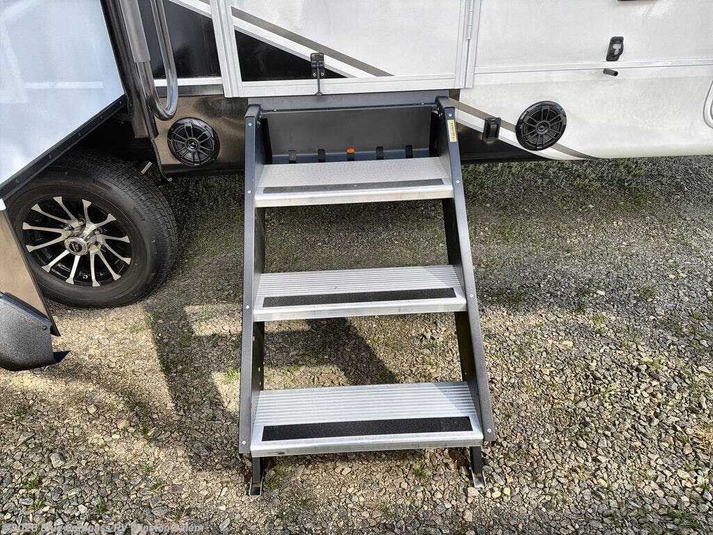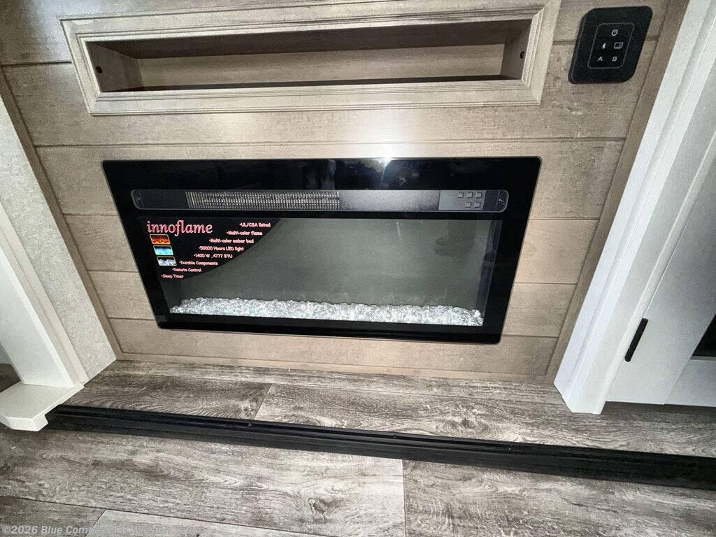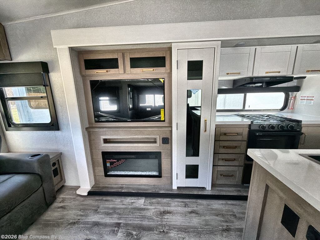 You will love how much interior space you have in this fifth wheel thanks to the dual opposing slides in the combined kitchen and living area! While your crew is relaxing on the theater seat or tri-fold sofa, you can prepare dinner on the GE black and stainless 21" range. There is also an entertainment center and fireplace across from the theater seat for easy viewing, and the table and chairs with a bench will be the perfect place to play a board game at. Head to the front to enjoy the private bedroom with an Olympic queen bed, and the full bath is close by for easy nighttime use!