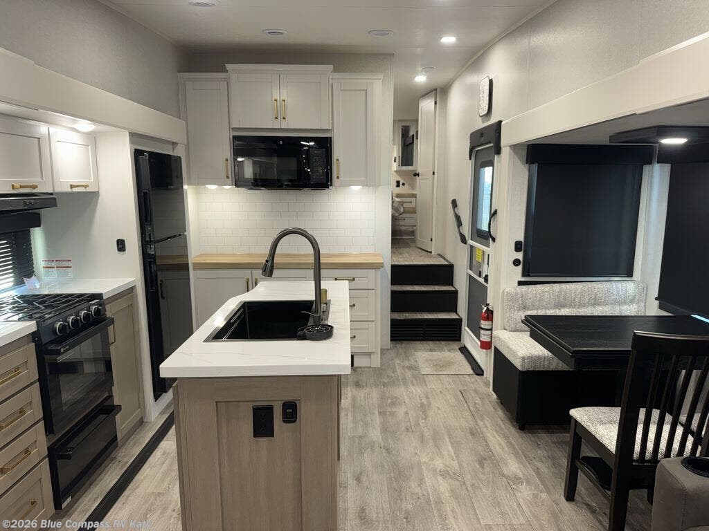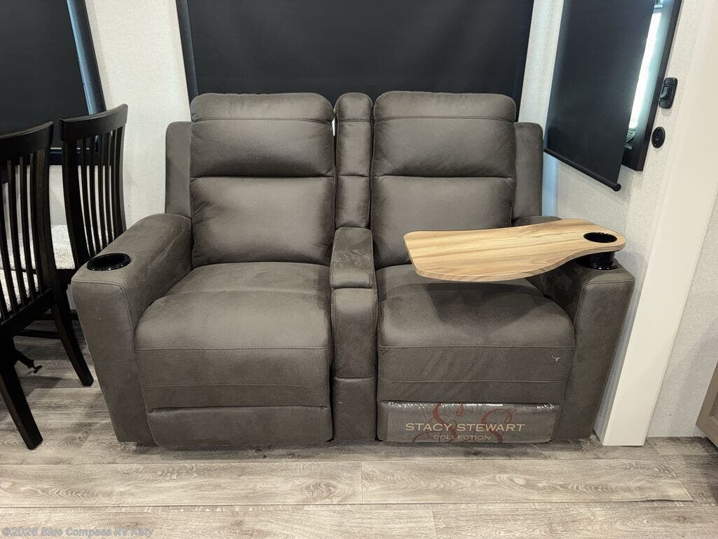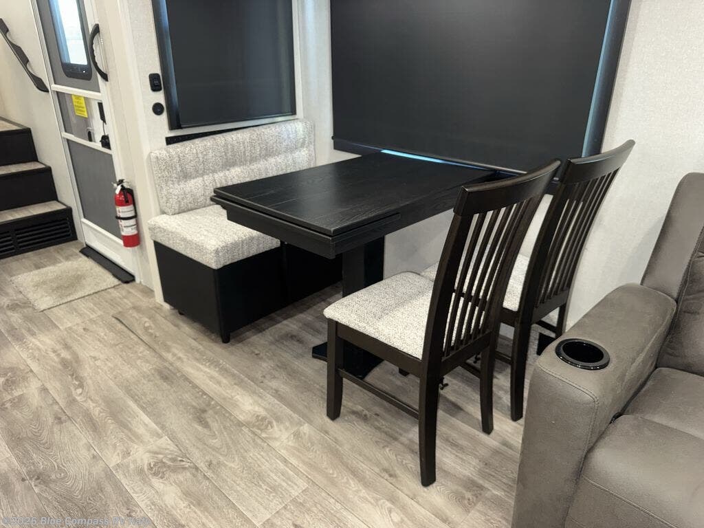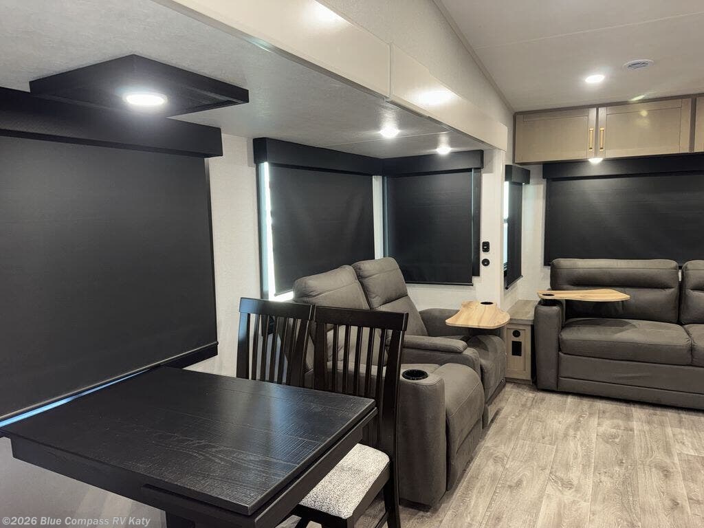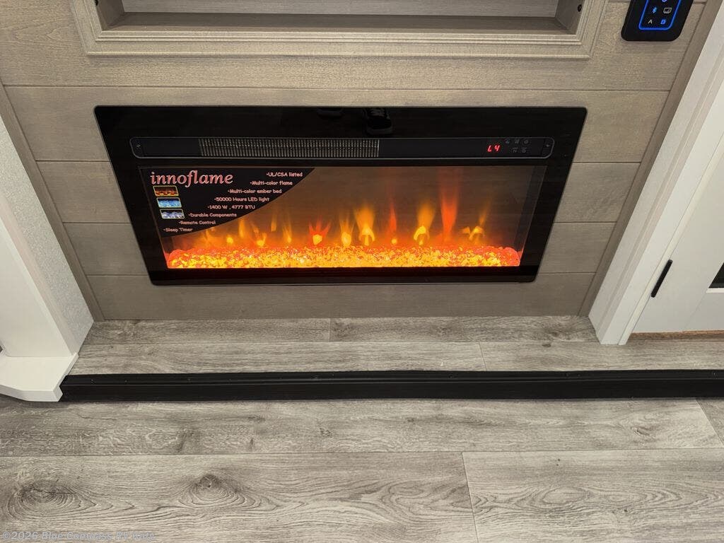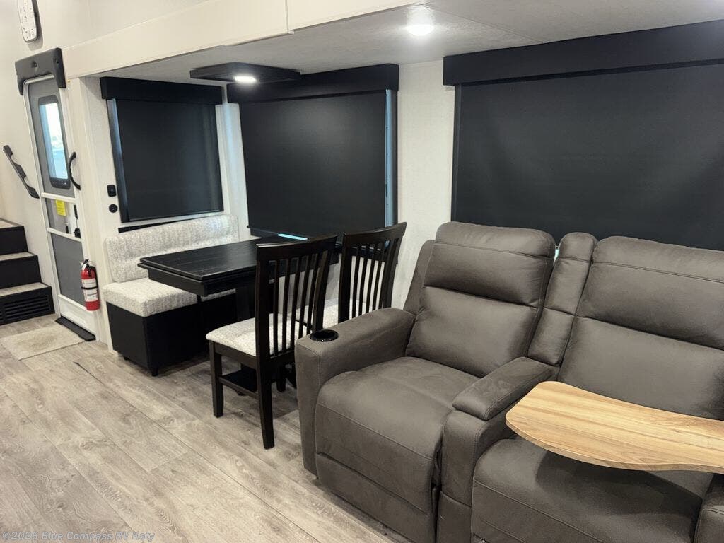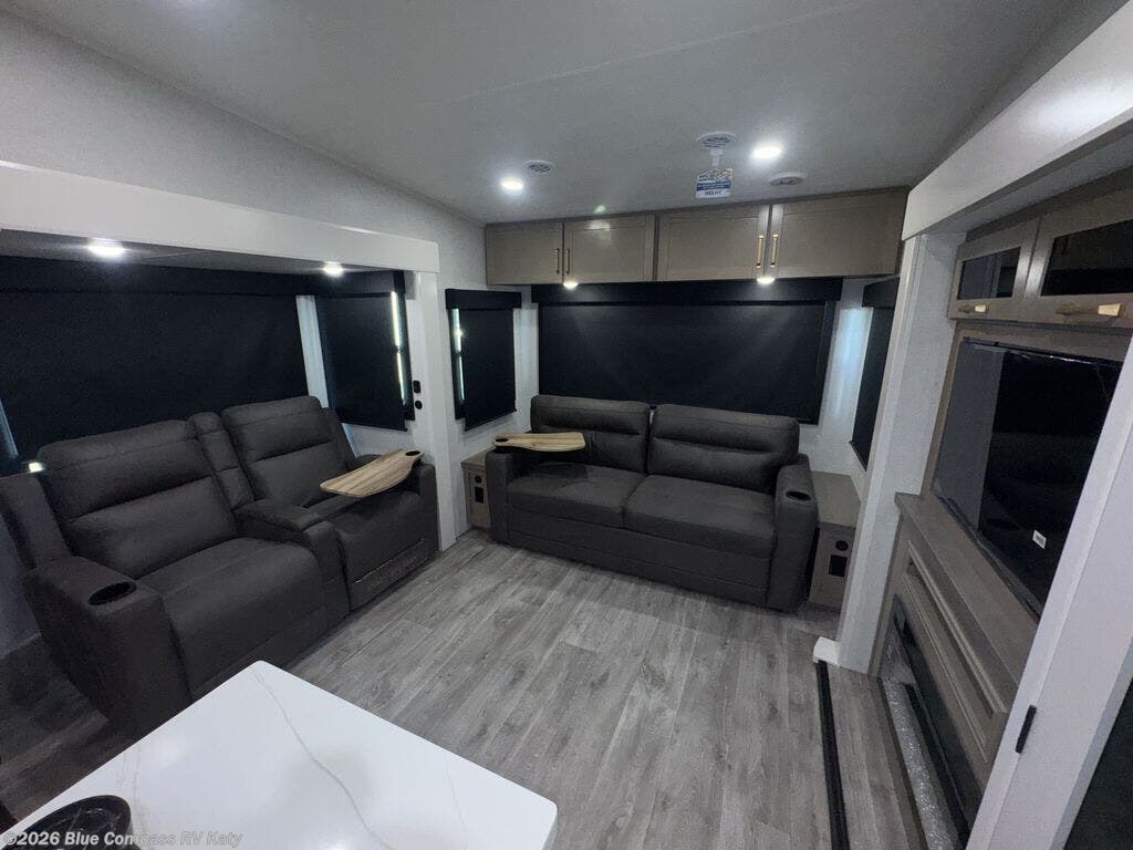 You will love how much interior space you have in this fifth wheel thanks to the dual opposing slides in the combined kitchen and living area! While your crew is relaxing on the theater seat or tri-fold sofa, you can prepare dinner on the GE black and stainless 21" range. There is also an entertainment center and fireplace across from the theater seat for easy viewing, and the table and chairs with a bench will be the perfect place to play a board game at. Head to the front to enjoy the private bedroom with an Olympic queen bed, and the full bath is close by for easy nighttime use!