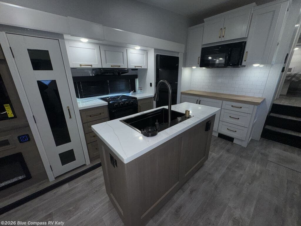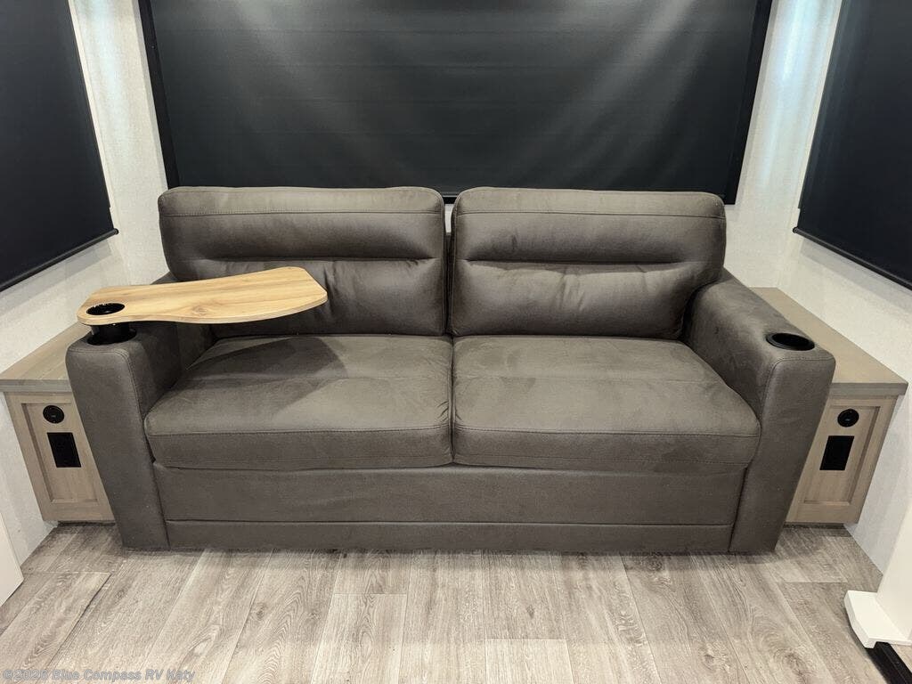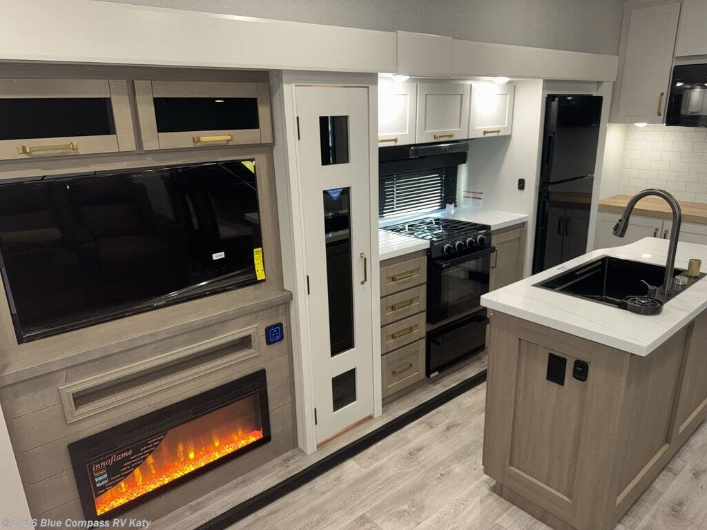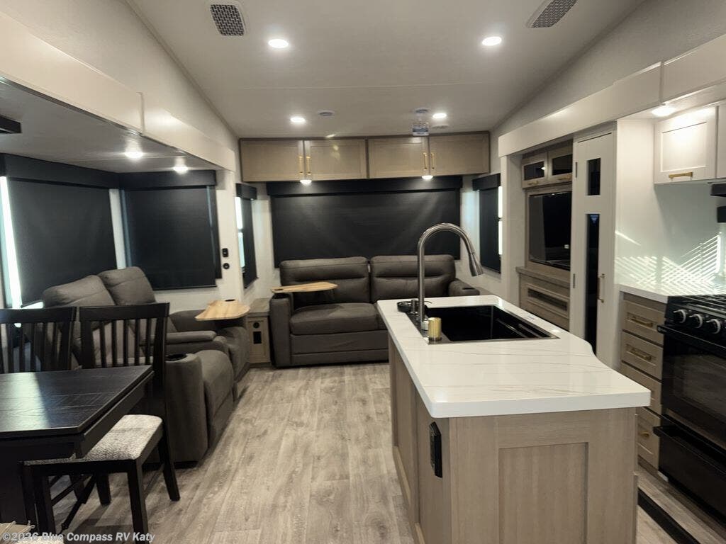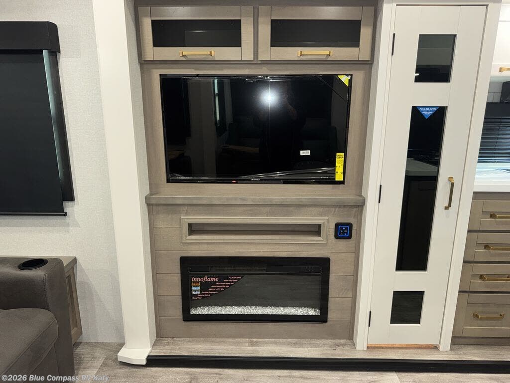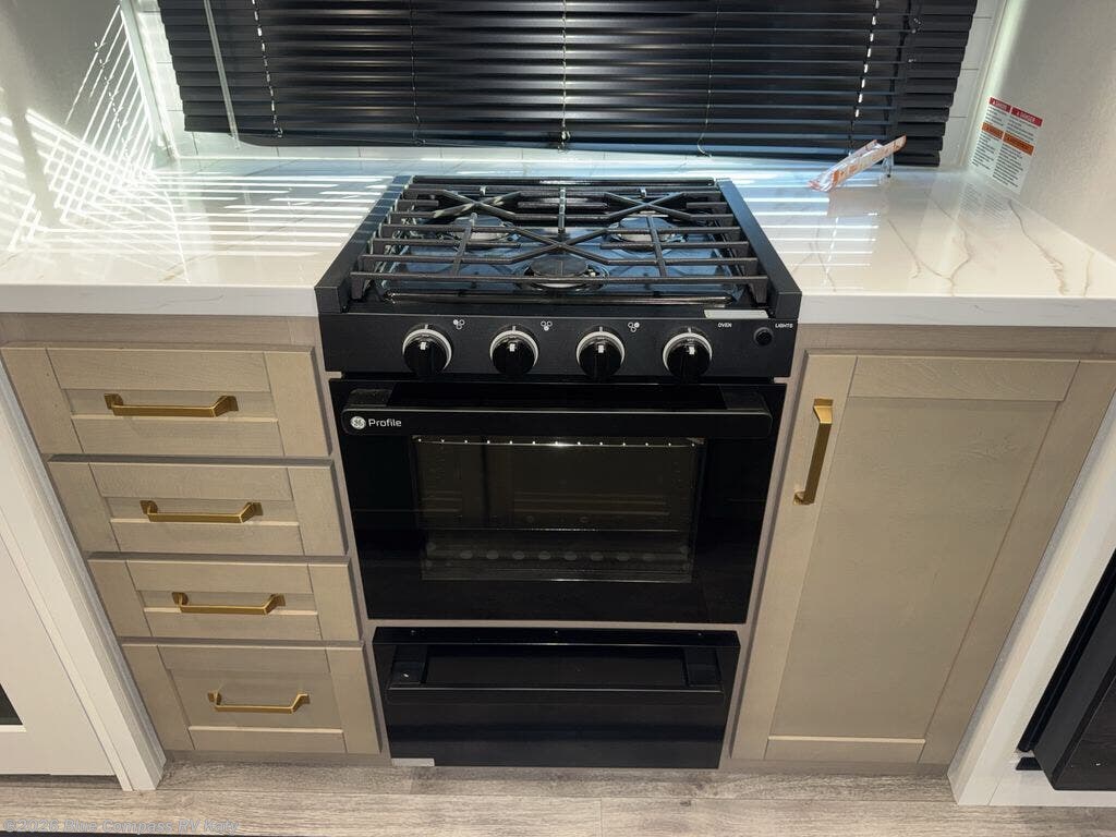 You will love how much interior space you have in this fifth wheel thanks to the dual opposing slides in the combined kitchen and living area! While your crew is relaxing on the theater seat or tri-fold sofa, you can prepare dinner on the GE black and stainless 21" range. There is also an entertainment center and fireplace across from the theater seat for easy viewing, and the table and chairs with a bench will be the perfect place to play a board game at. Head to the front to enjoy the private bedroom with an Olympic queen bed, and the full bath is close by for easy nighttime use!